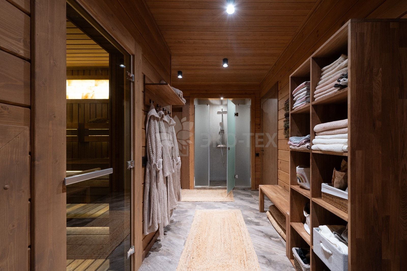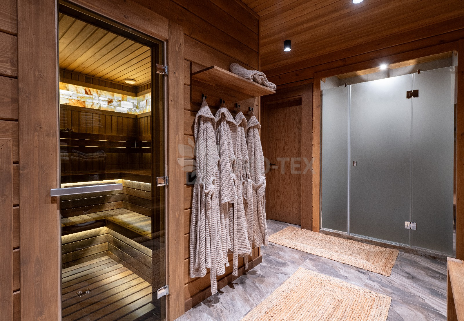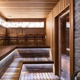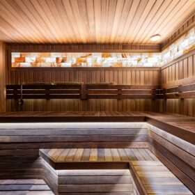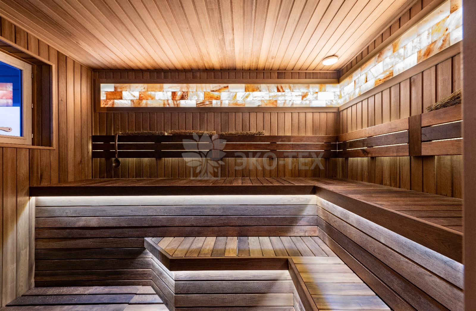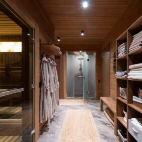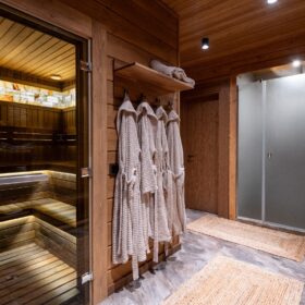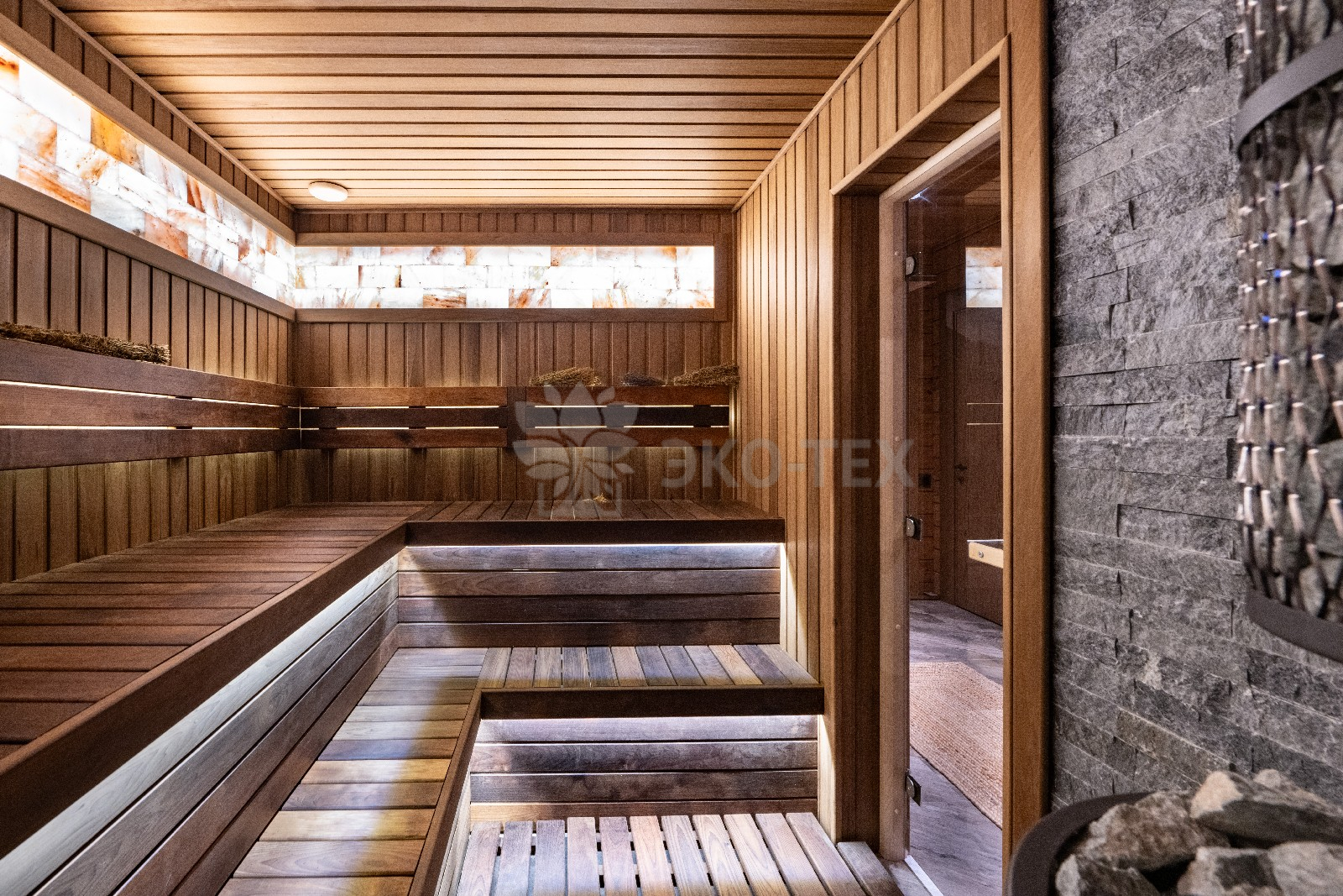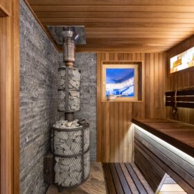 «Сердце» бани — парная обшита термодоской, благодаря чему поверхность на полках не нагревается, даже при высоких температурах. Широкие полки, стильная подсветка и вставки из гималайской соли придают парной, поистине, целебную атмосферу. Печь-каменка обеспечивает идеальный и быстрый прогрев, который оценят настоящие знатоки русской бани.