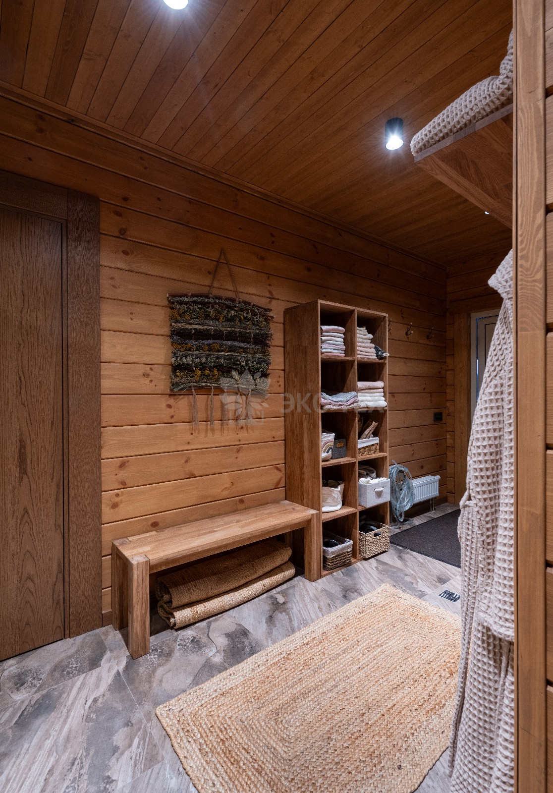Предбанник оснащен удобными полками для хранения необходимых принадлежностей и скамьей для отдыха.