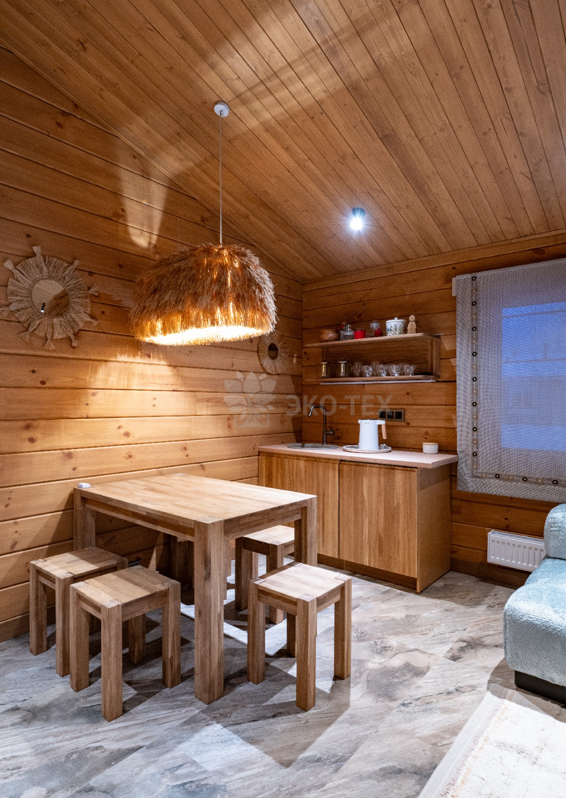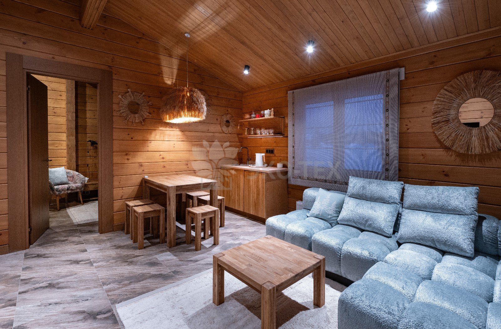 Кухня-гостиная наполнена уютной атмосферой и комфортом Натуральные материалы, стильный дизайн и удобные места для отдыха делают эту зону идеальным местом для встреч с друзьями и семьей. Вместимость комнаты позволяет комфортно разместиться компании до десяти человек. Атмосферу отдыха дополняет мягкое освещение, и конечно, неповторимая дизайнерская люстра.