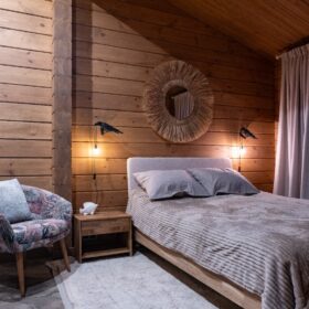 Спальня, оформленная в едином стиле с гостиной, станет вашим любимым уголком для тех, кто любит после банных процедур отдохнуть и набраться сил.
