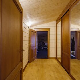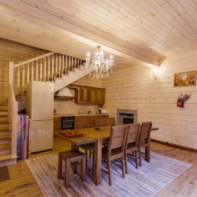 Что касается внутреннего обустройства помещений, то можно сказать, что здесь предусмотрено все условия, чтобы отдохнуть и восстановить силы. На первом это же, при входе расположилась столовая, которую с легкостью можно трансформировать в гостиную.