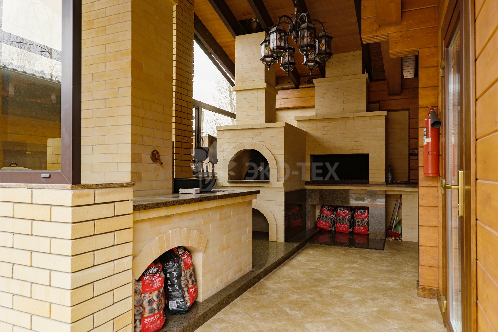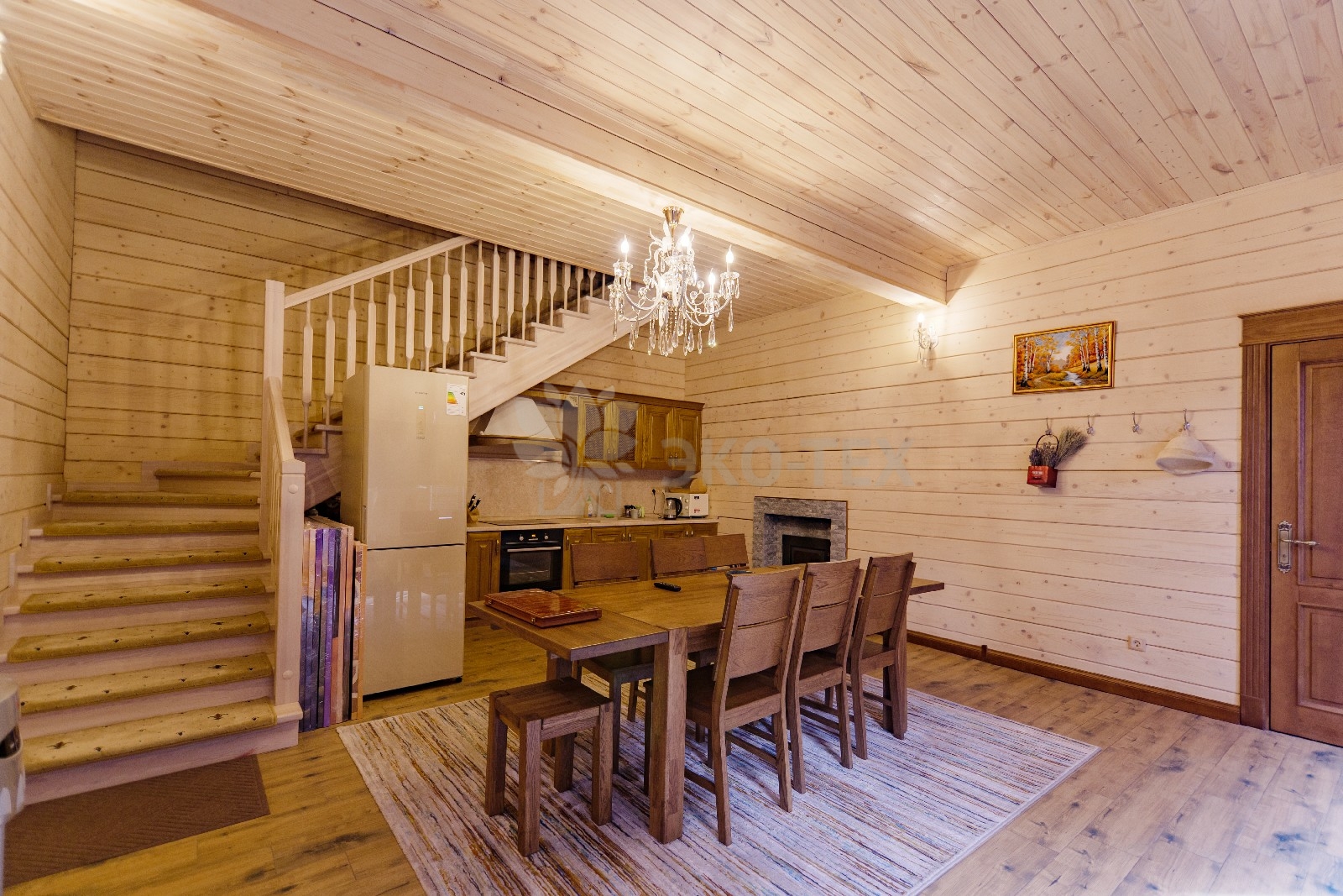 Максимально полезно задействована пространство под лестницей — здесь расположилась кухонная зона, настоящим украшением которой является камин. Очарование живого огня несравнимо ни с чем. Тёплые солнечные тона фасада мебели прекрасно естественные тона живого дерева. Интерьер продуман до мелочей — включая локальную подсветку и крючки для различных мелочей.