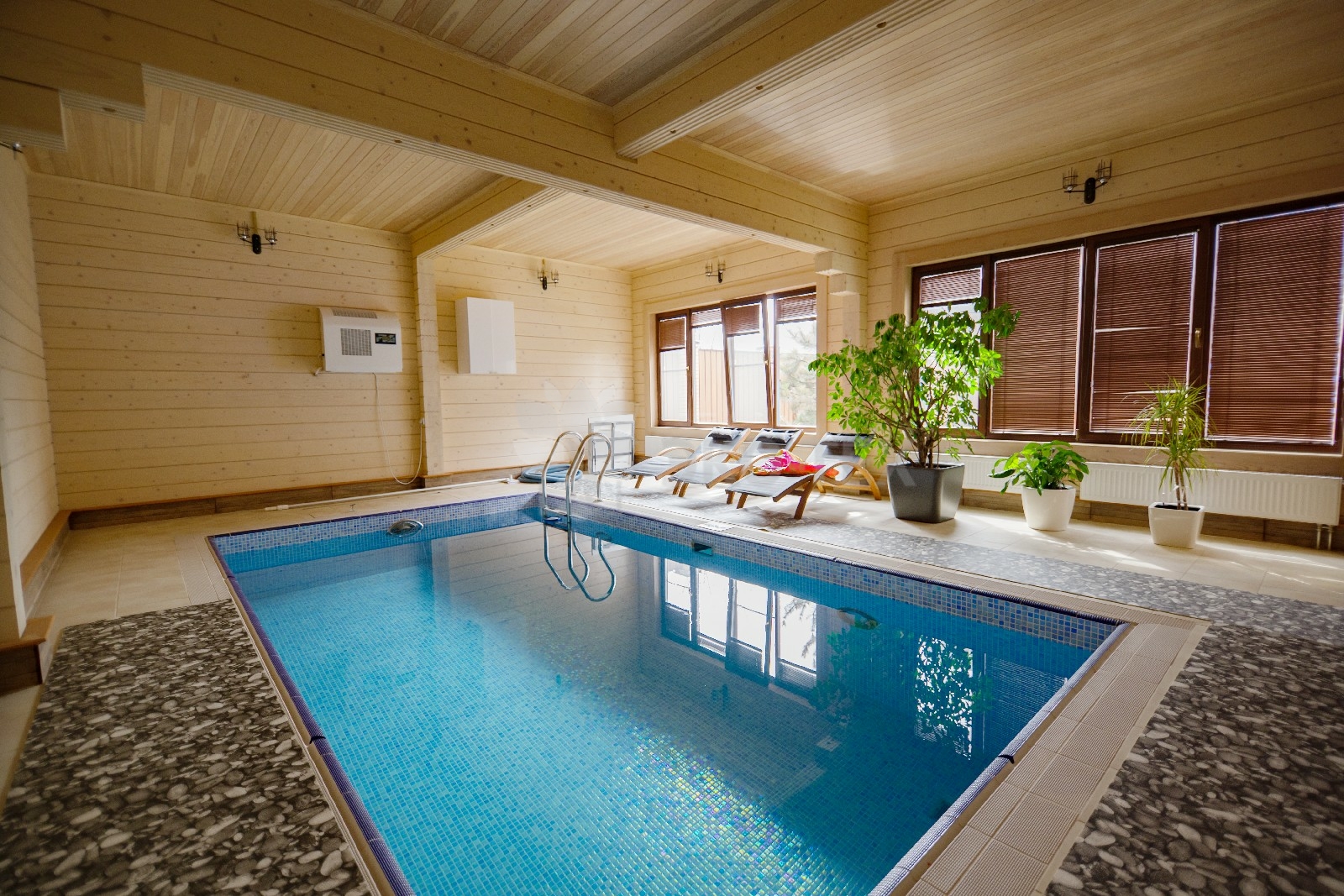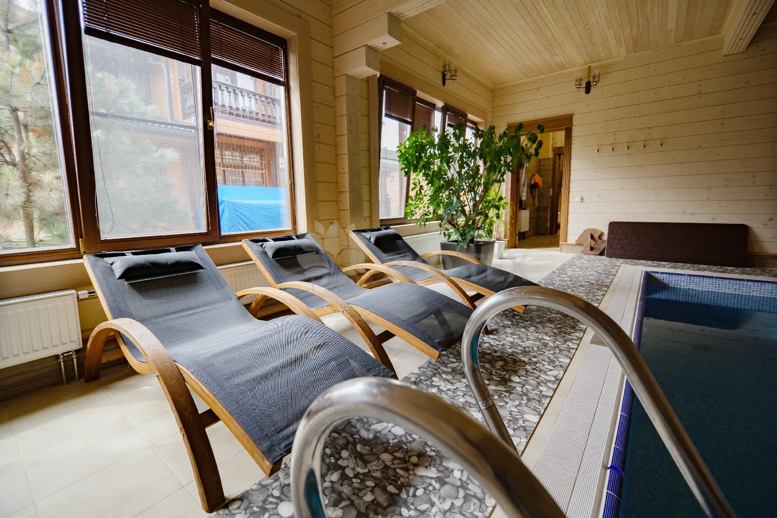 Переоценить удовольствие от купания в бассейне после банных процедур невозможно. Большие панорамные окна и льющийся свет дарят ощущение солнечного лета в любое время года.