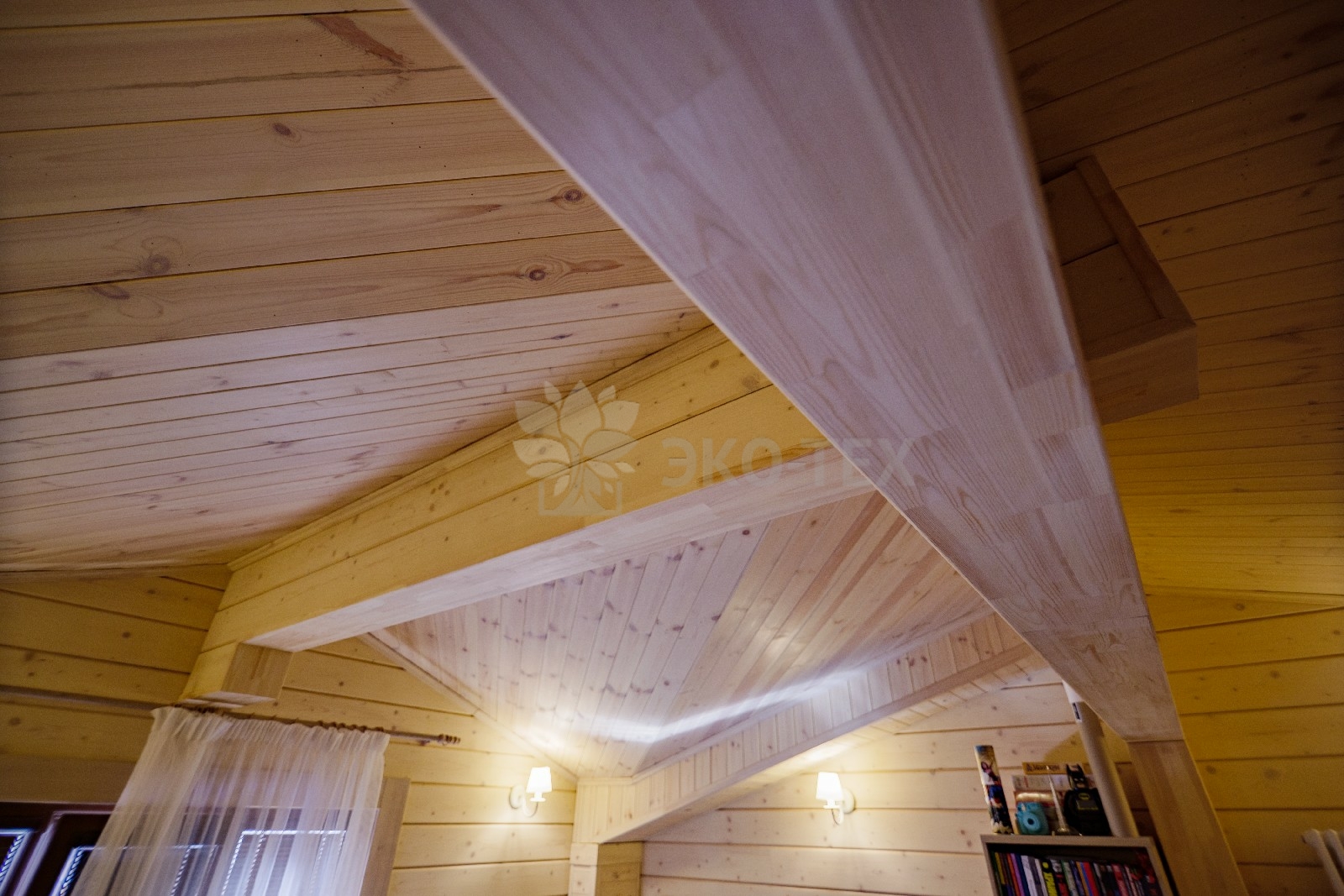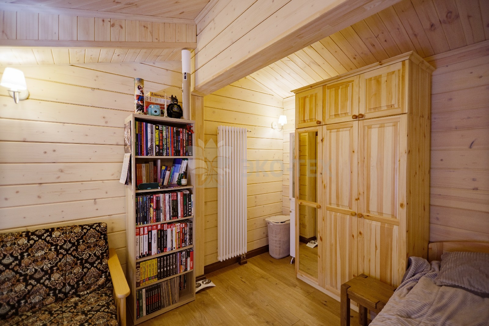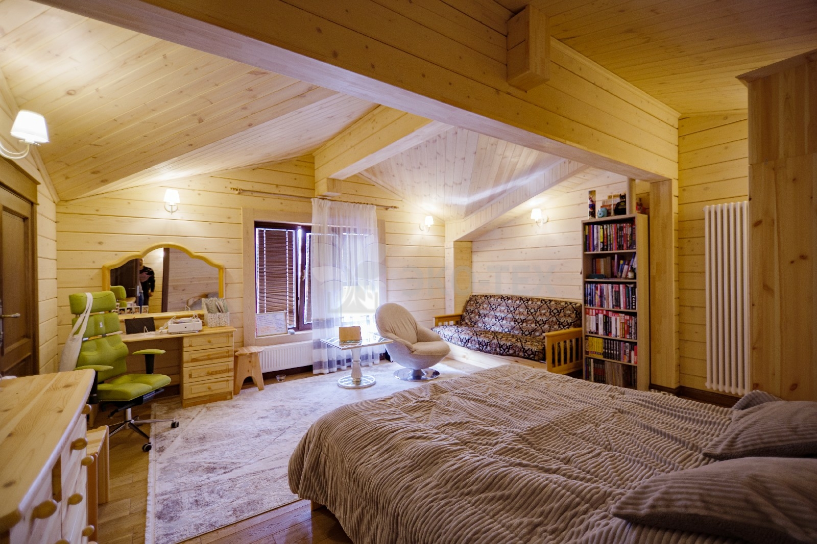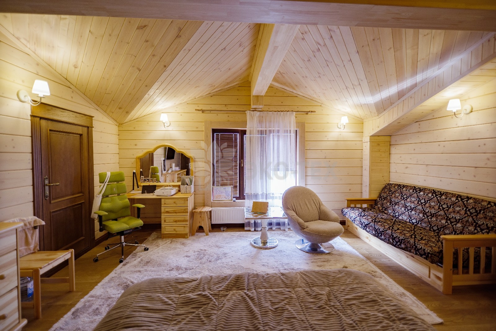 На втором этаже располагаются жилая комната, в которой есть всё необходимое как для работы, так и для отдыха и сна. Особую атмосферу ей придает необычная форма потолка, а также естественная отделка и тонкий аромат живого дерева.