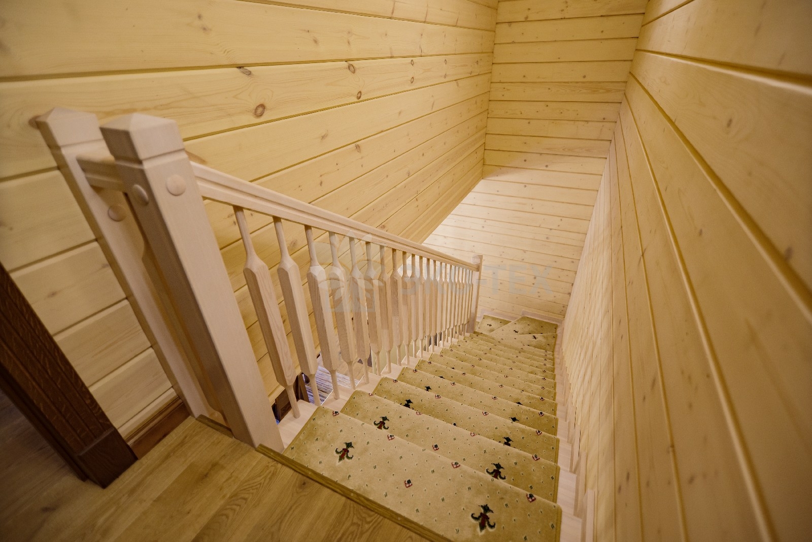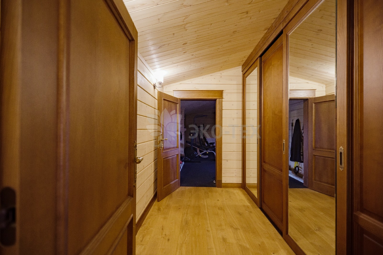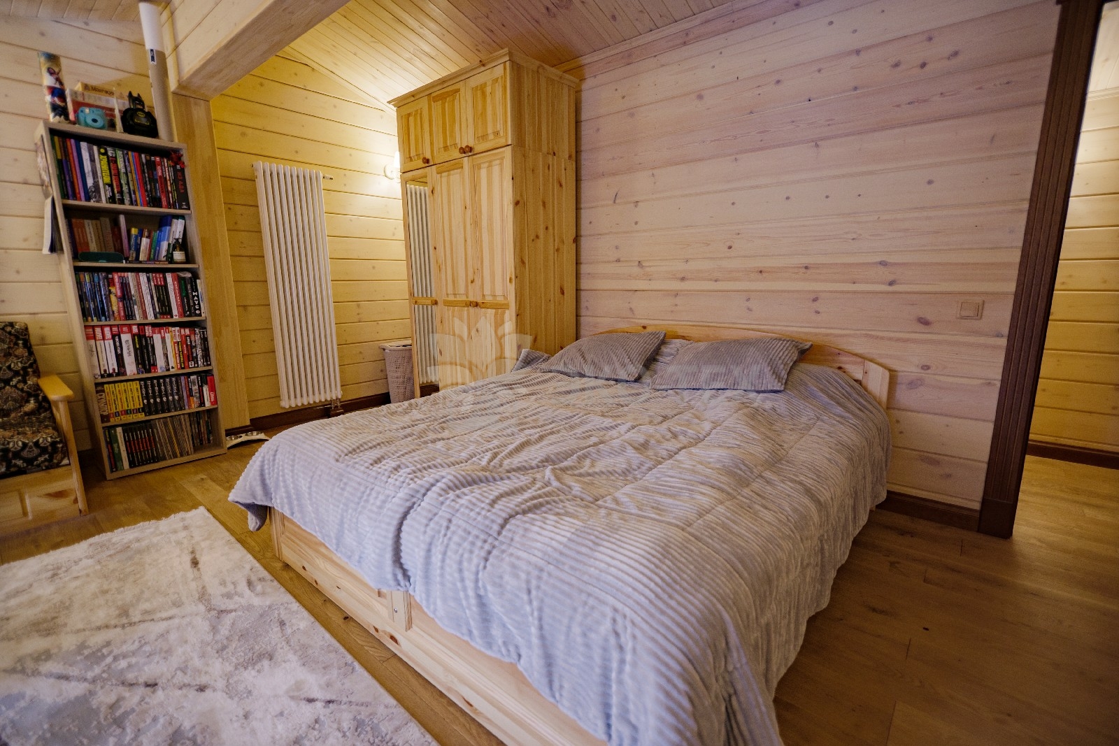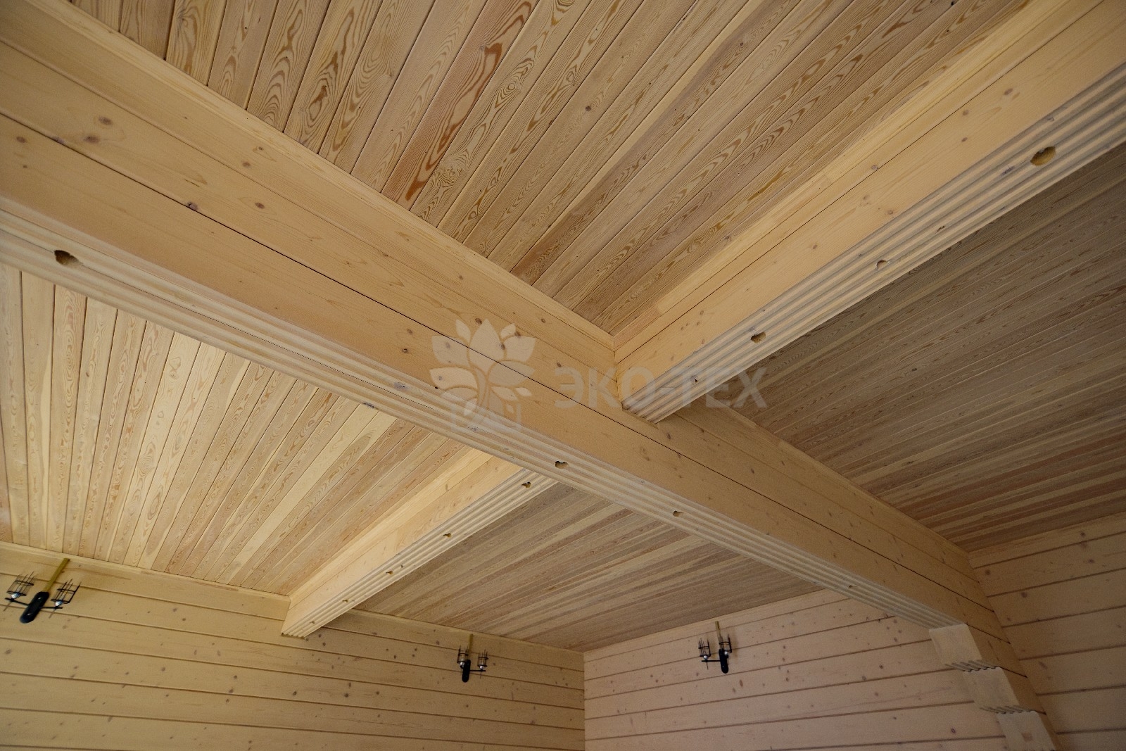 На втором этаже располагаются жилая комната, в которой есть всё необходимое как для работы, так и для отдыха и сна. Особую атмосферу ей придает необычная форма потолка, а также естественная отделка и тонкий аромат живого дерева.