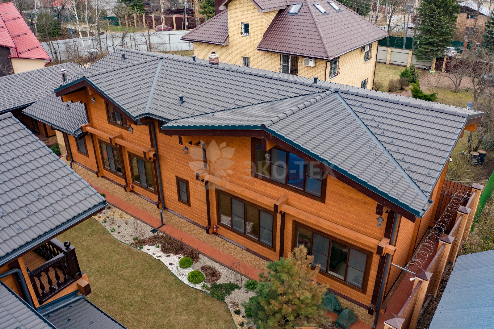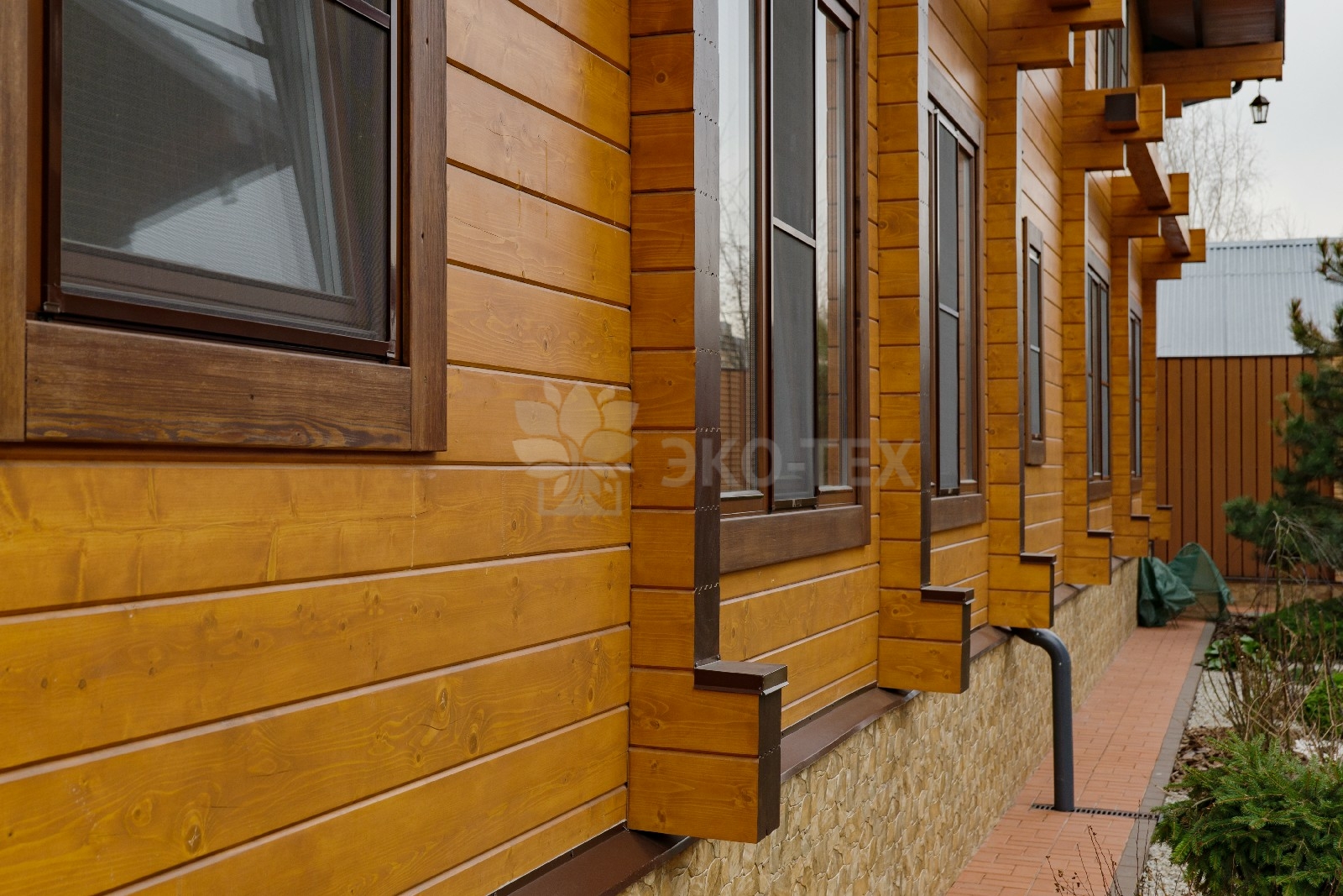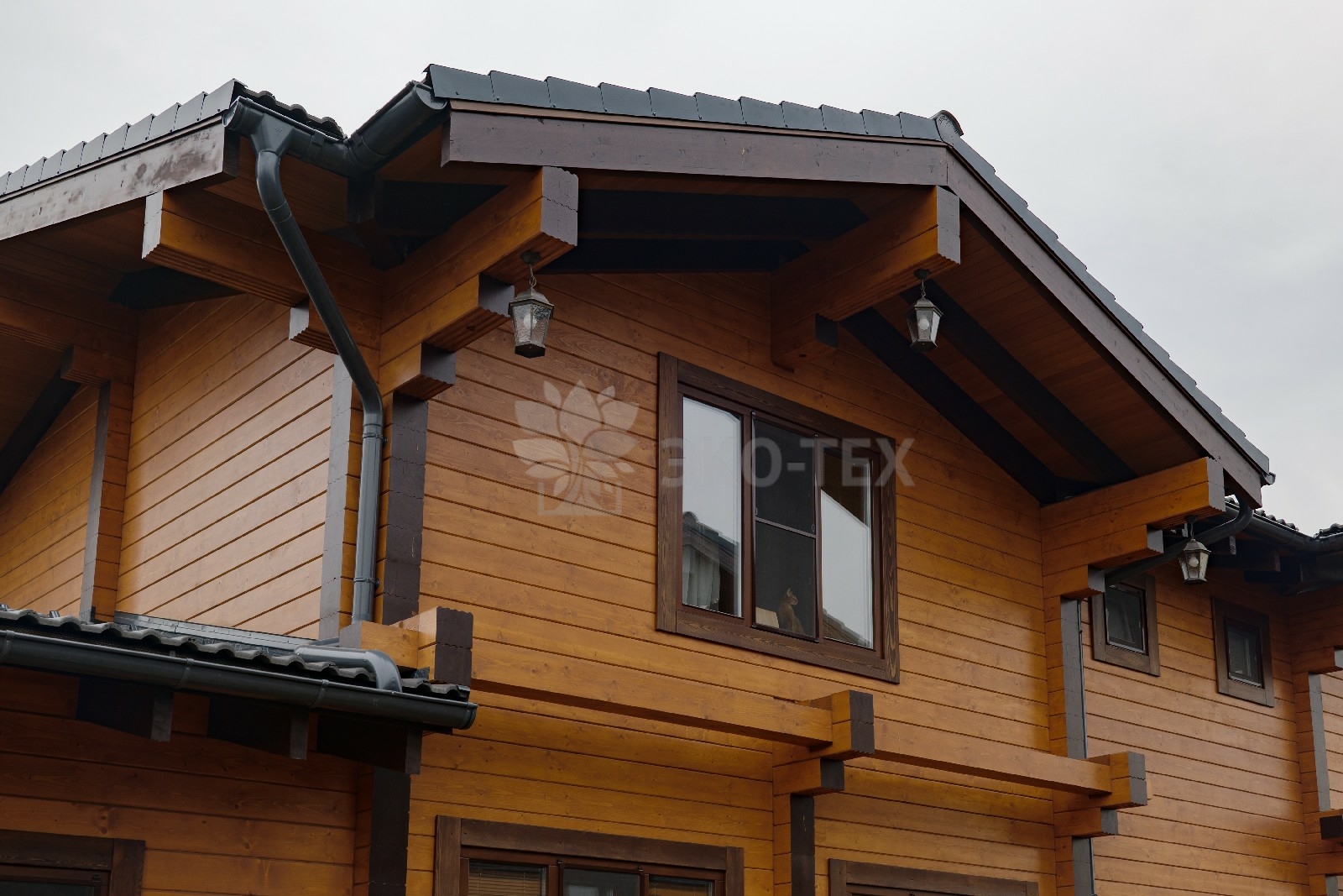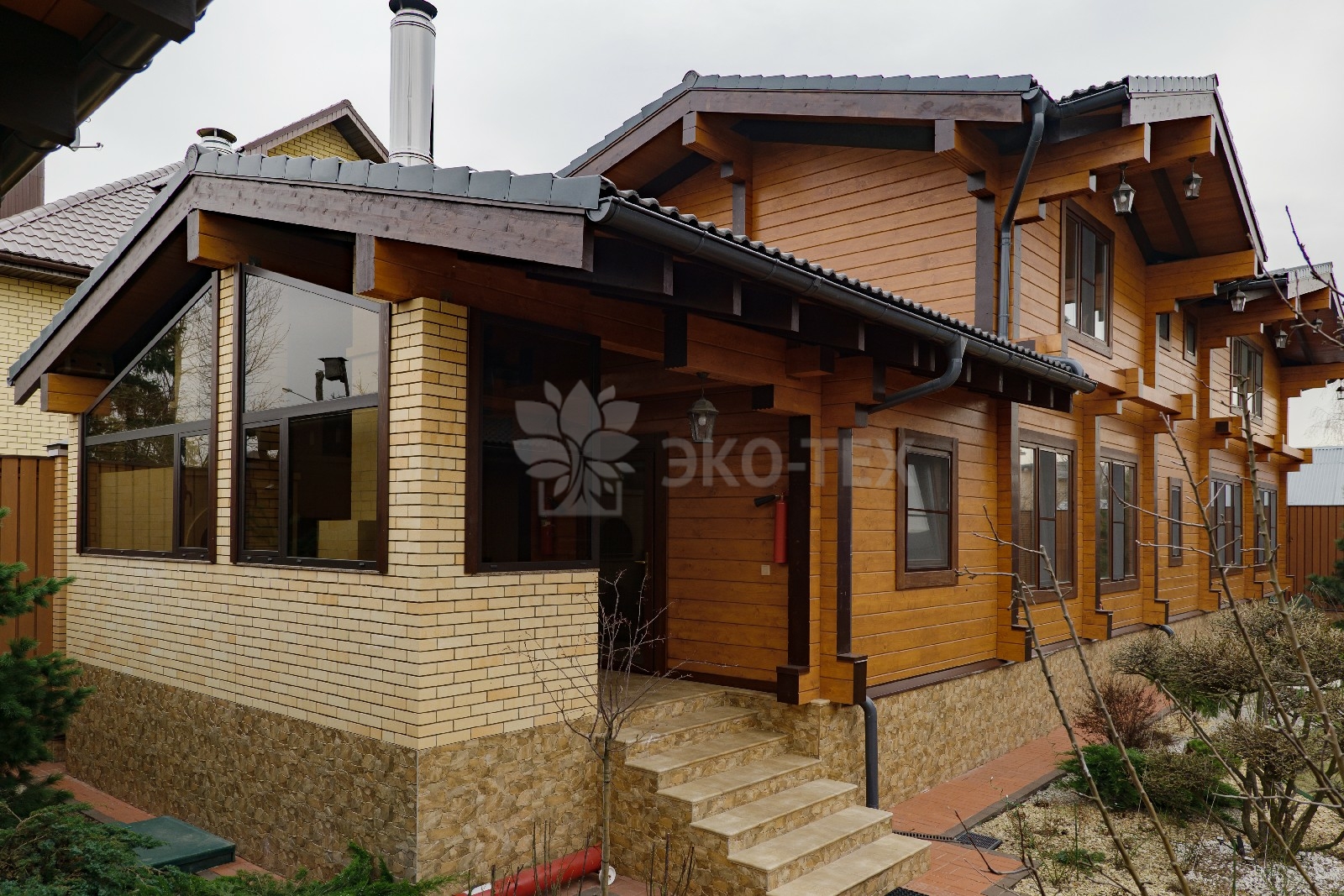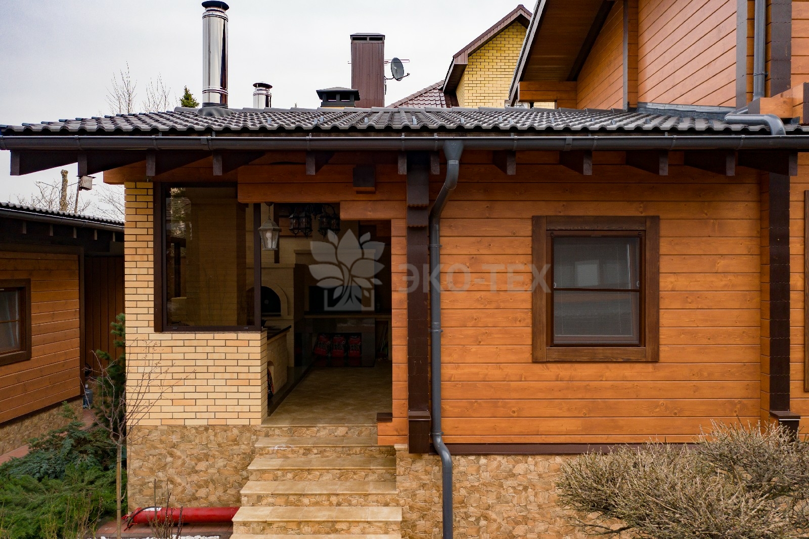 Удобное, широкое крыльцо, сочетание панорамного остекления с классическими окнами, продуманная система водостоков и формы крыши говорят о том, что проект был выполнен на самом высоком профессиональном уровне.