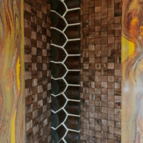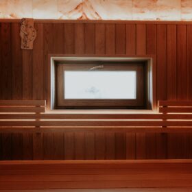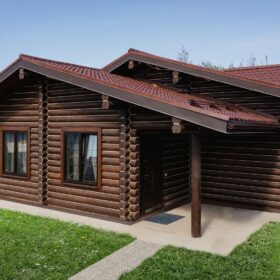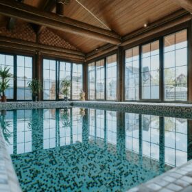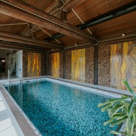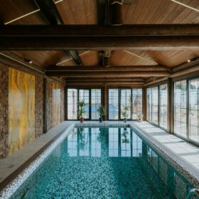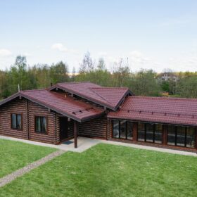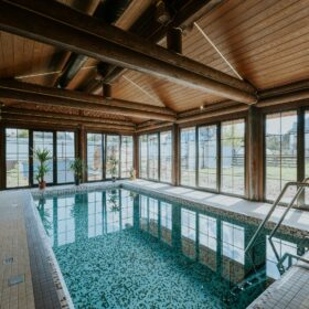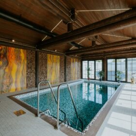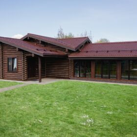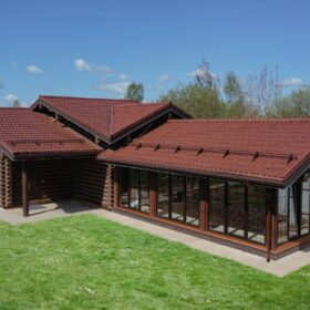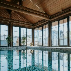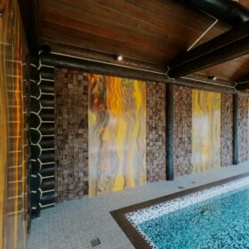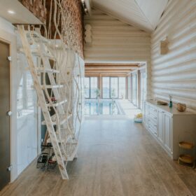 Внешне комплекс представляет собой сочетание классического деревянного сруба и панорамного остекления, сосредоточенного в зоне бассейна. Большая площадь окон создаёт ощущение природного водоёма, в котором всегда комфортно освежиться и снять усталость. Зеркальная поверхность воды, живые картины за окном дарят гармонию и умиротворение.