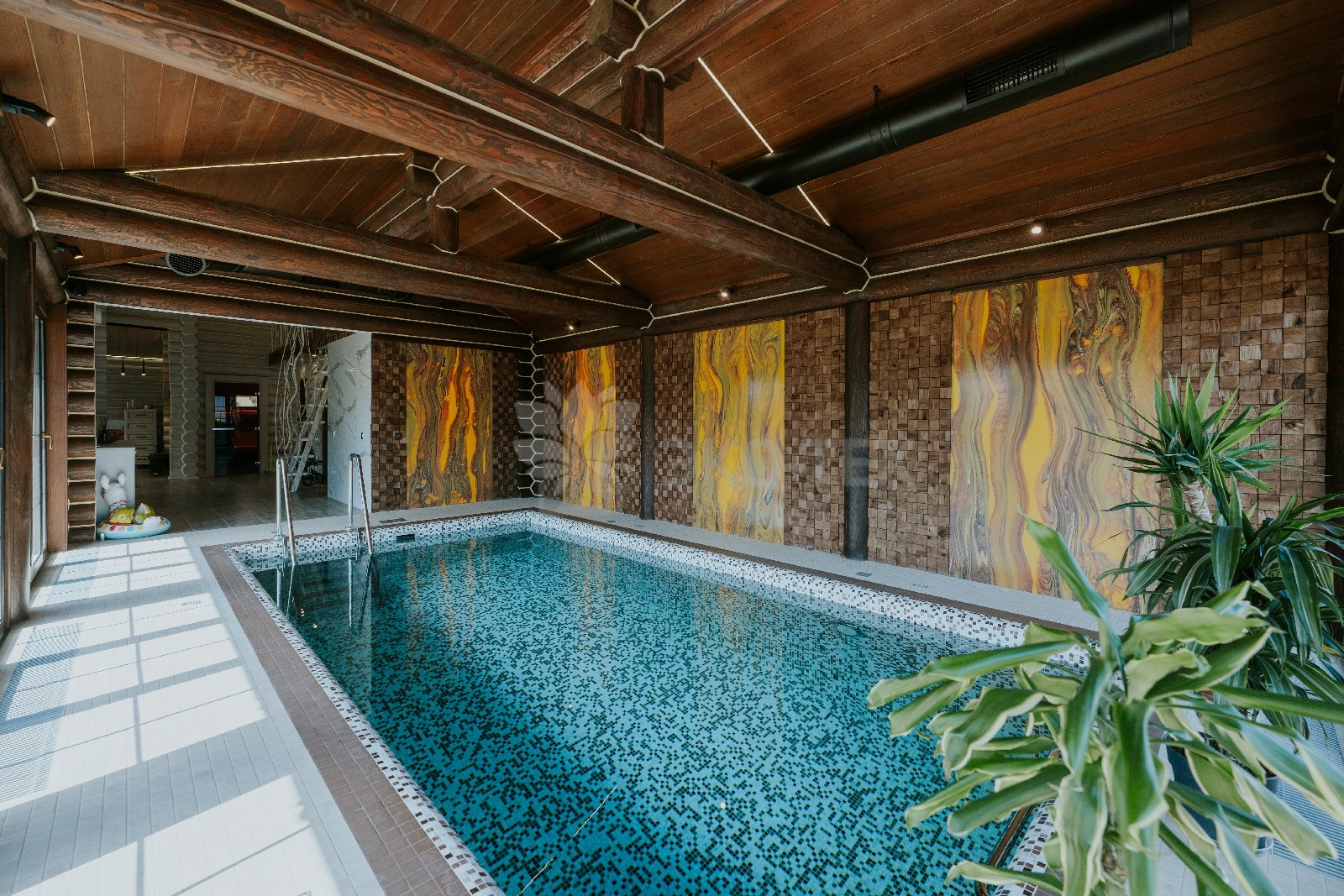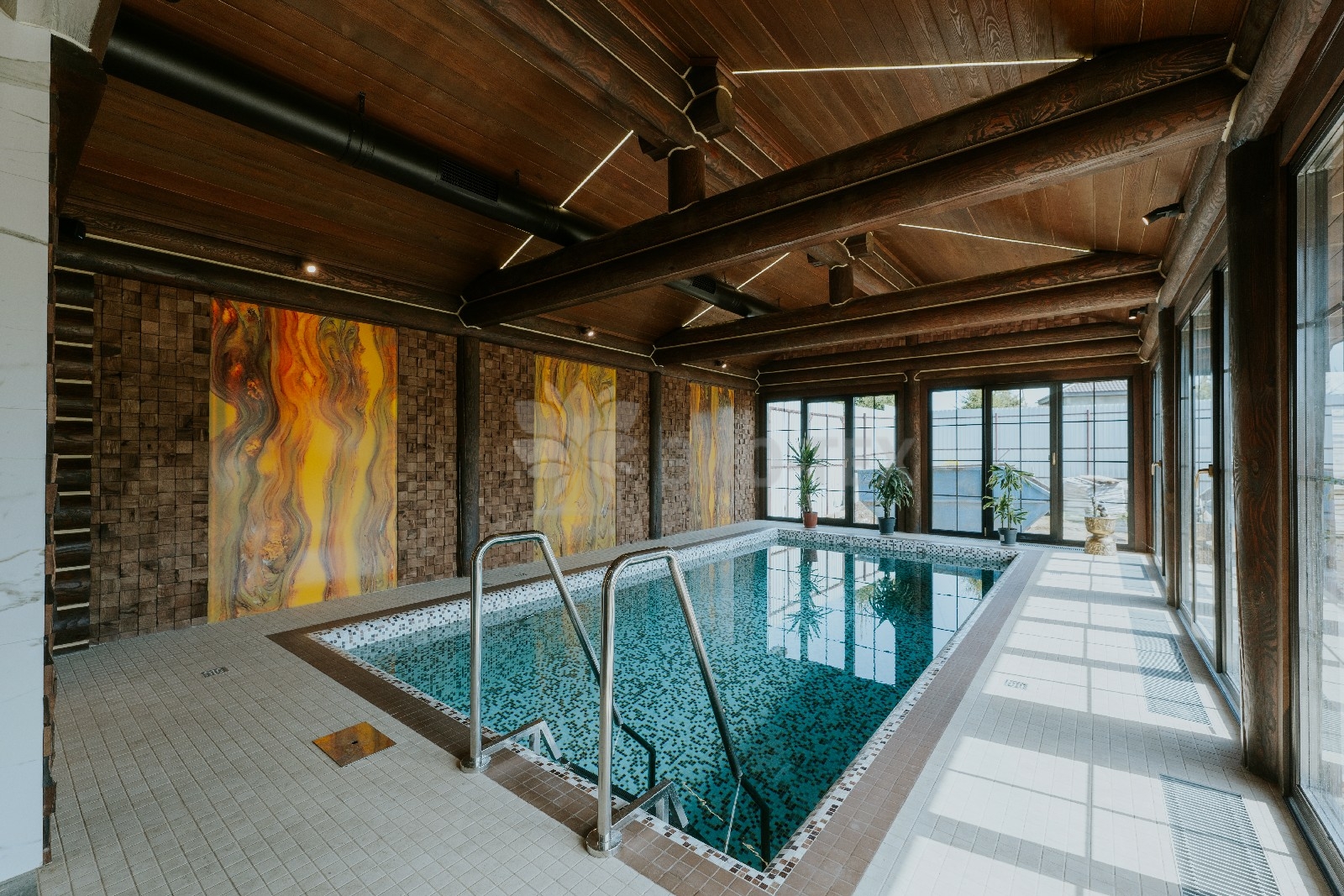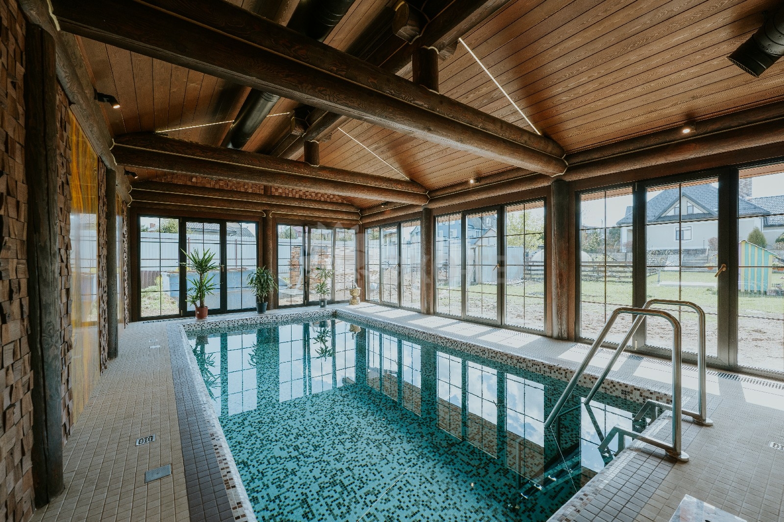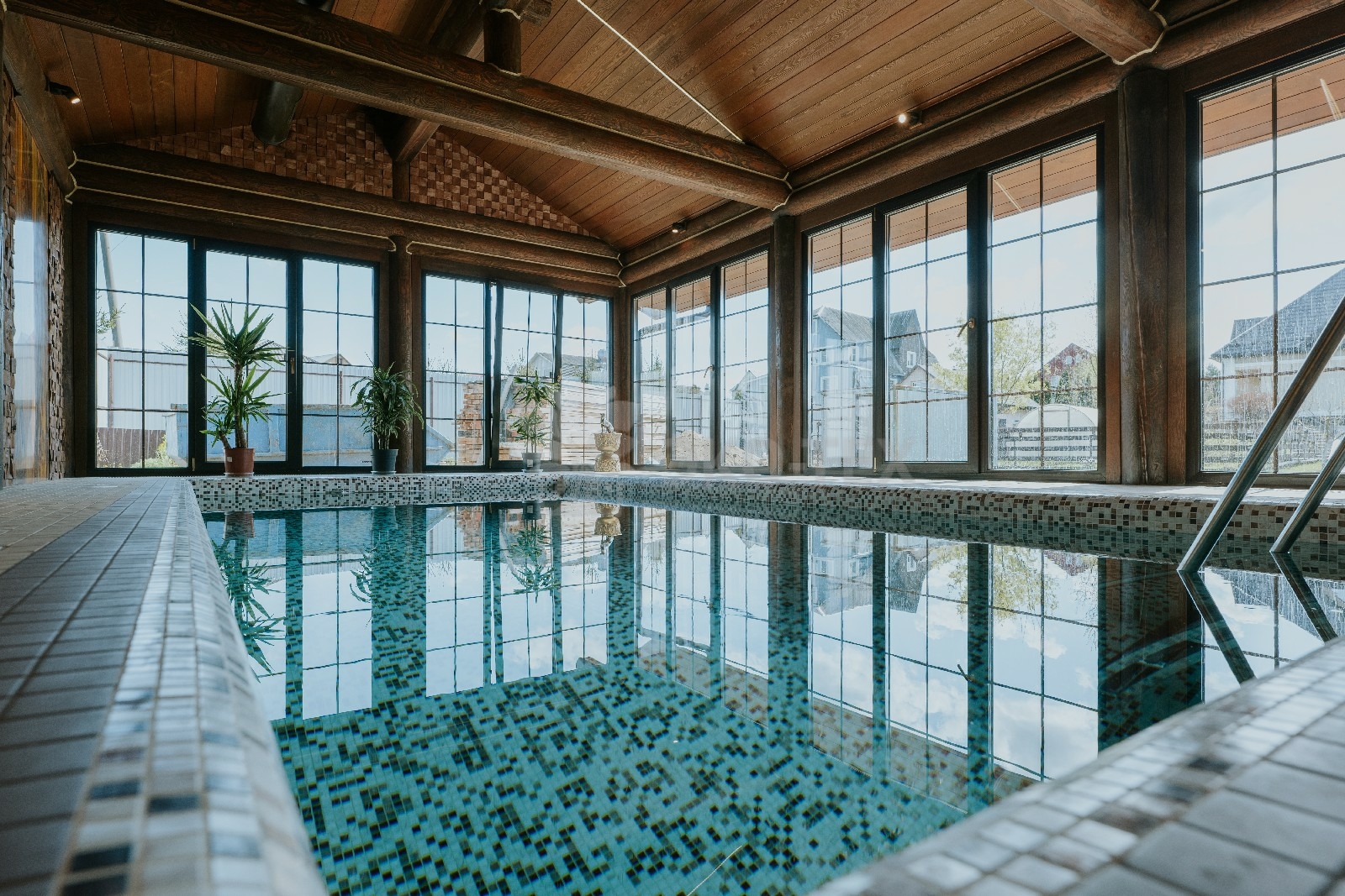 Внешне комплекс представляет собой сочетание классического деревянного сруба и панорамного остекления, сосредоточенного в зоне бассейна. Большая площадь окон создаёт ощущение природного водоёма, в котором всегда комфортно освежиться и снять усталость. Зеркальная поверхность воды, живые картины за окном дарят гармонию и умиротворение.