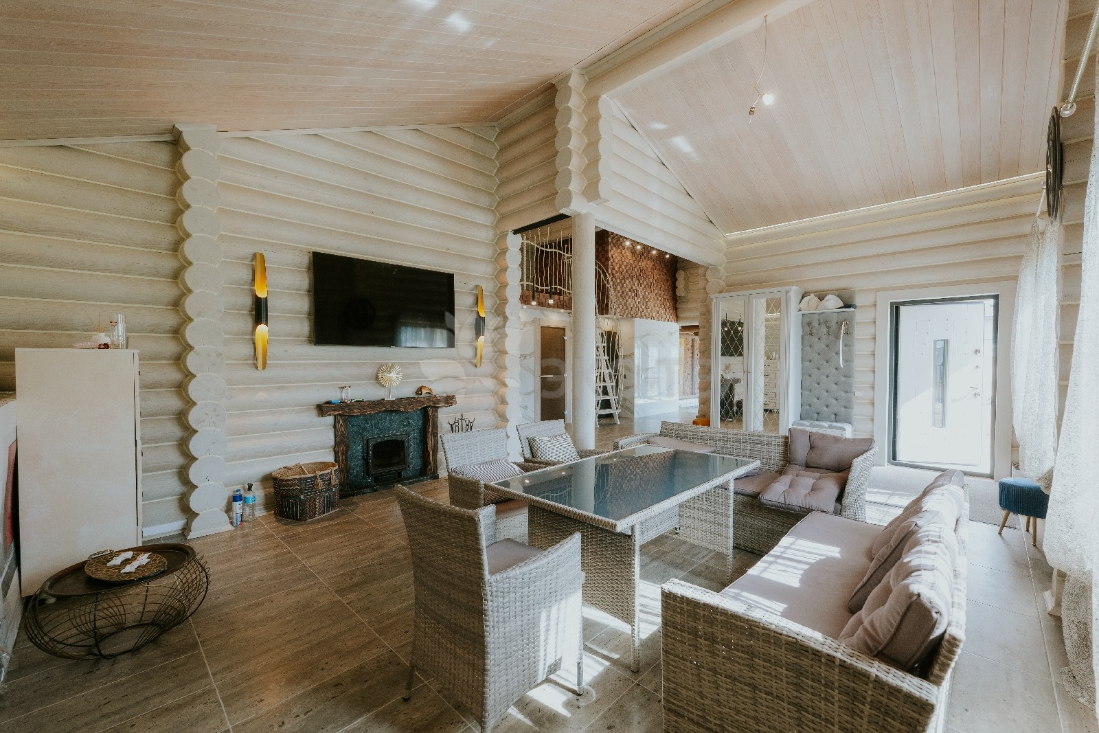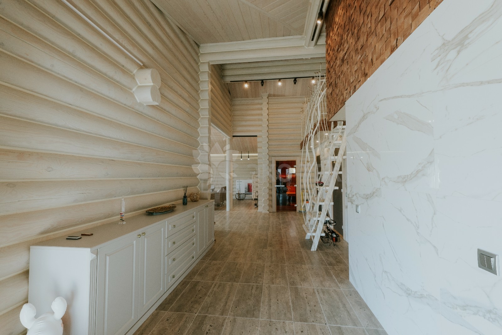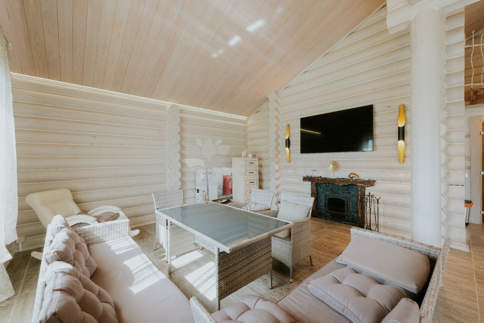 Комната отдыха является главным украшением банного комплекса. Здесь всё напоминает о роскоши и комфорте — каминная зона, изысканные светильники, необычная дизайнерская люстра, мягкий уголок и стулья, — всё здесь как бы приглашает отведать чашечку ароматного чая после банных процедур и повести неторопливую беседу, а разговором время летит так незаметно!