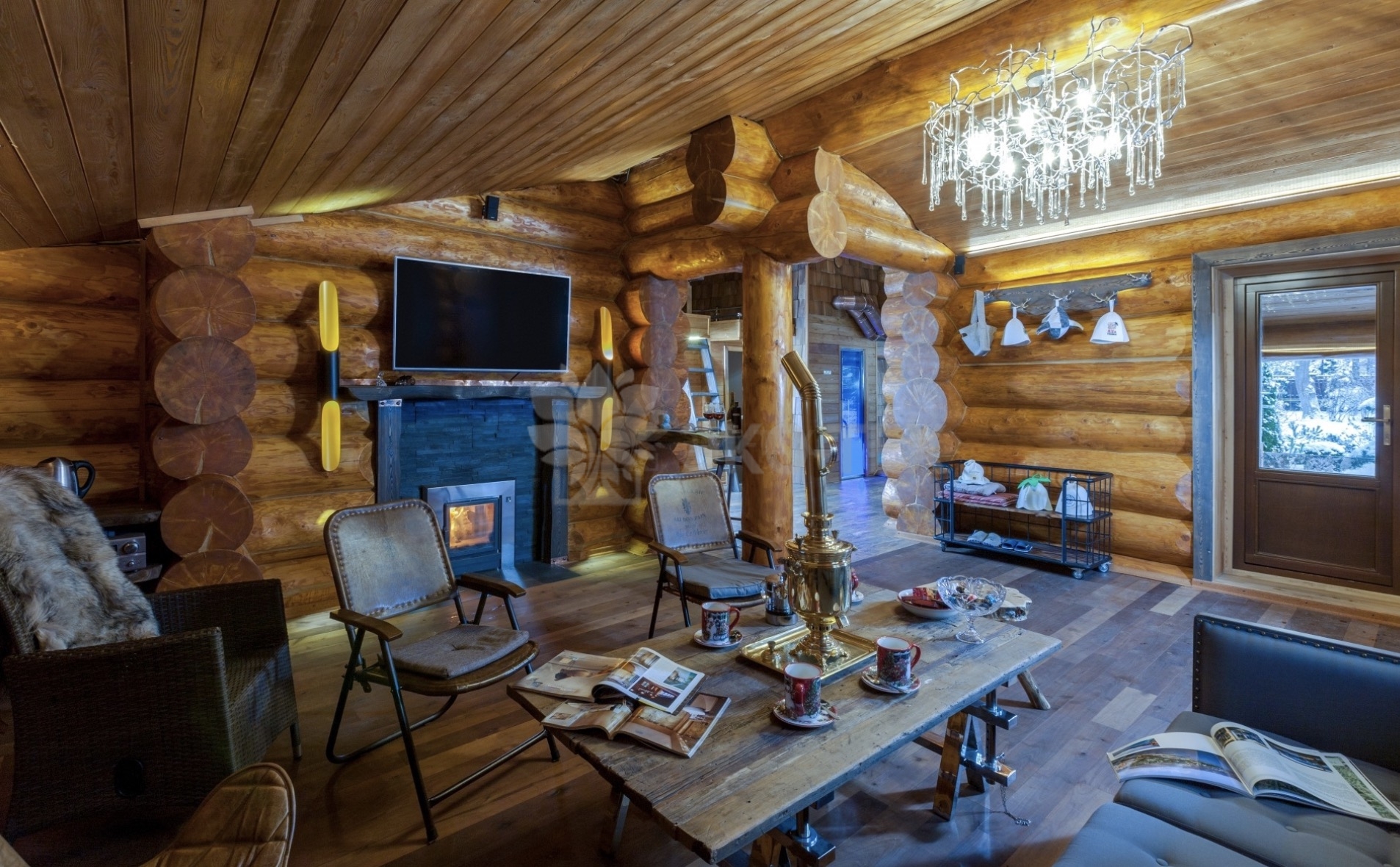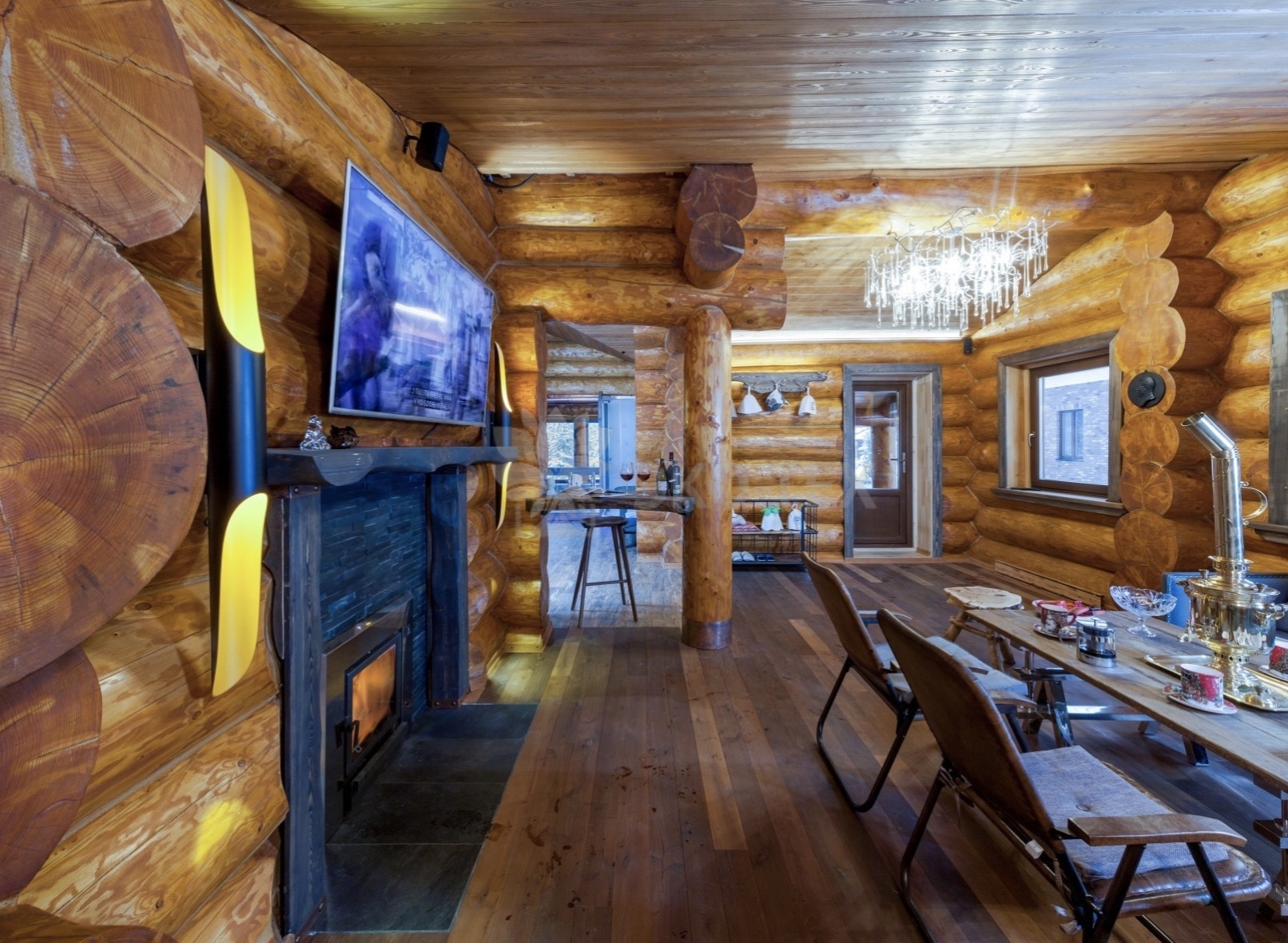 Во внутренней отделке максимально сохранили естественную красоту натурального дерева. В помещениях с повышенной влажностью использовали плитку. Мебель и предметы интерьера выбраны из массива.
