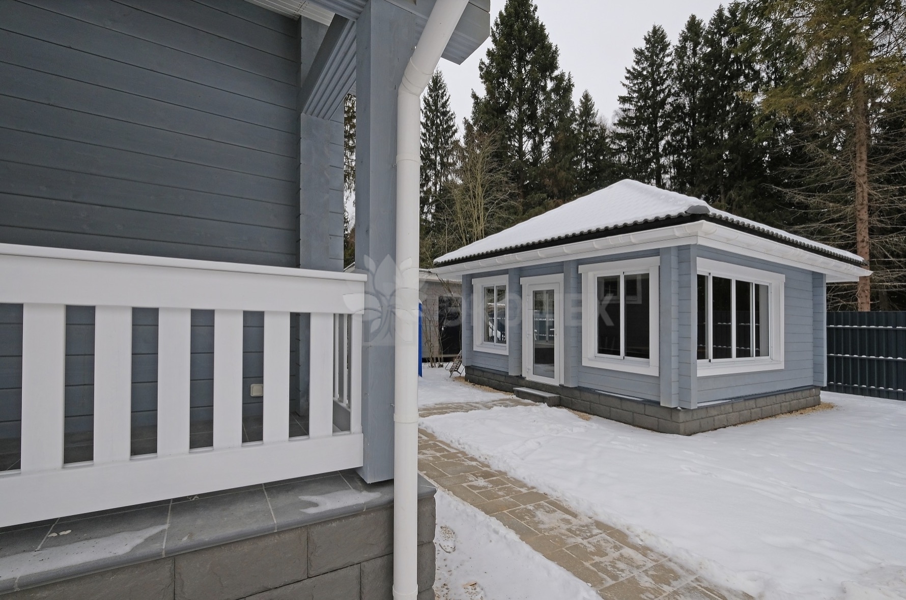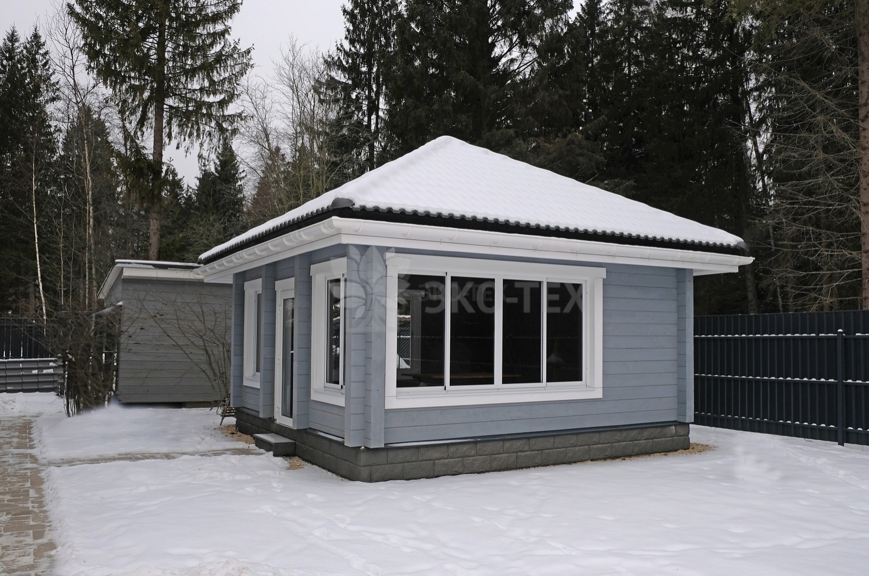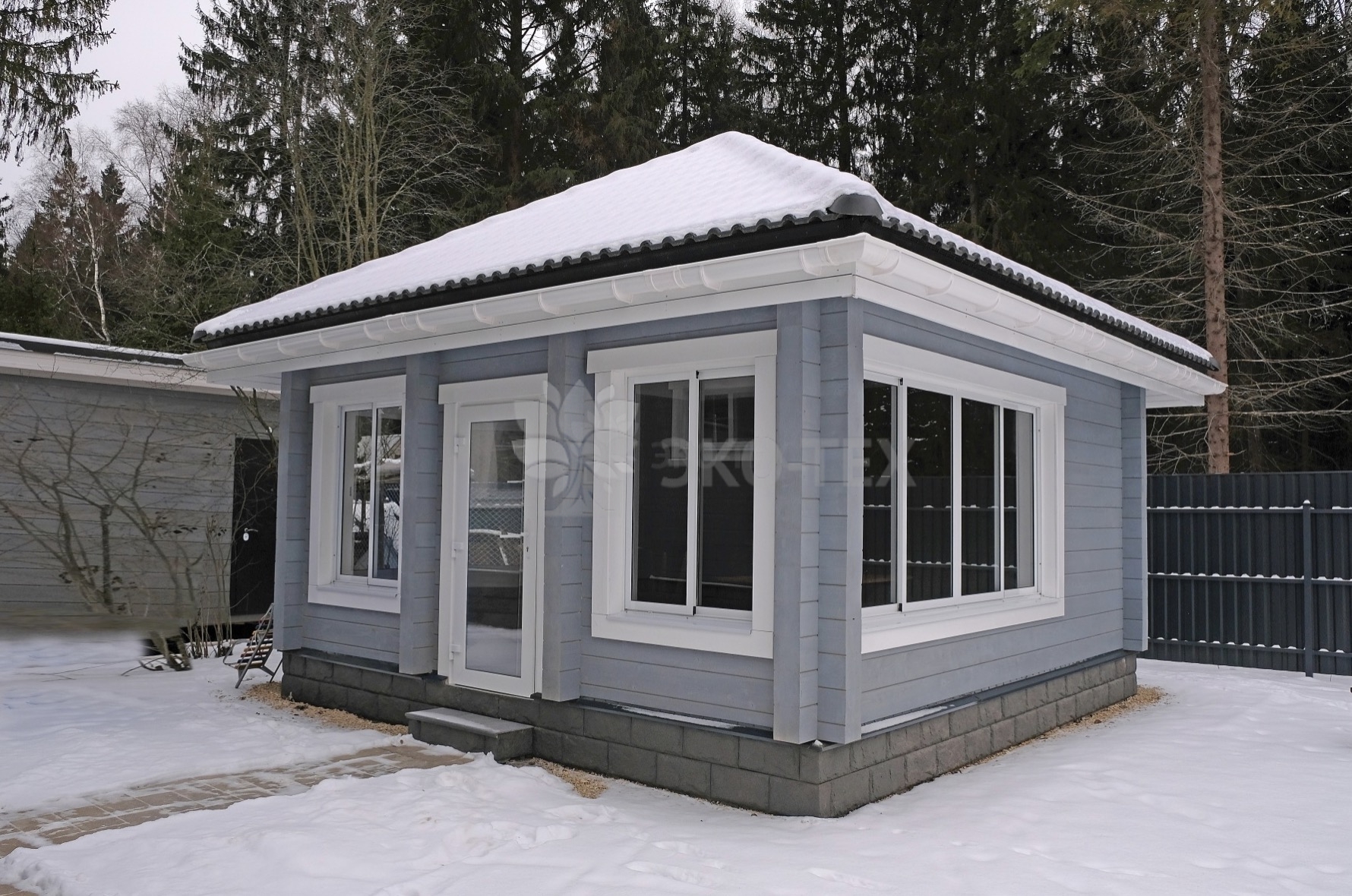 Закрытая конструкция, как и дом, требует надежного основания – фундамента. После сборки стен смонтировали крышу, установили окна, входную дверь. Внешняя отделка такая же, как и у рядом стоящего дома.