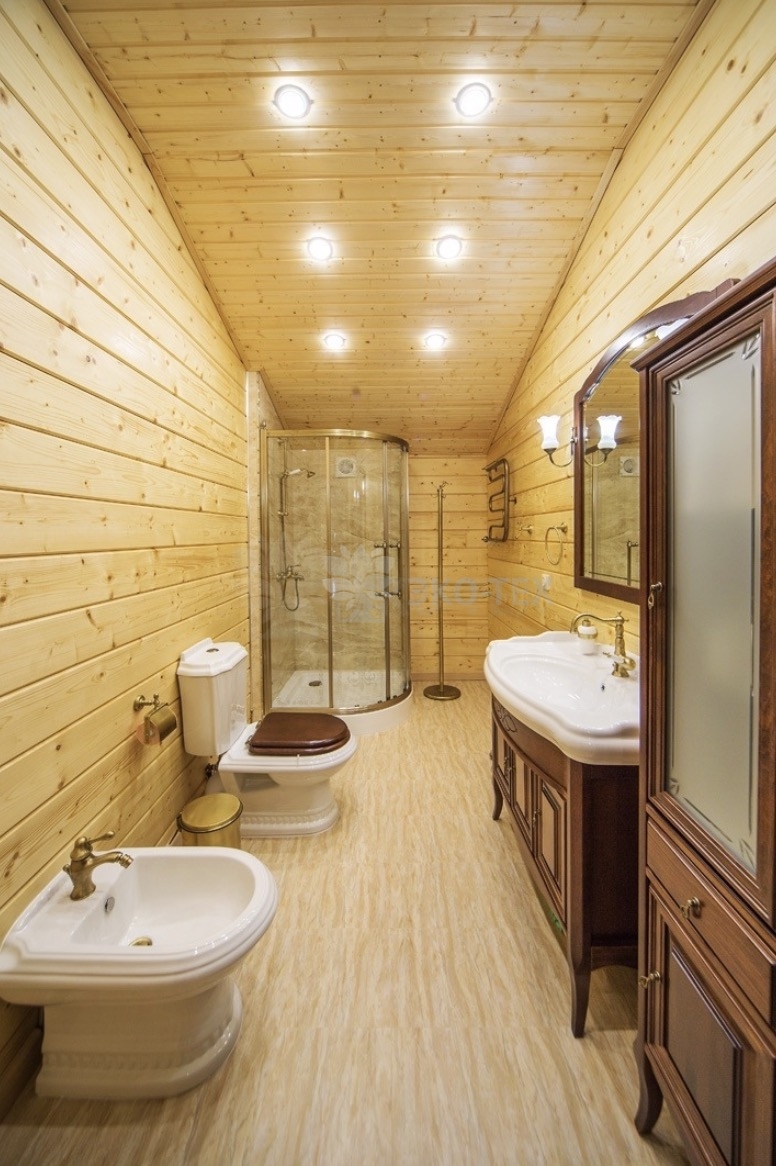 Внутри отдано предпочтение светлой отделке, которая зрительно увеличивает пространство. В мебели преобладает классический стиль с характерными декоративными элементами.