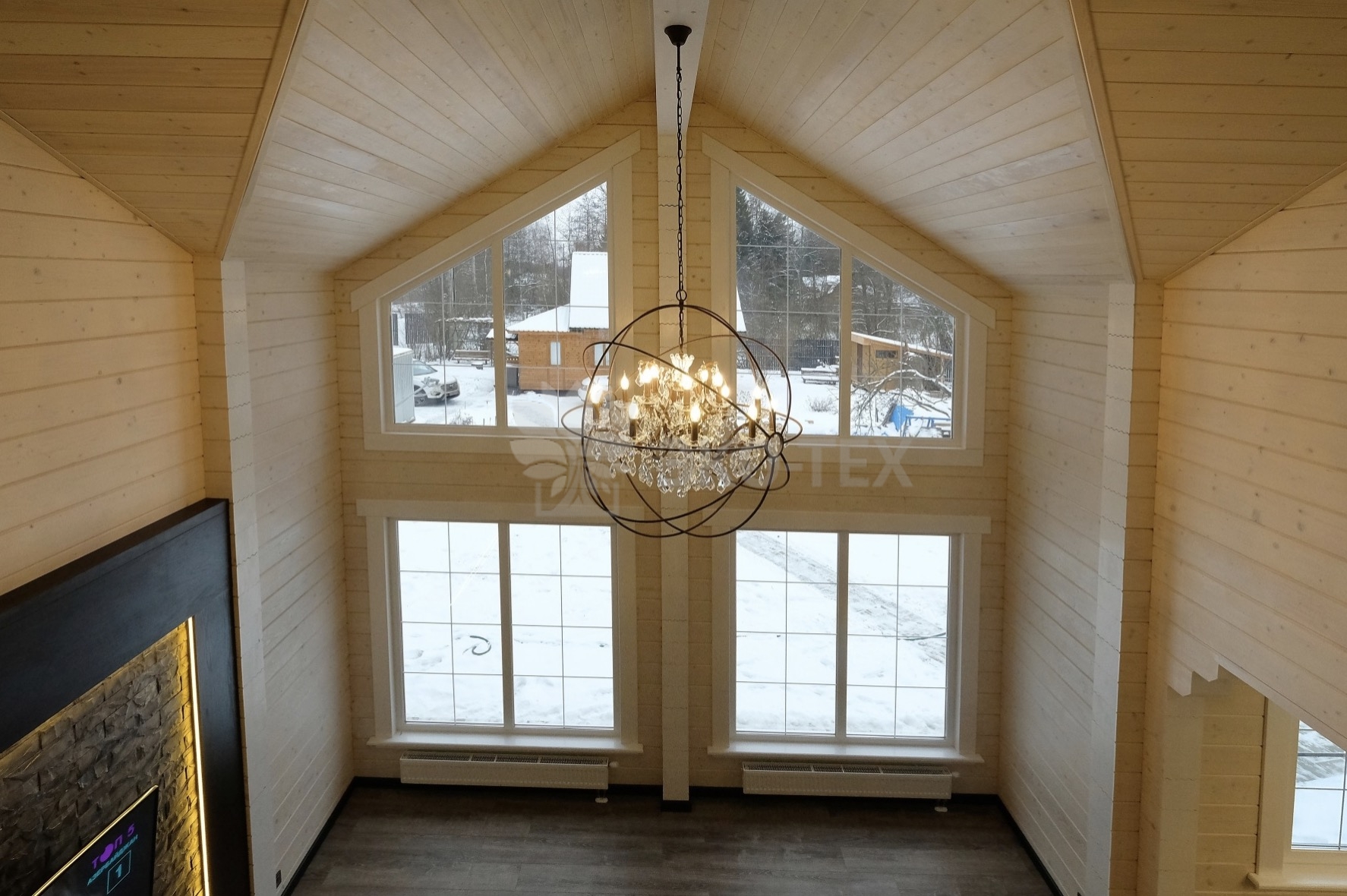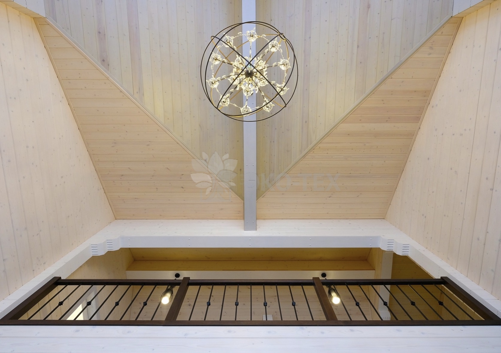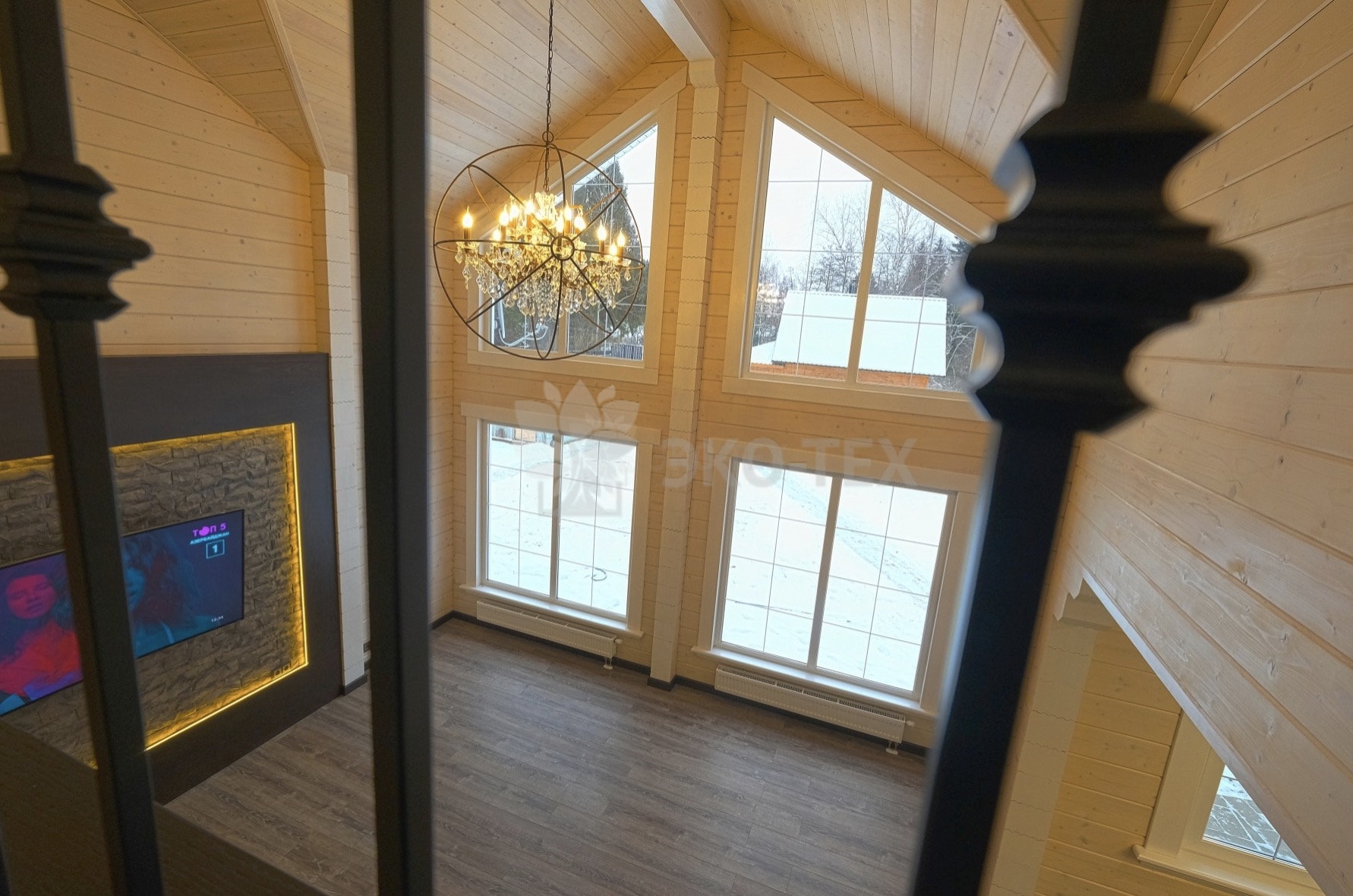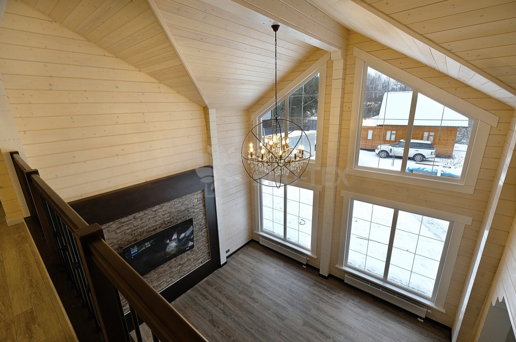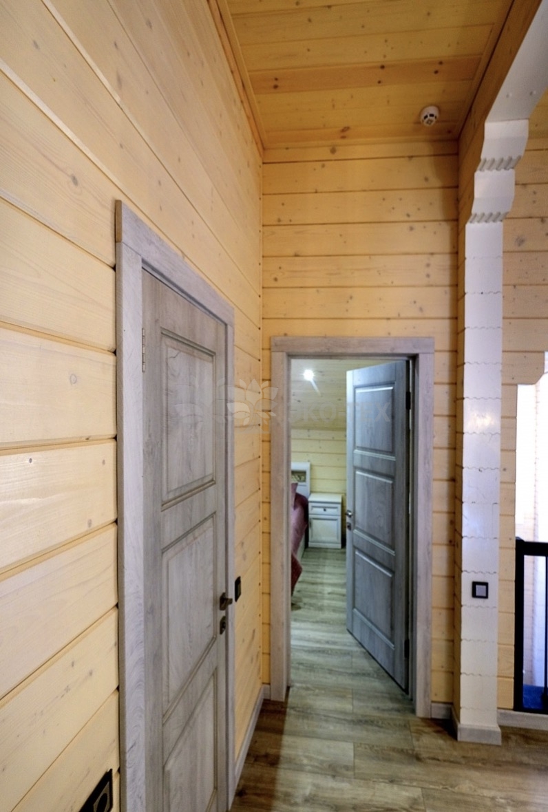 Второй этаж занимают 4 спальни, санузел и галереи. С галереи открывается роскошный вид на пейзаж на панорамными окнами. Внутри дома – светлая отделка, сохраняющая рисунок дерева. Совмещенные санузлы облицованы плиткой. Мебель выбрана в классическом и современном стиле, из массива, ЛДСП, МДФ.