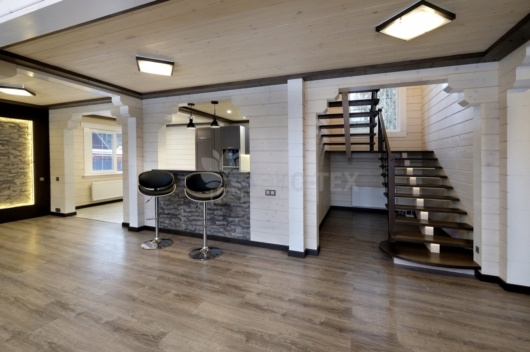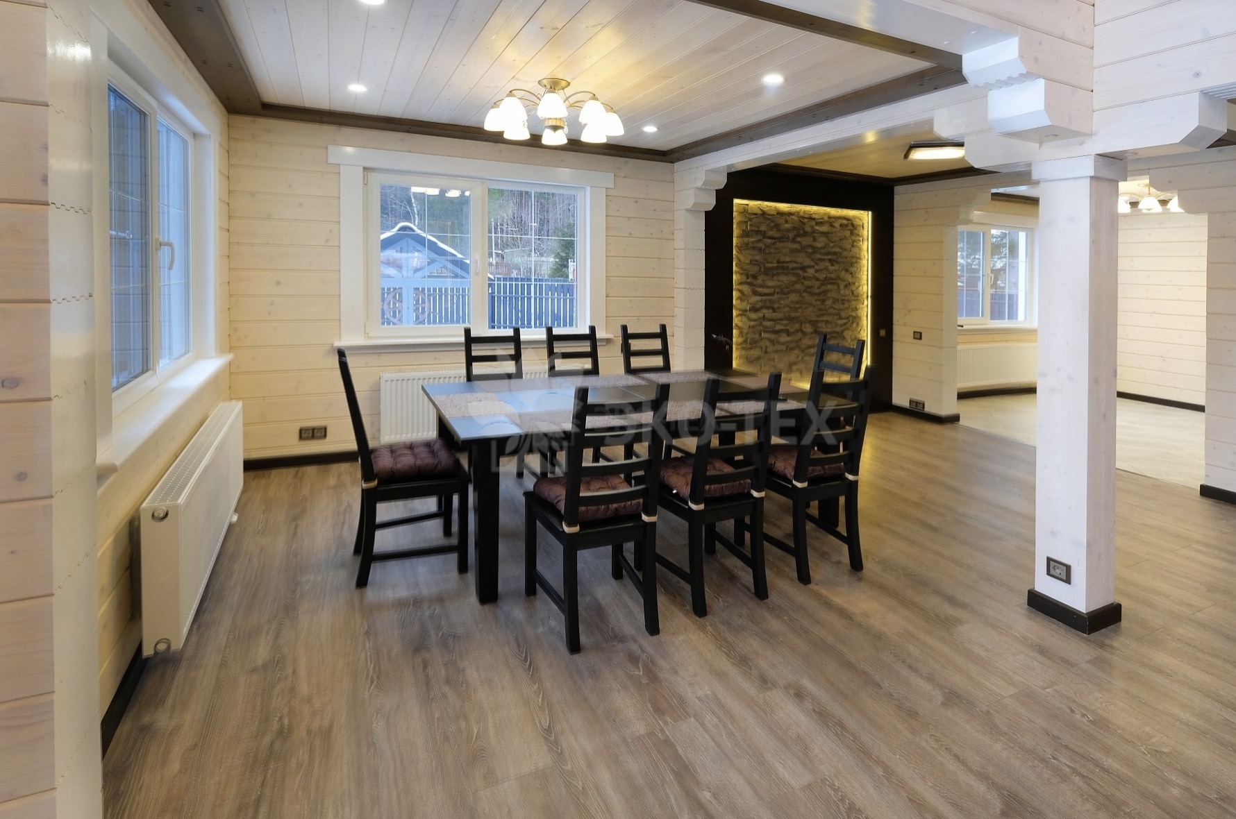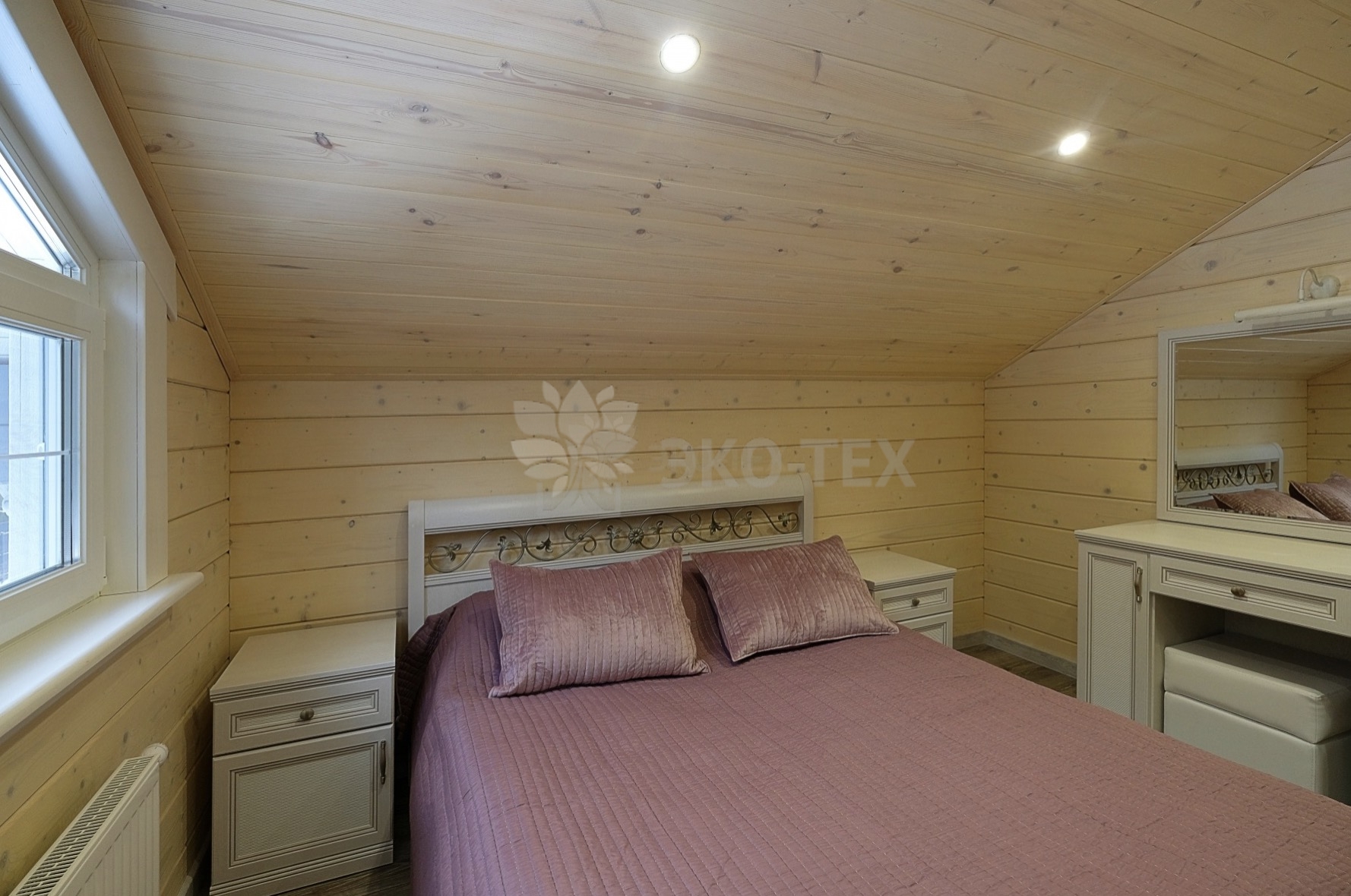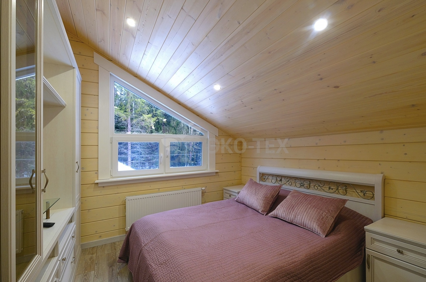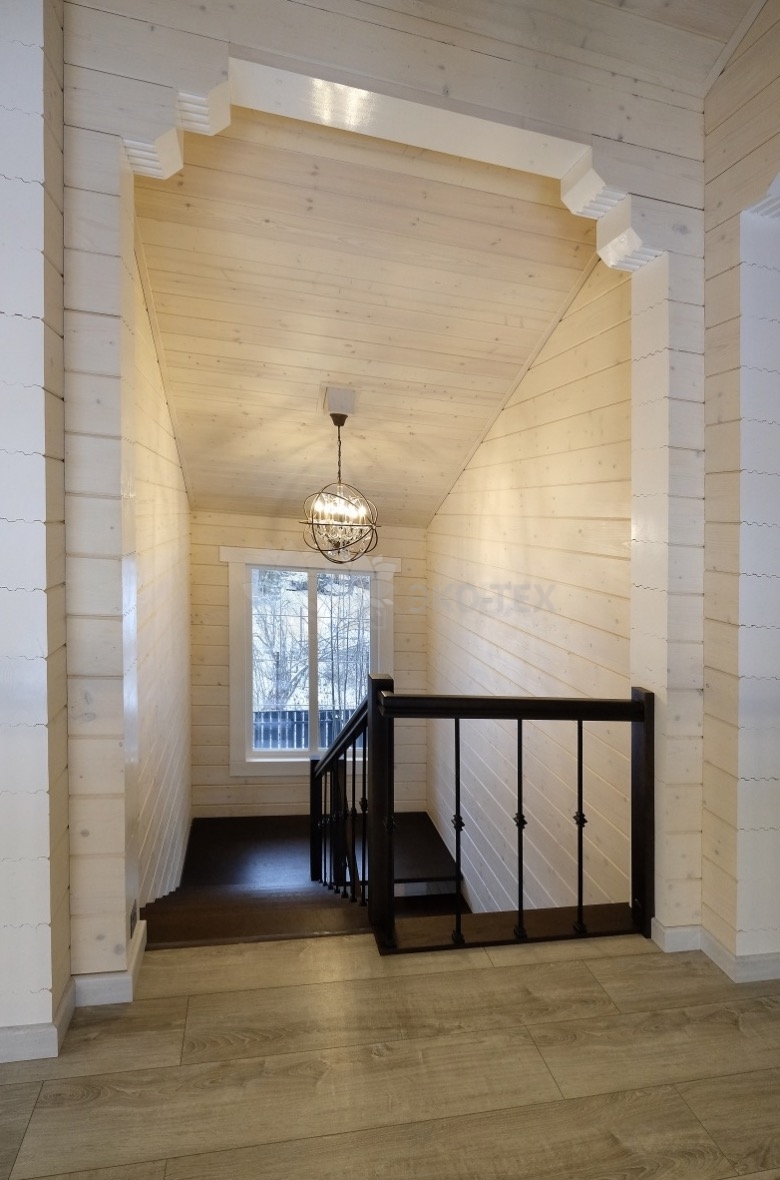 Второй этаж занимают 4 спальни, санузел и галереи. С галереи открывается роскошный вид на пейзаж на панорамными окнами. Внутри дома – светлая отделка, сохраняющая рисунок дерева. Совмещенные санузлы облицованы плиткой. Мебель выбрана в классическом и современном стиле, из массива, ЛДСП, МДФ.