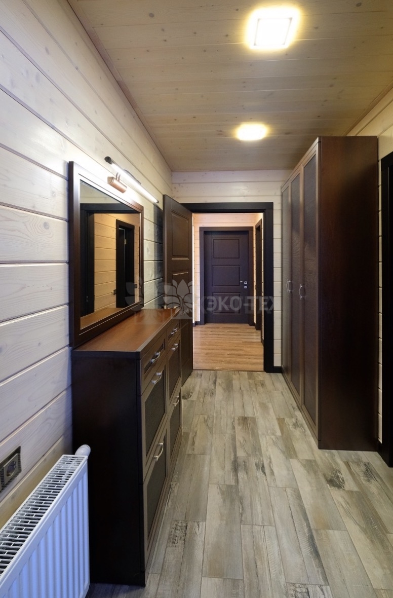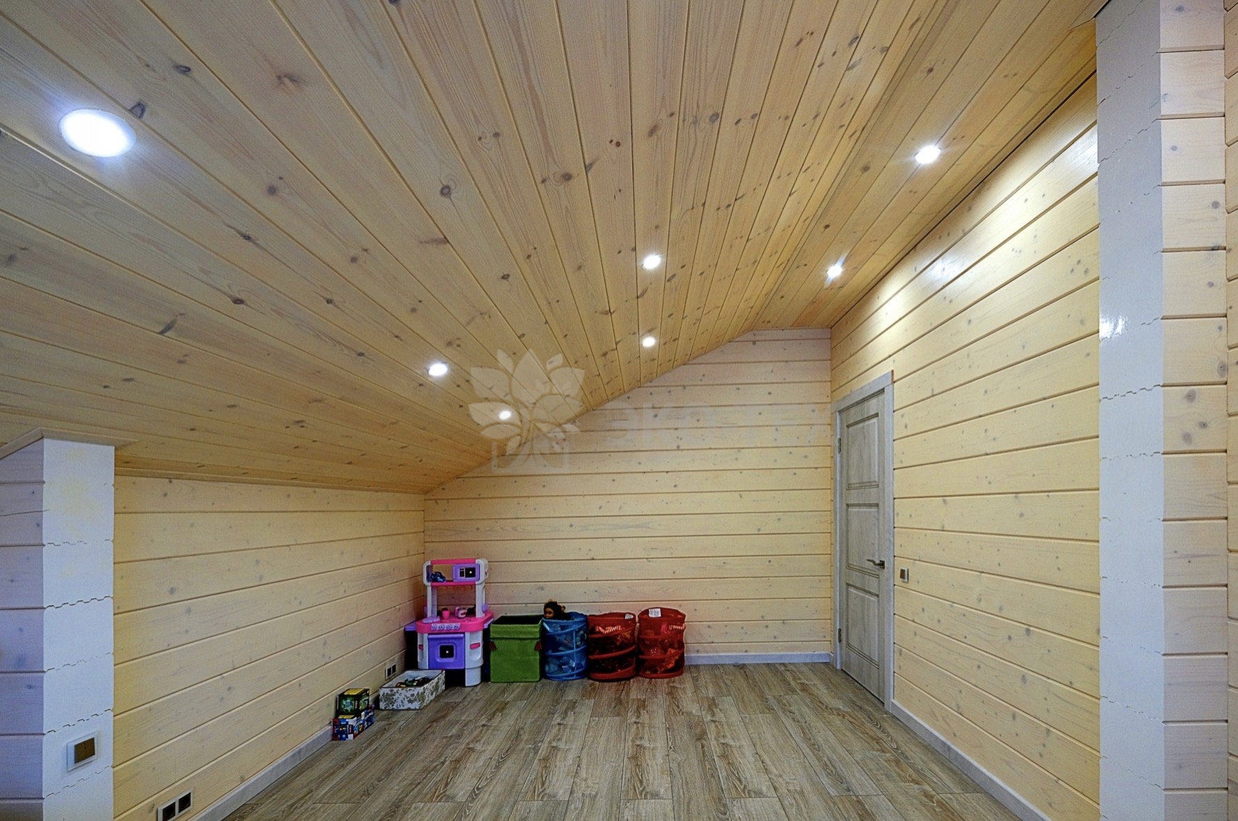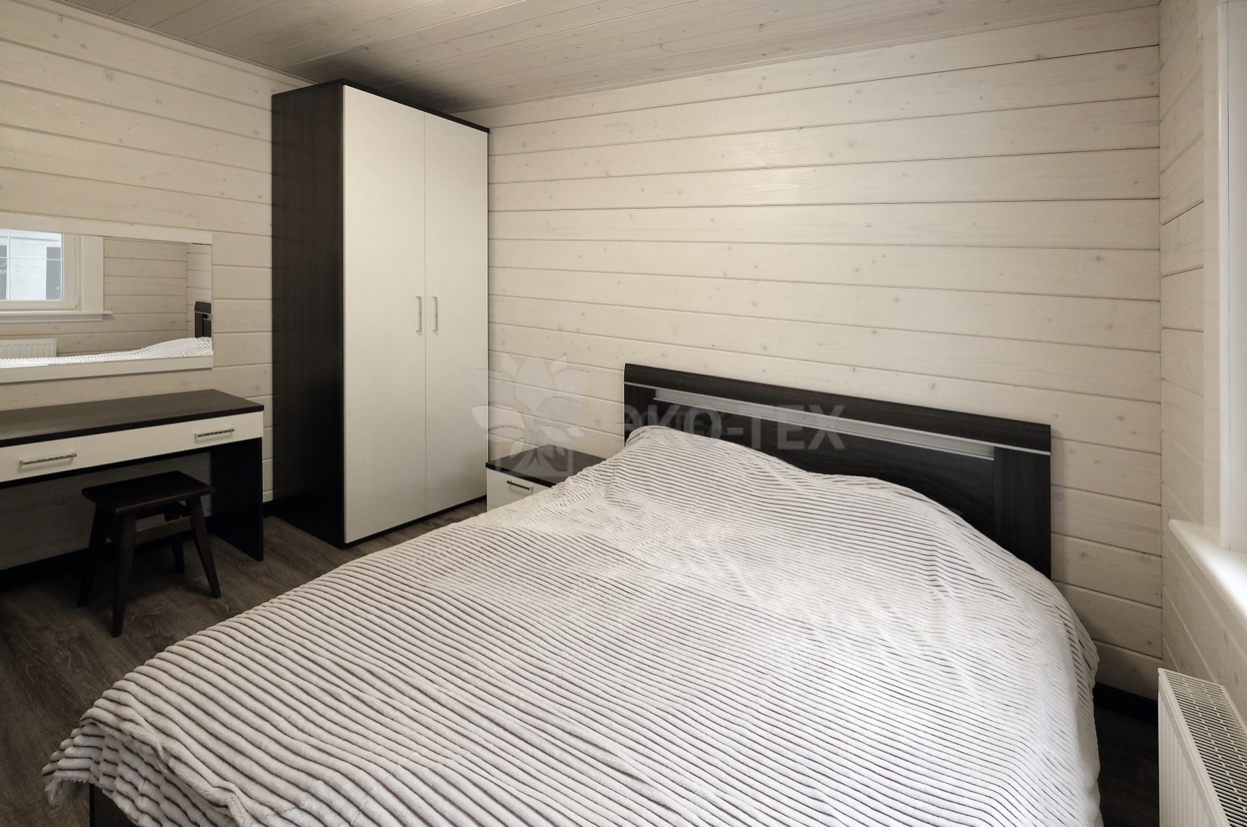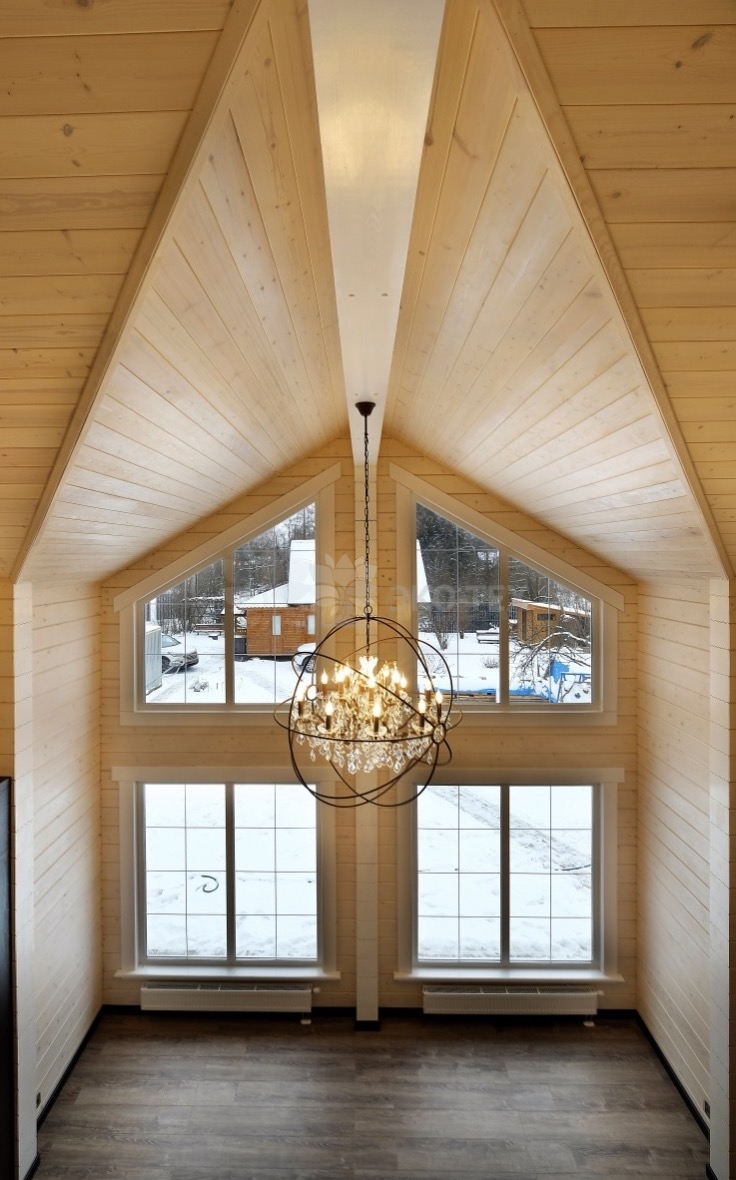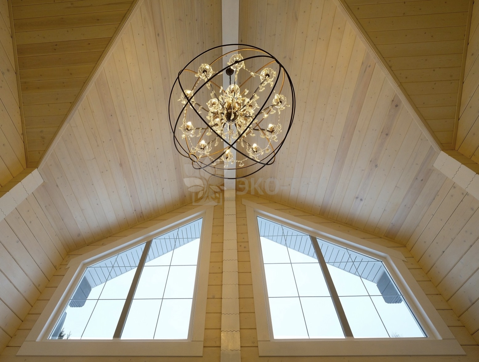 Второй этаж занимают 4 спальни, санузел и галереи. С галереи открывается роскошный вид на пейзаж на панорамными окнами. Внутри дома – светлая отделка, сохраняющая рисунок дерева. Совмещенные санузлы облицованы плиткой. Мебель выбрана в классическом и современном стиле, из массива, ЛДСП, МДФ.