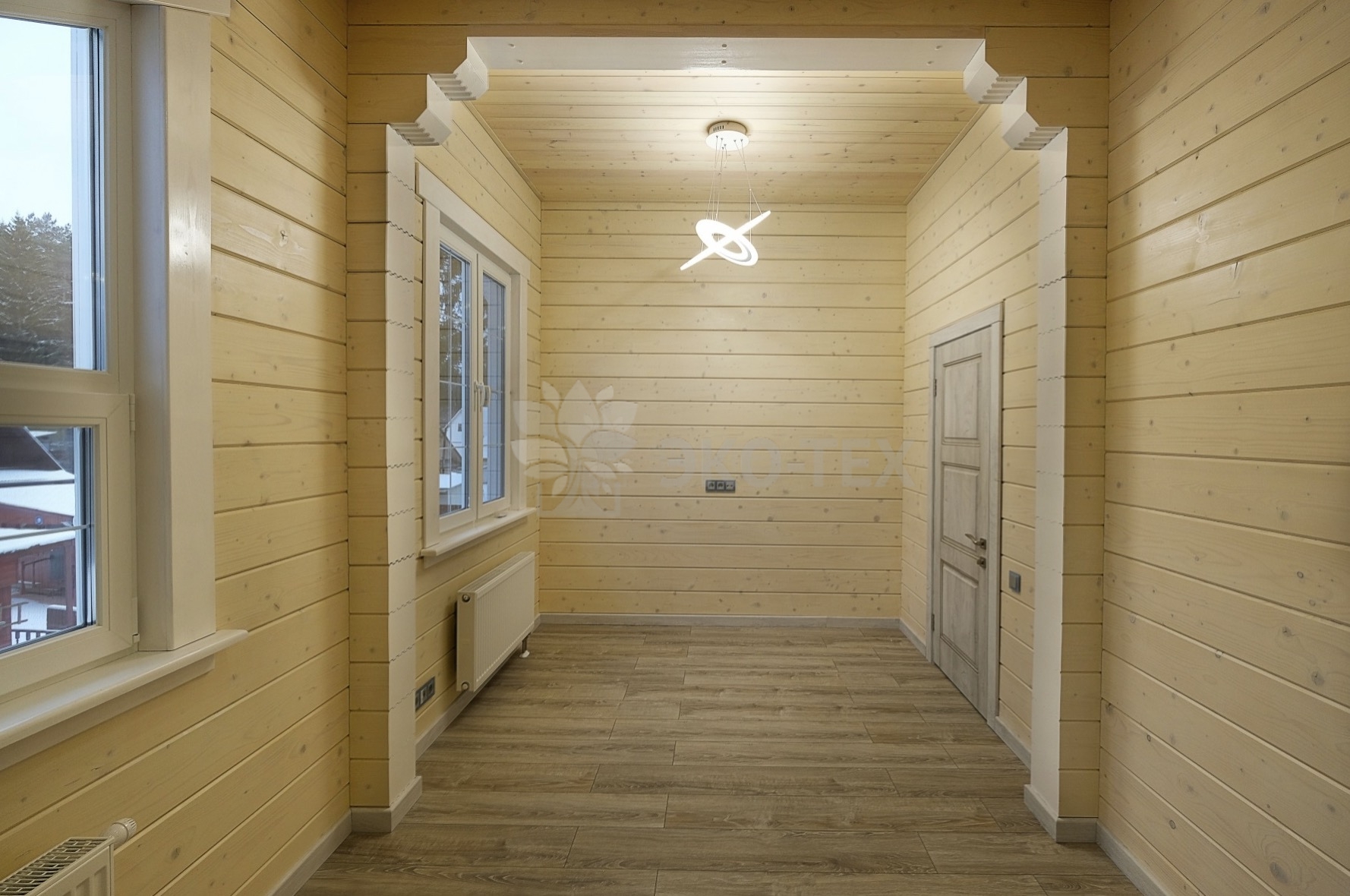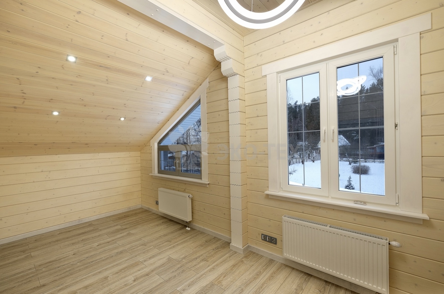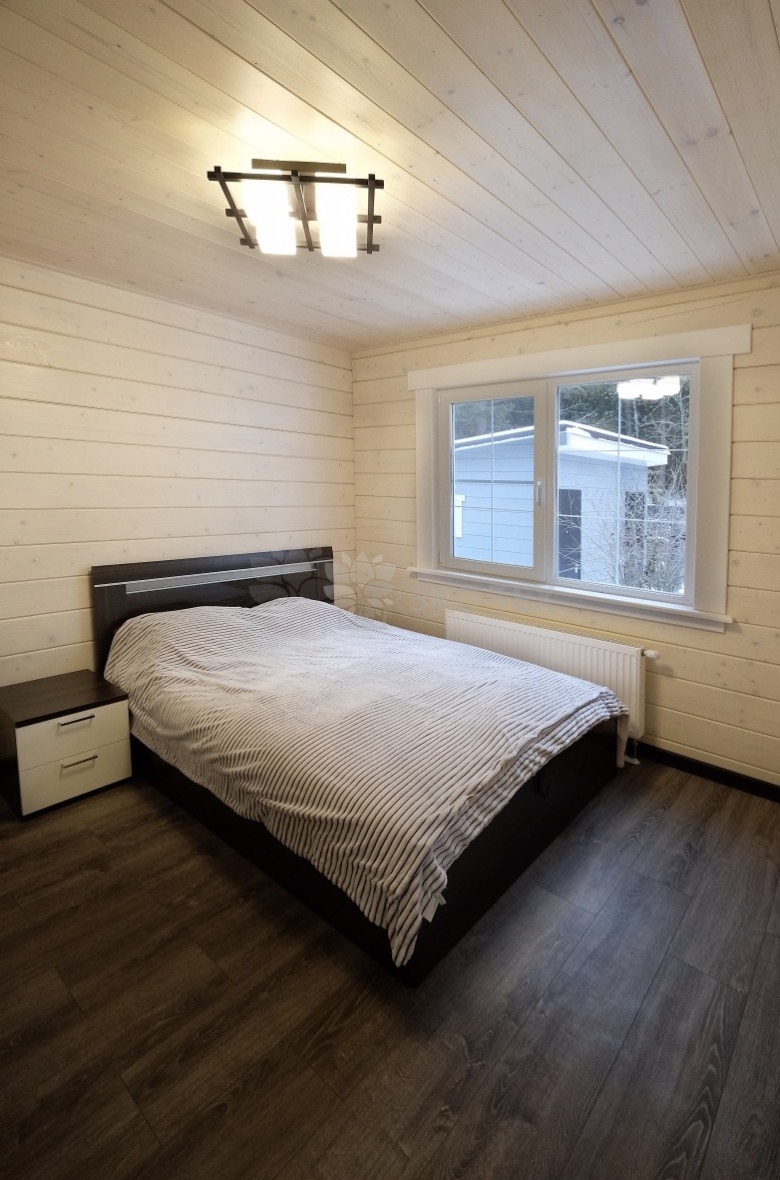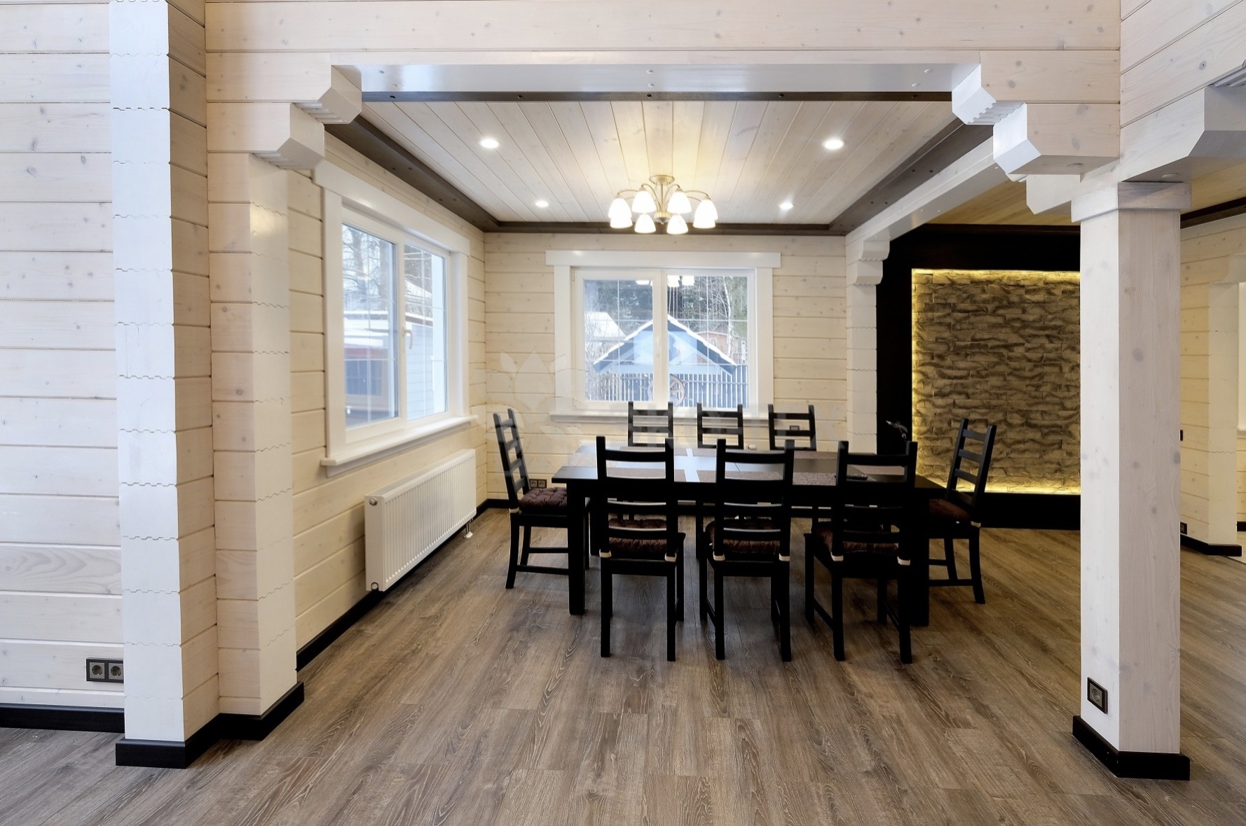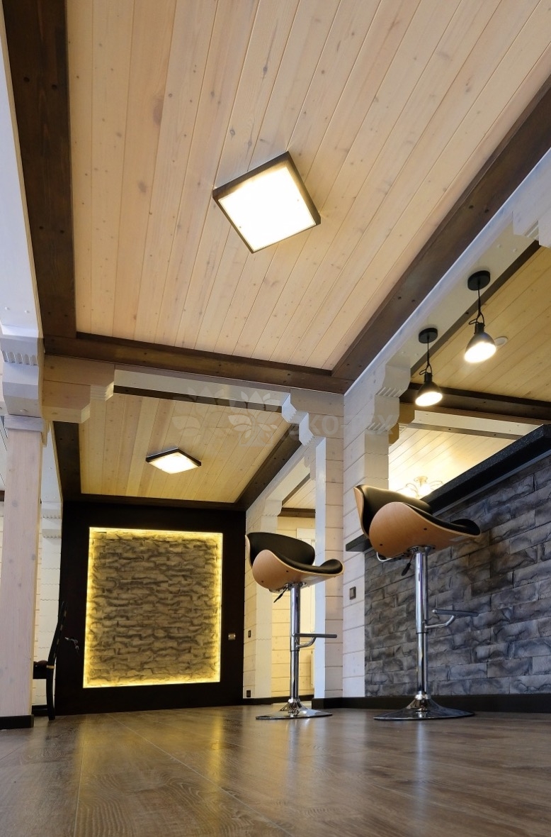 Второй этаж занимают 4 спальни, санузел и галереи. С галереи открывается роскошный вид на пейзаж на панорамными окнами. Внутри дома – светлая отделка, сохраняющая рисунок дерева. Совмещенные санузлы облицованы плиткой. Мебель выбрана в классическом и современном стиле, из массива, ЛДСП, МДФ.