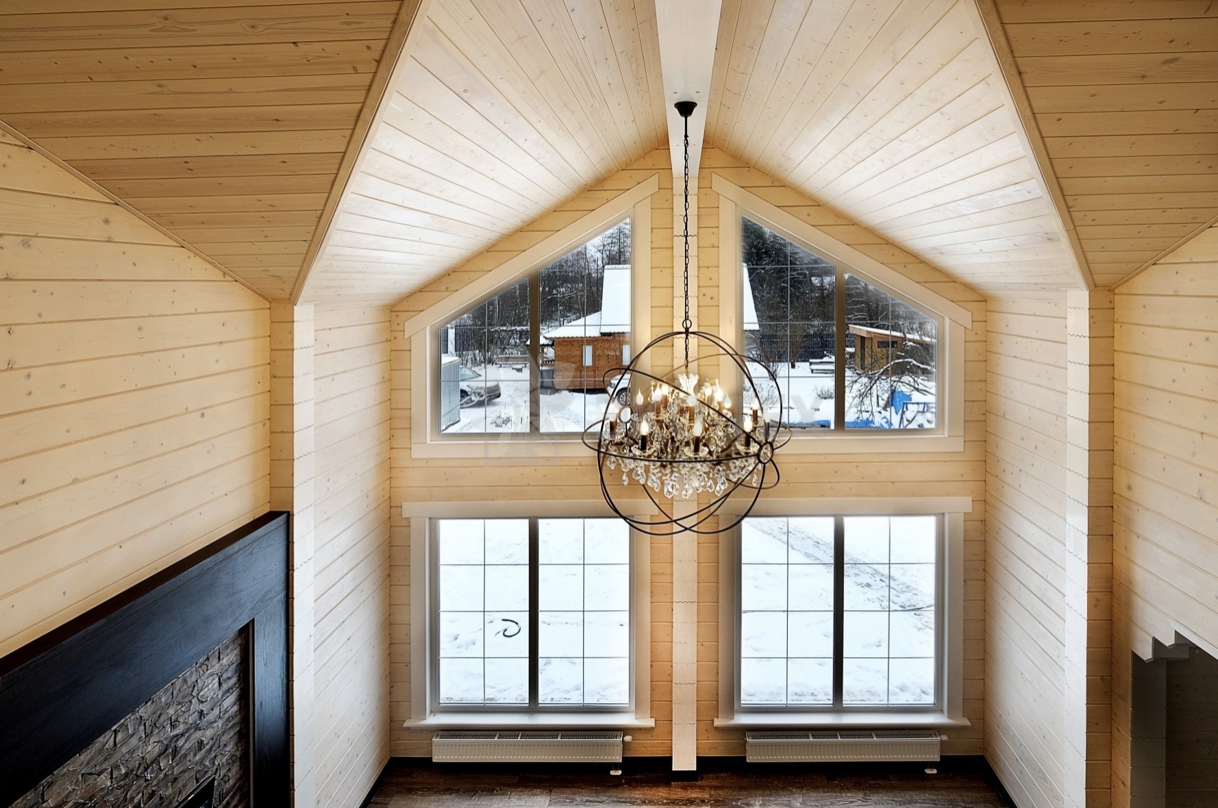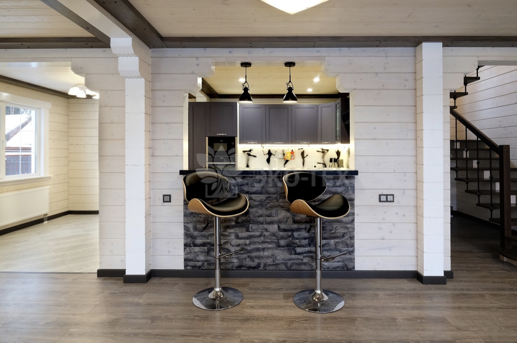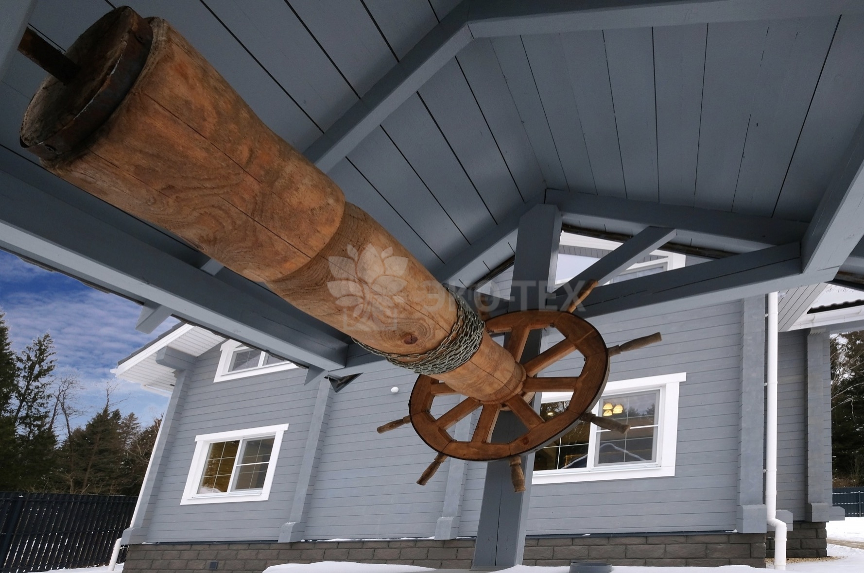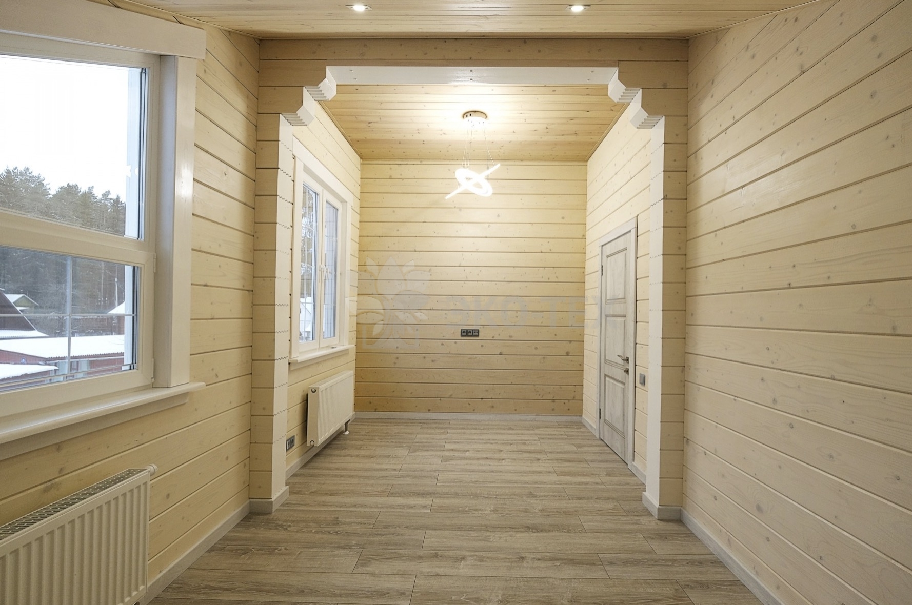 Второй этаж занимают 4 спальни, санузел и галереи. С галереи открывается роскошный вид на пейзаж на панорамными окнами. Внутри дома – светлая отделка, сохраняющая рисунок дерева. Совмещенные санузлы облицованы плиткой. Мебель выбрана в классическом и современном стиле, из массива, ЛДСП, МДФ.