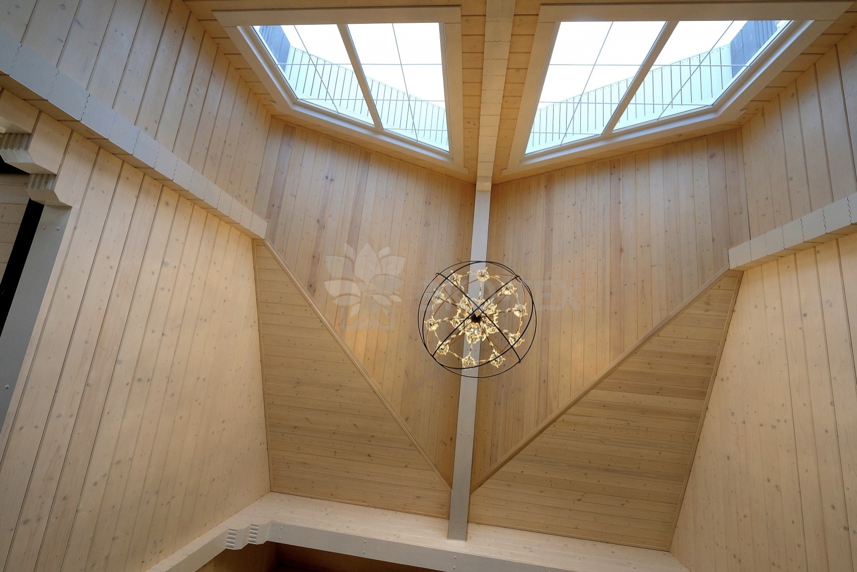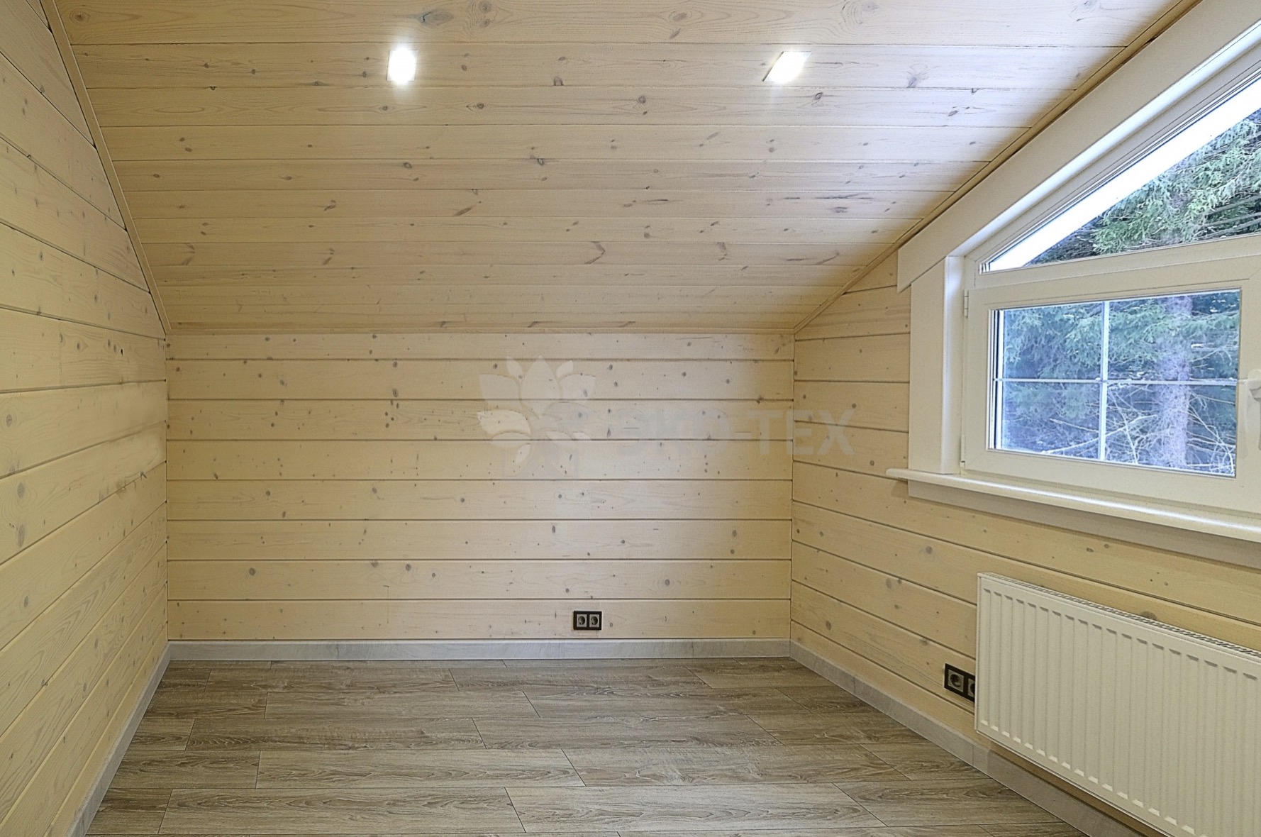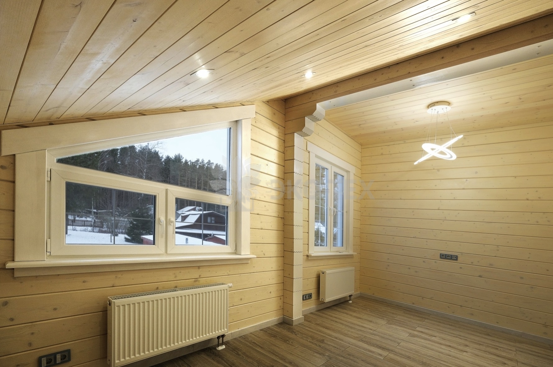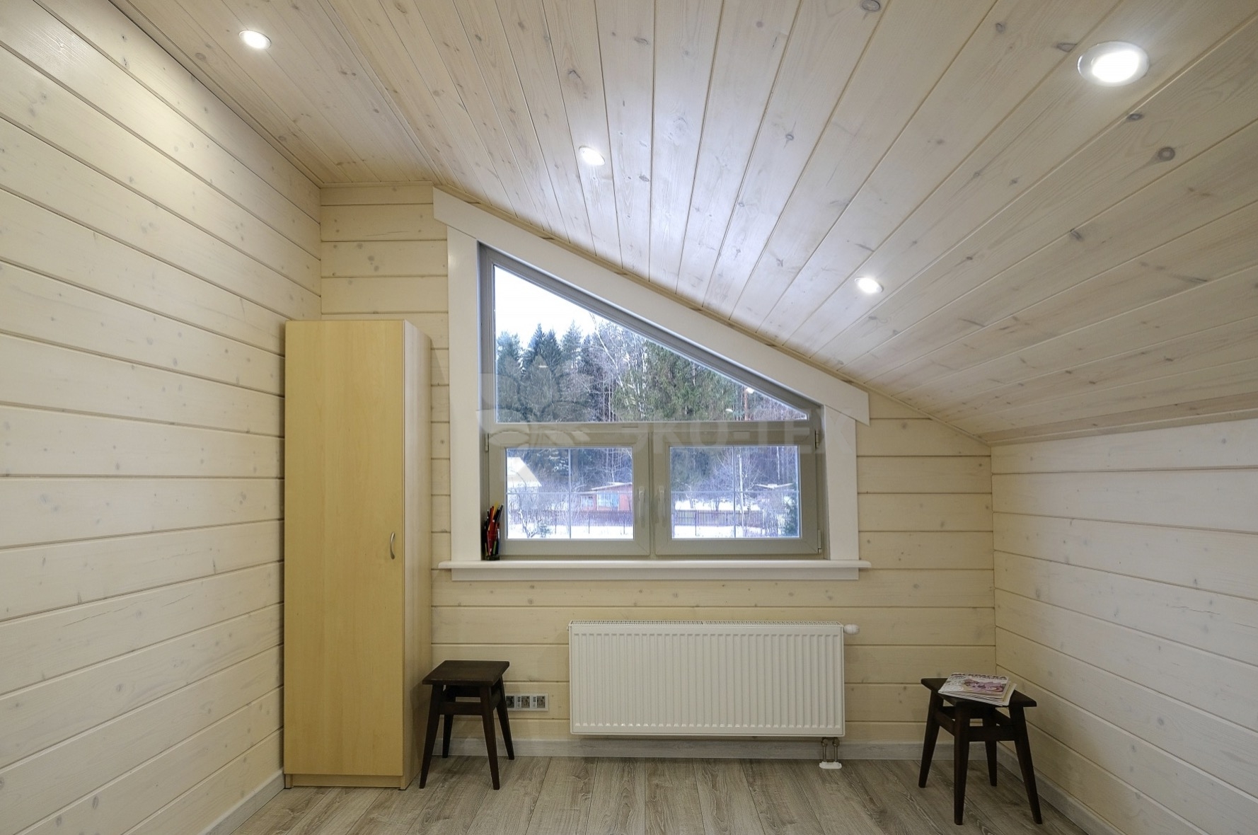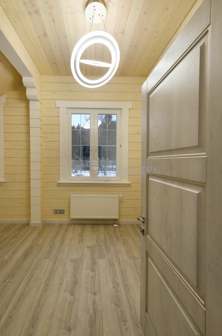 Второй этаж занимают 4 спальни, санузел и галереи. С галереи открывается роскошный вид на пейзаж на панорамными окнами. Внутри дома – светлая отделка, сохраняющая рисунок дерева. Совмещенные санузлы облицованы плиткой. Мебель выбрана в классическом и современном стиле, из массива, ЛДСП, МДФ.