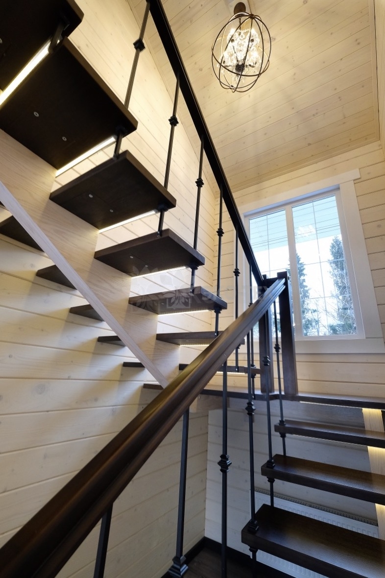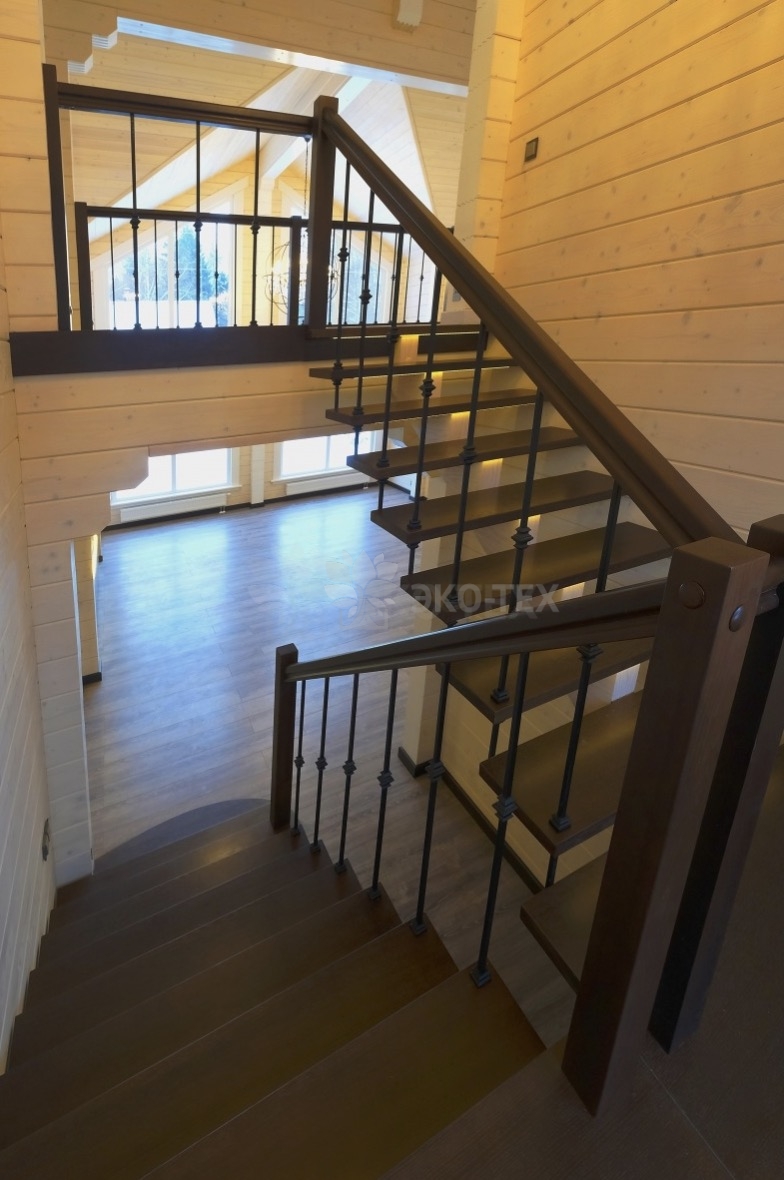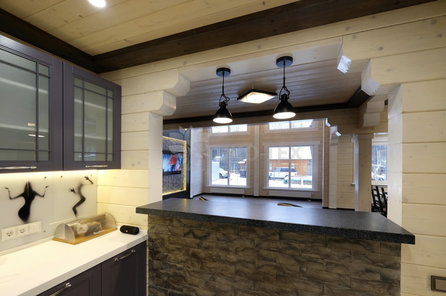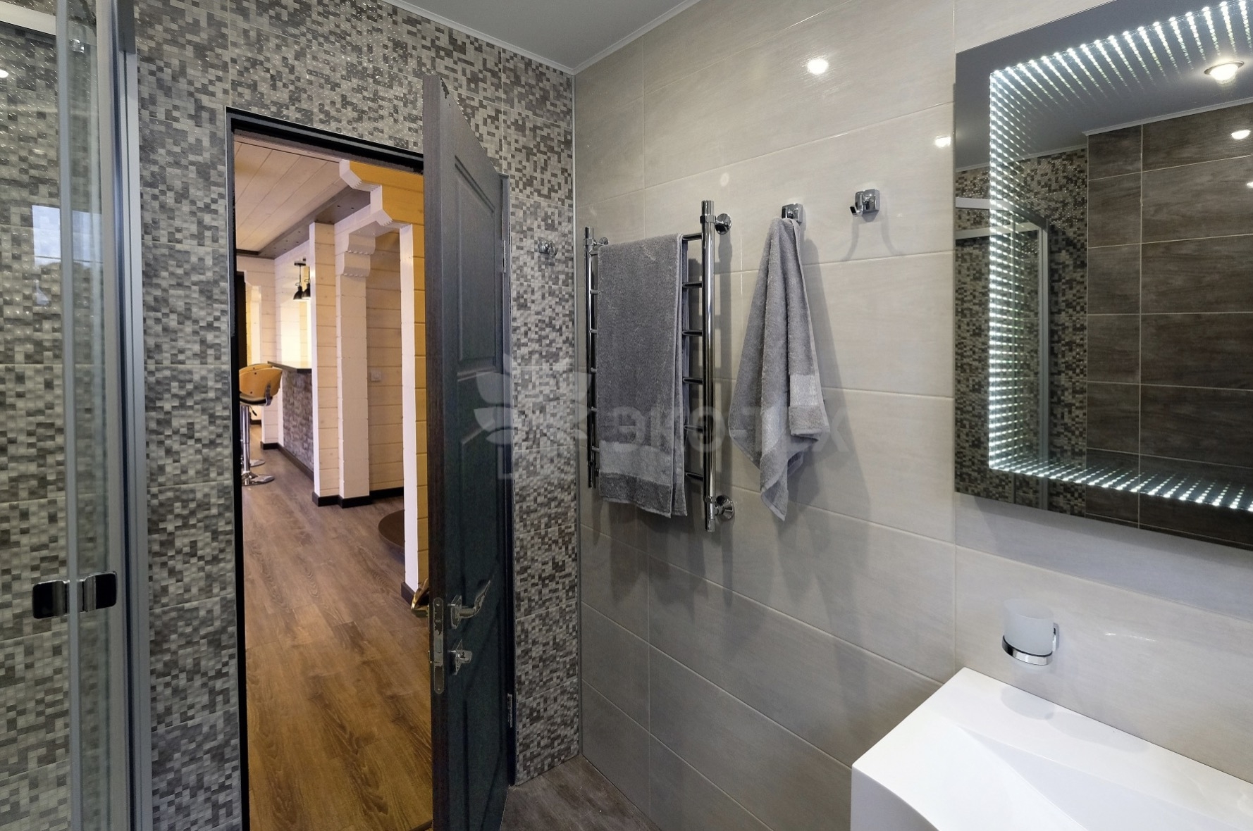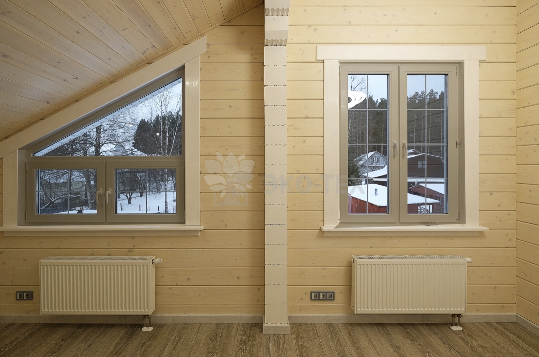 Второй этаж занимают 4 спальни, санузел и галереи. С галереи открывается роскошный вид на пейзаж на панорамными окнами. Внутри дома – светлая отделка, сохраняющая рисунок дерева. Совмещенные санузлы облицованы плиткой. Мебель выбрана в классическом и современном стиле, из массива, ЛДСП, МДФ.