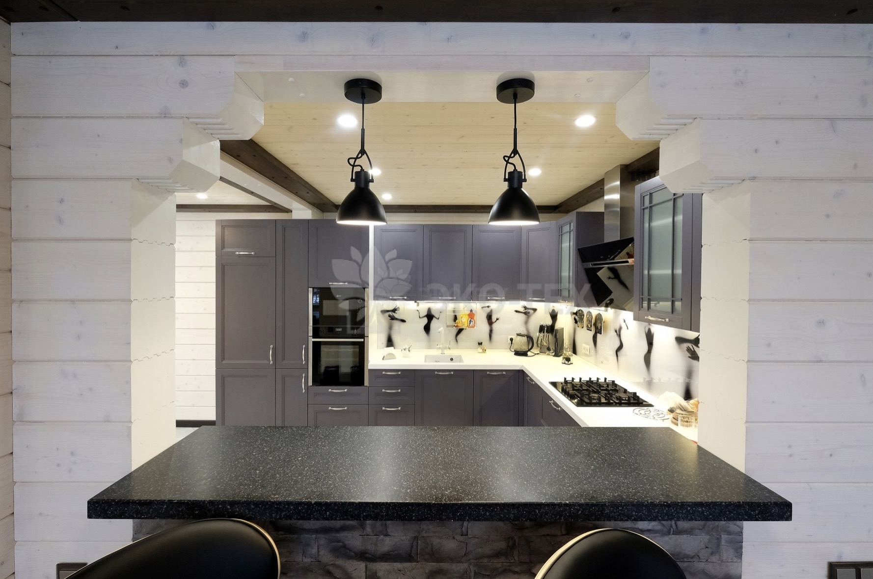 Под кухню отвели отдельную площадь. Эти три функциональные зоны без перегородок образуют единое пространство. Здесь без труда разместиться большая семья, компания друзей.