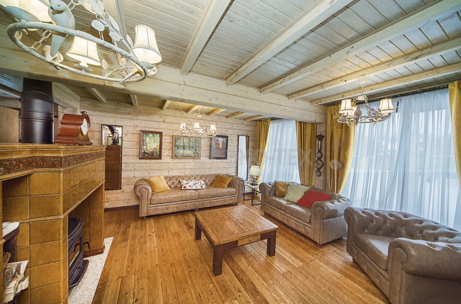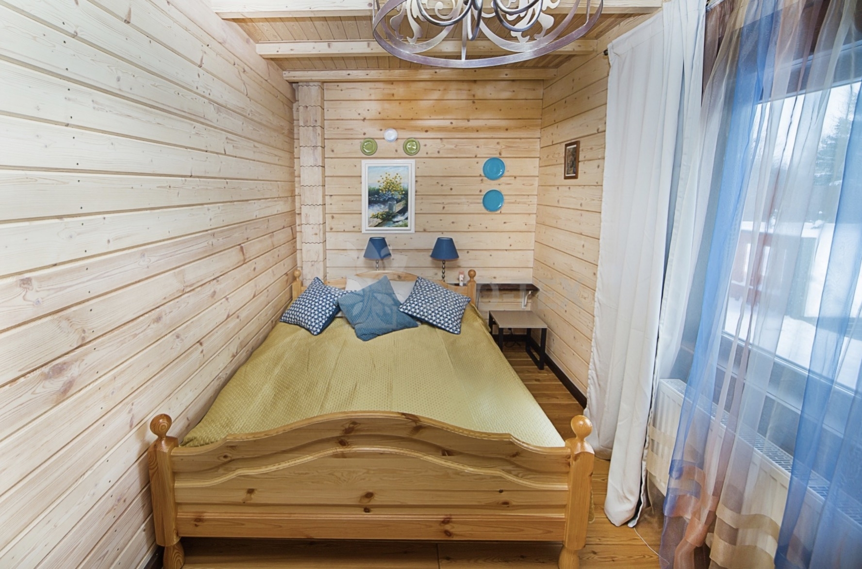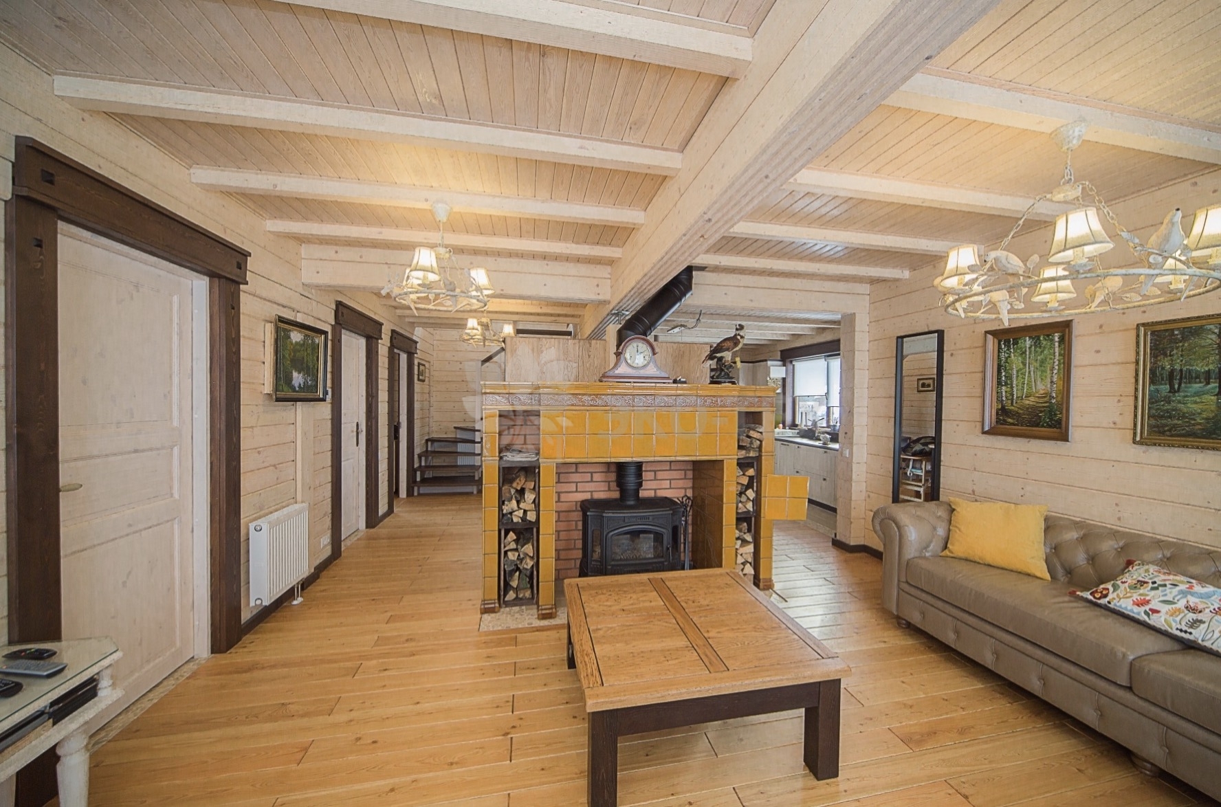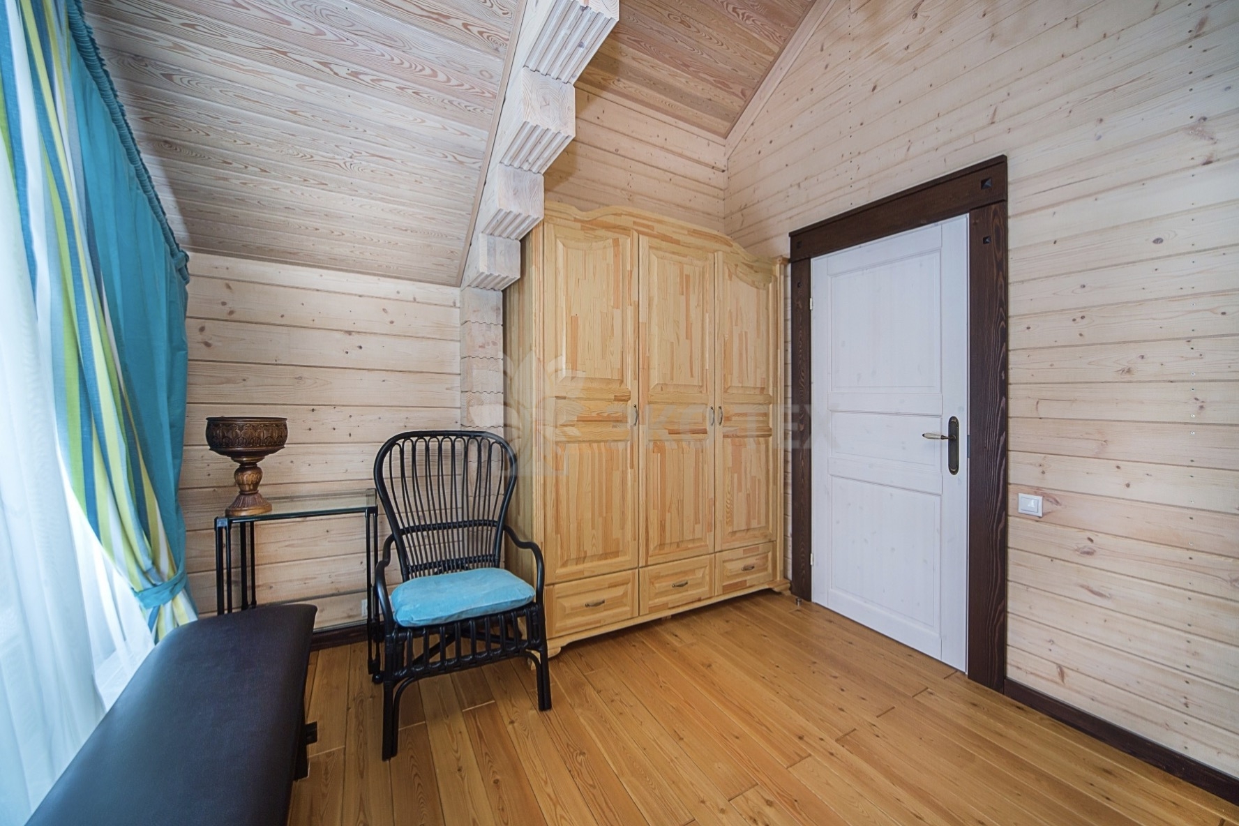 Во внутренней отделке сохранили естественный цвет натурального дерева. Мебель выбрана из массива. В отделке ванных комнат использована плитка. Цвет текстиля прекрасно сочетается с фактурой клееного бруса.