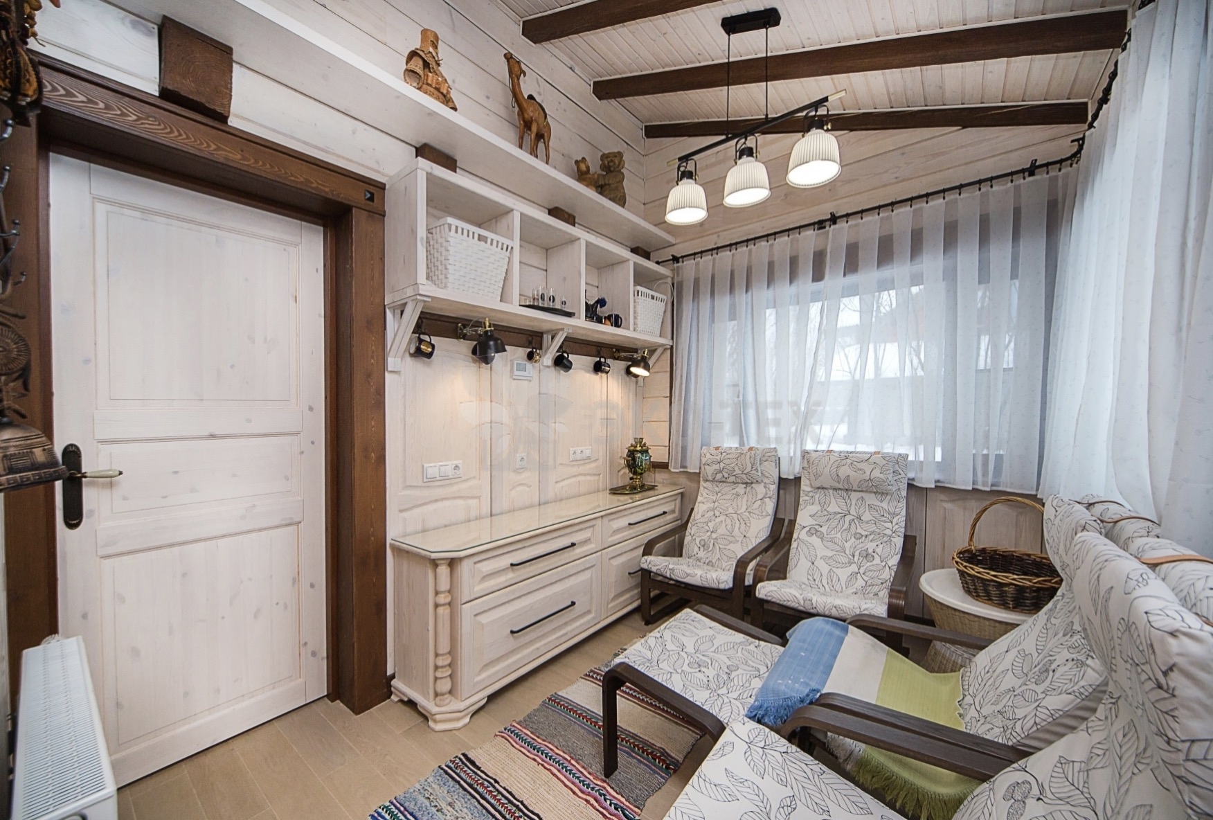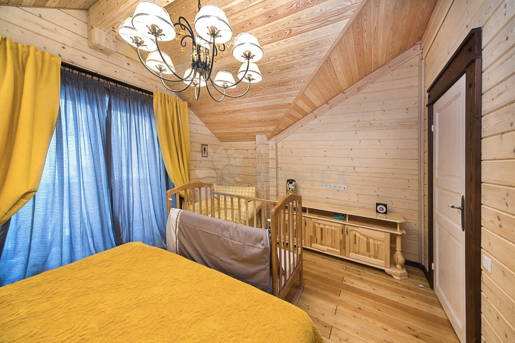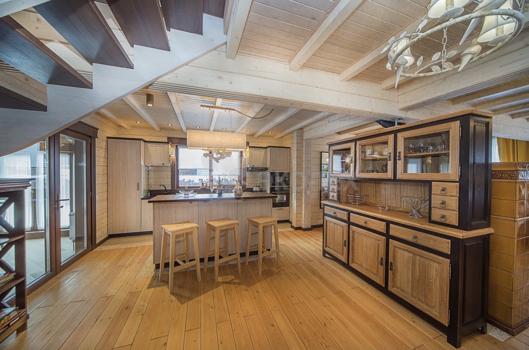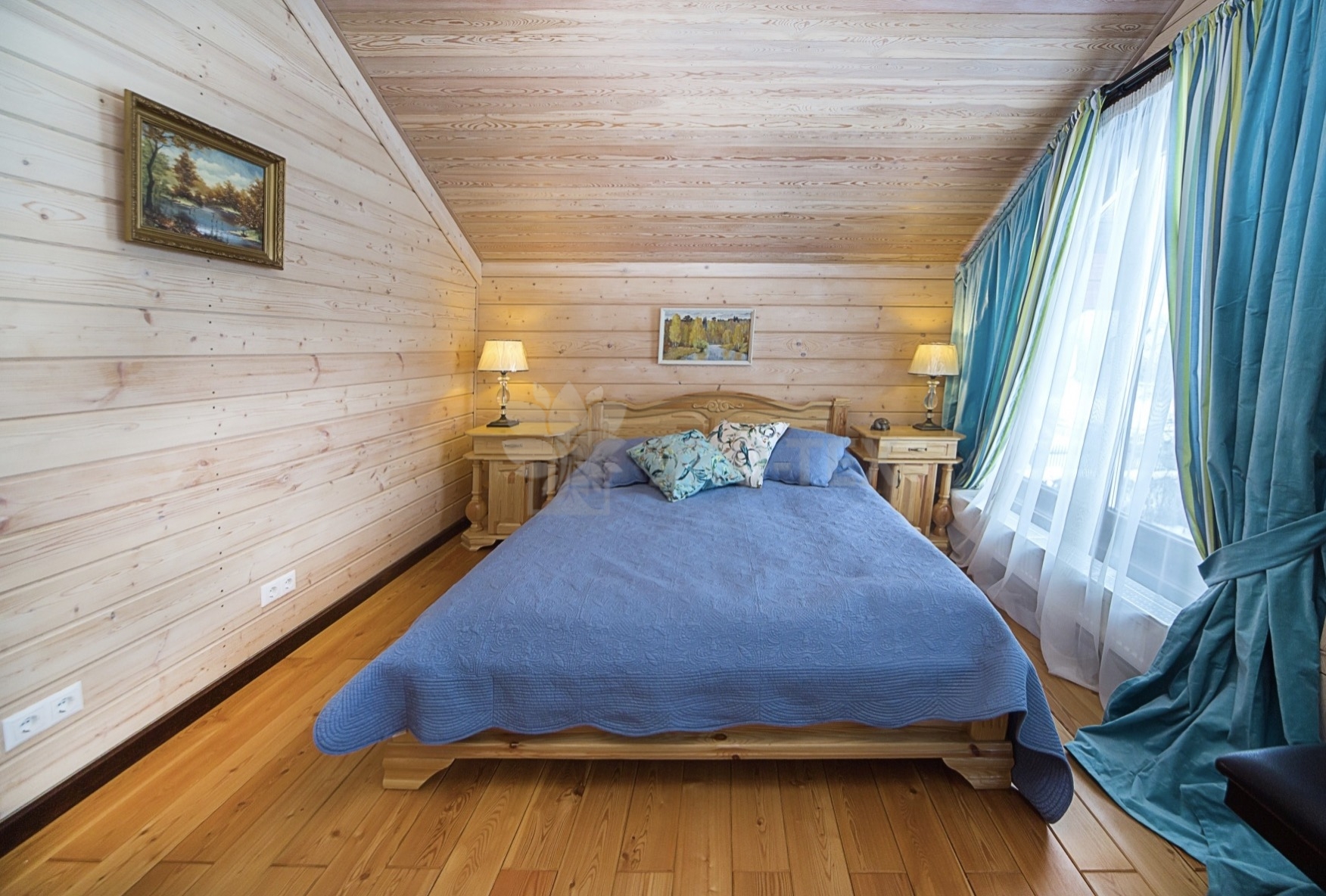 Во внутренней отделке сохранили естественный цвет натурального дерева. Мебель выбрана из массива. В отделке ванных комнат использована плитка. Цвет текстиля прекрасно сочетается с фактурой клееного бруса.