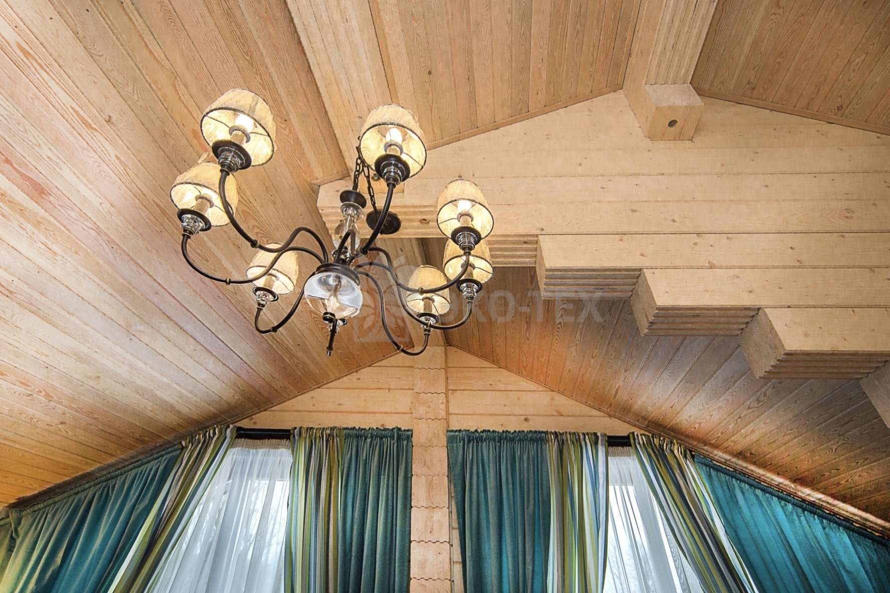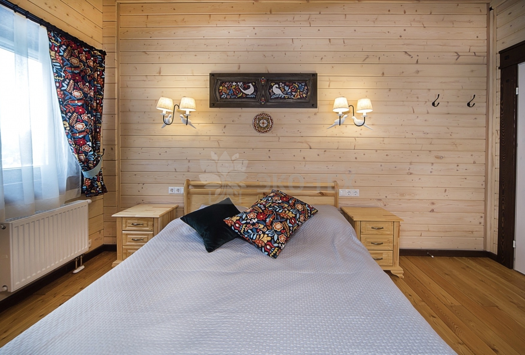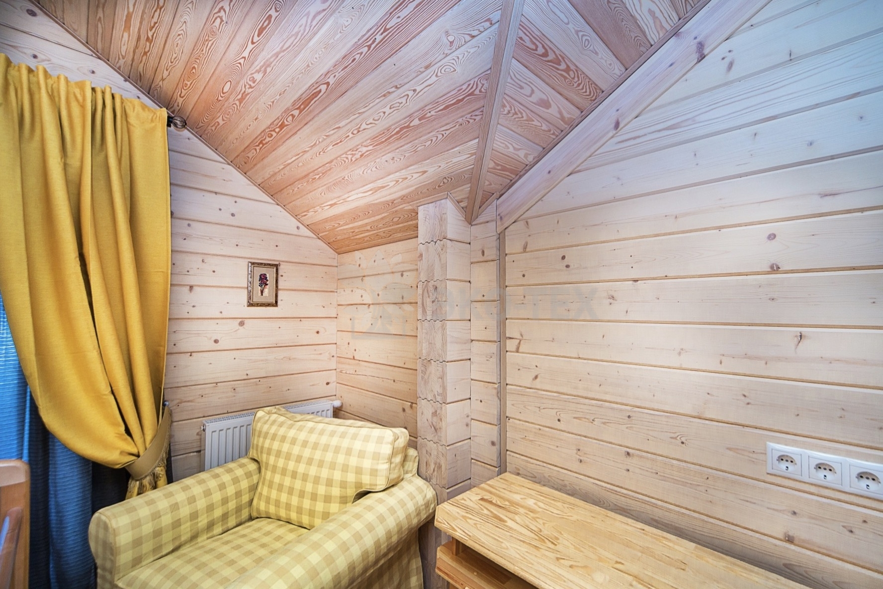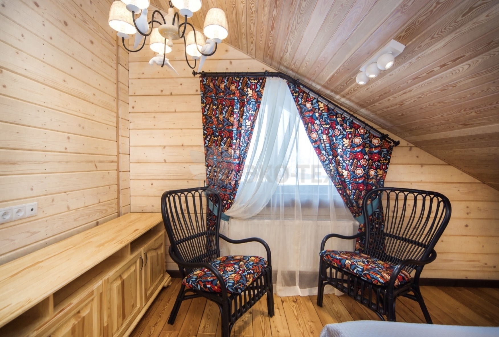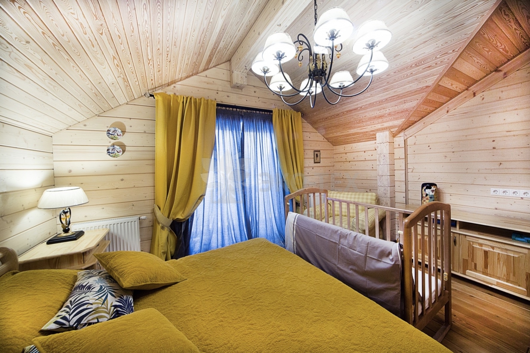 Во внутренней отделке сохранили естественный цвет натурального дерева. Мебель выбрана из массива. В отделке ванных комнат использована плитка. Цвет текстиля прекрасно сочетается с фактурой клееного бруса.