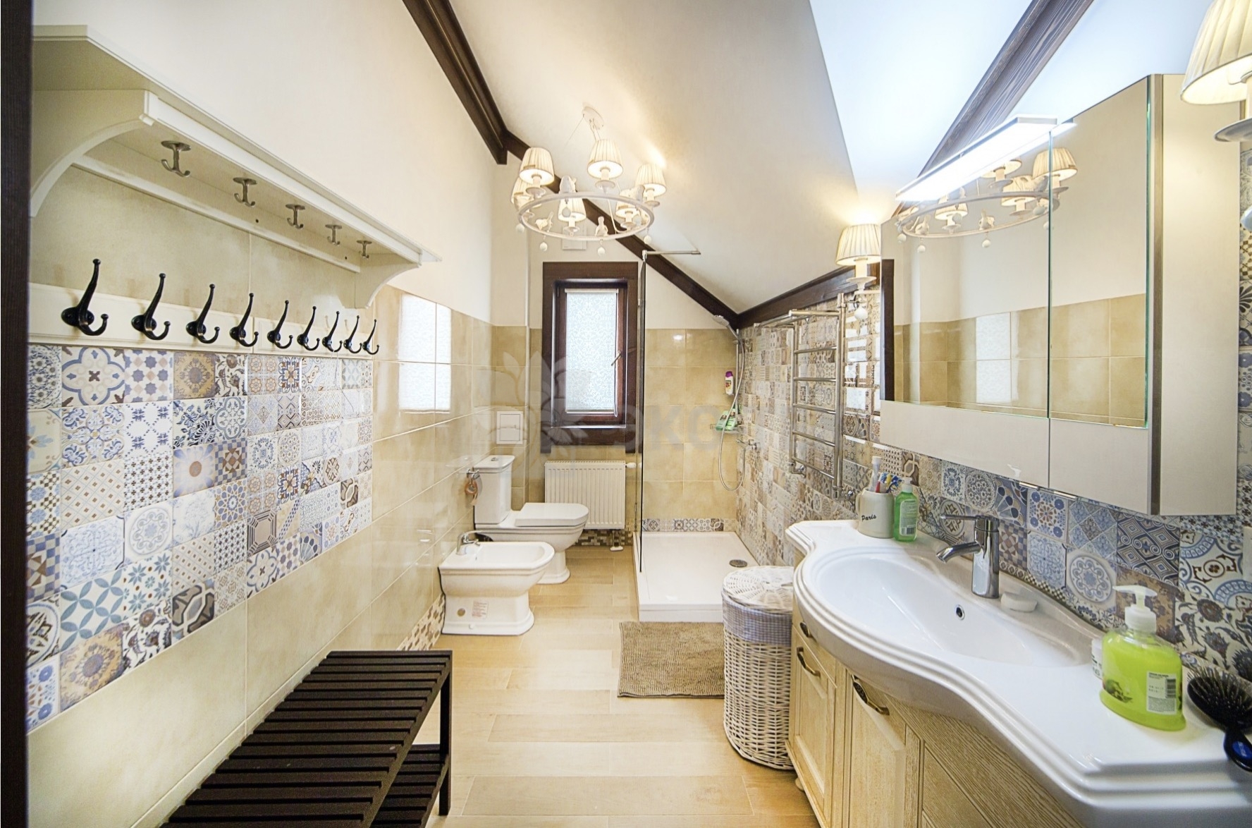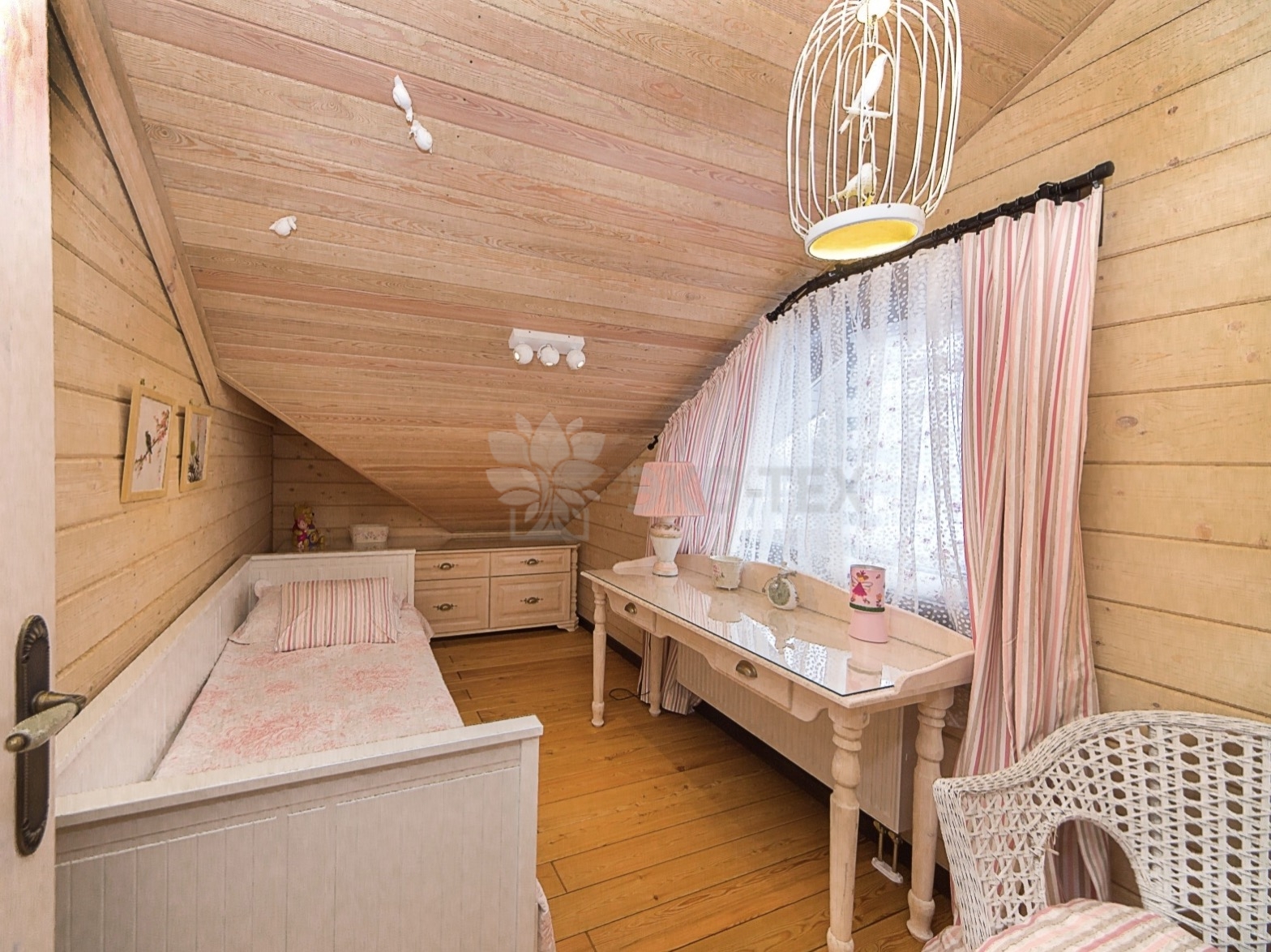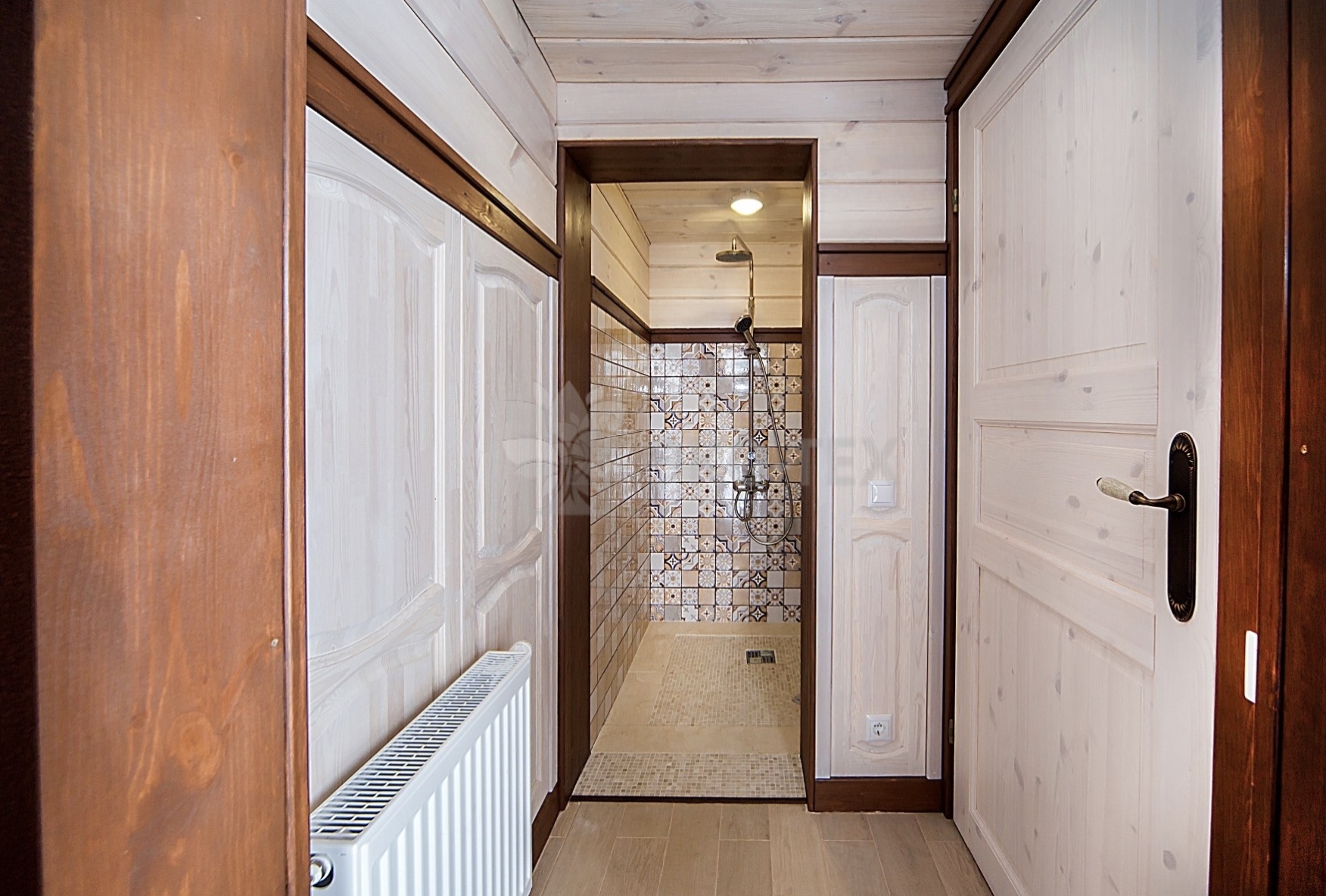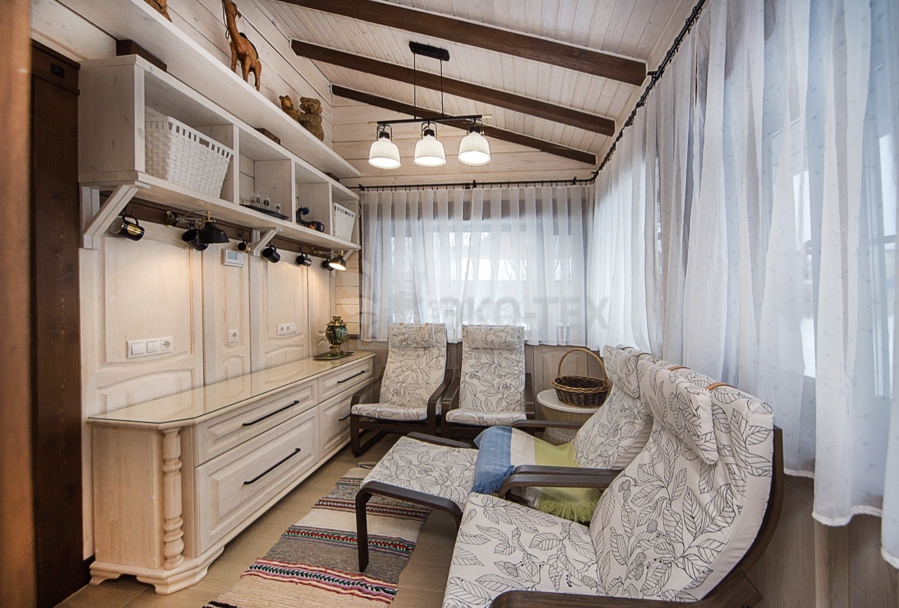 Во внутренней отделке сохранили естественный цвет натурального дерева. Мебель выбрана из массива. В отделке ванных комнат использована плитка. Цвет текстиля прекрасно сочетается с фактурой клееного бруса.