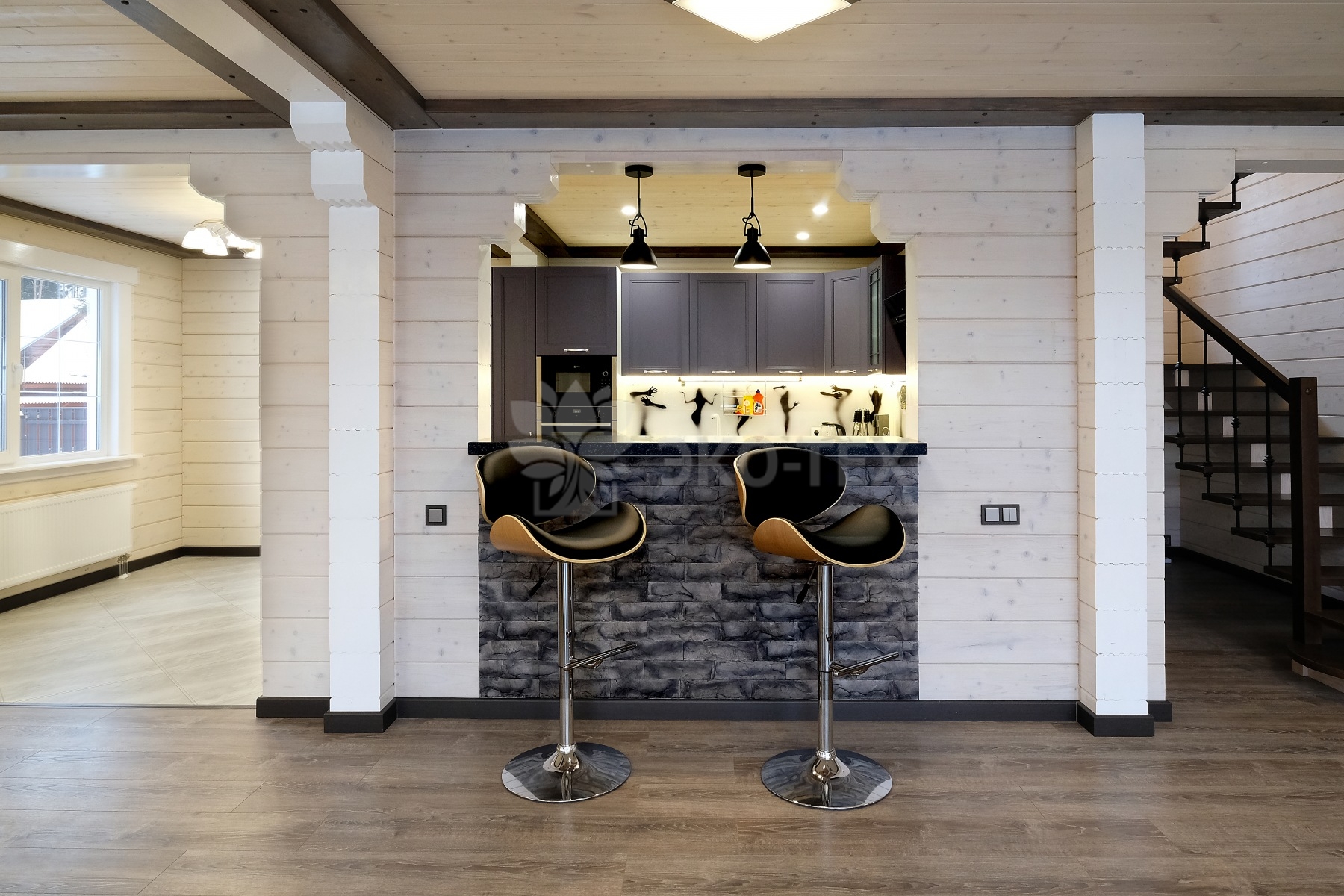 Внутренний дизайн интерьера современного деревянного дома предполагает широкие пространства и высокие потолки, поэтому деревянная отделка стен не выглядит нависающей и сжимающей пространство. Логично в таком случае делать совмещение кухни и столовой, а может и гостиной. Так получается модный эффект опен спейс, когда в большом, светлом помещении легко размещается вся необходимая техника, и в приготовлении еды и разговорах могут участвовать все, находящиеся здесь.