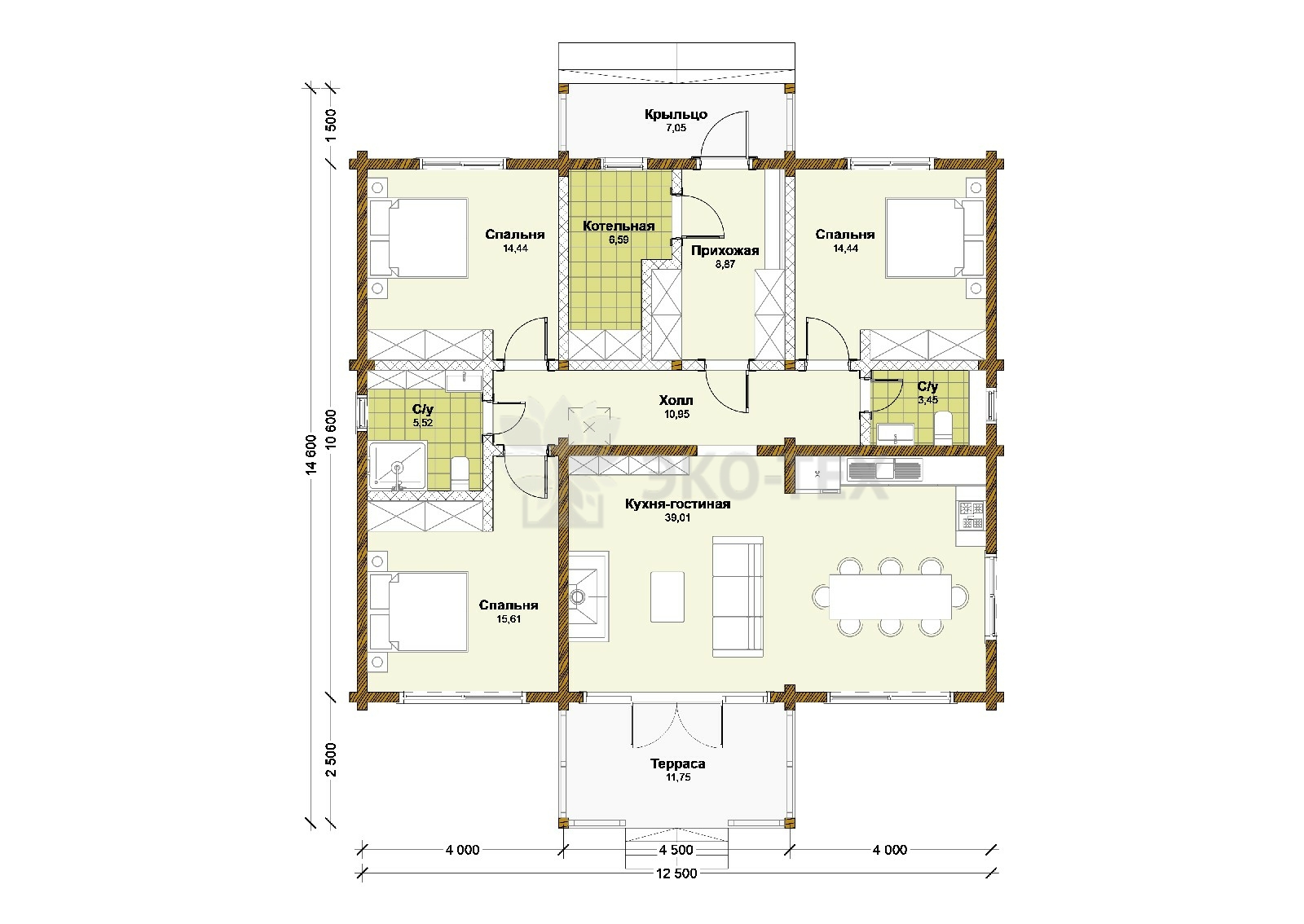 Большой дом гостиная, 2 спальни, материал клееный брус