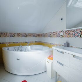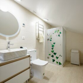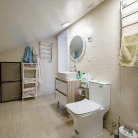На первом этаже также расположена жилая комната, которая может быть спальней, кабинетом или вашей творческой мастерской. На первом этаже предусмотрена отдельная гардеробная, размещенная рядом с котельной, в которой можно оборудовать мини — прачечную.