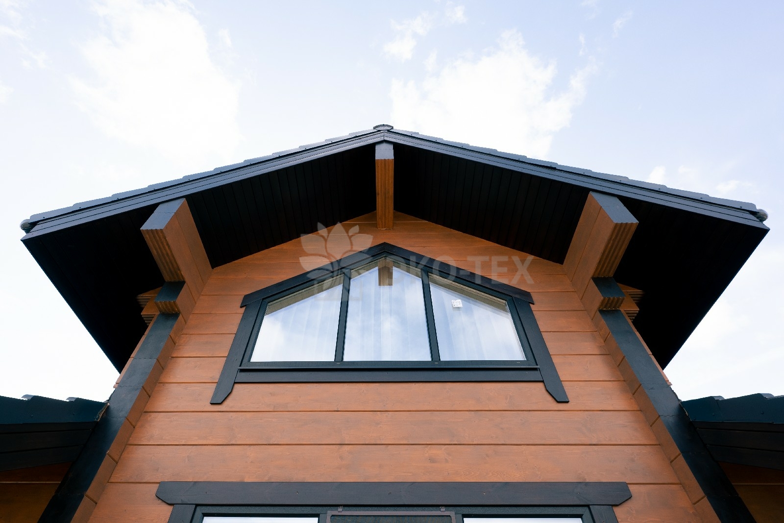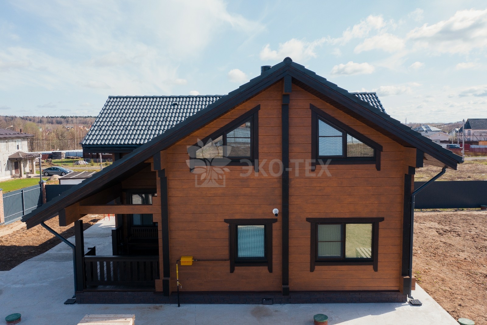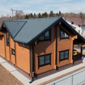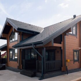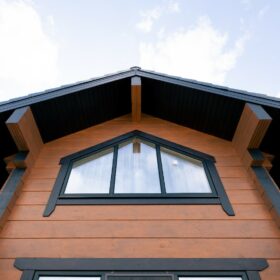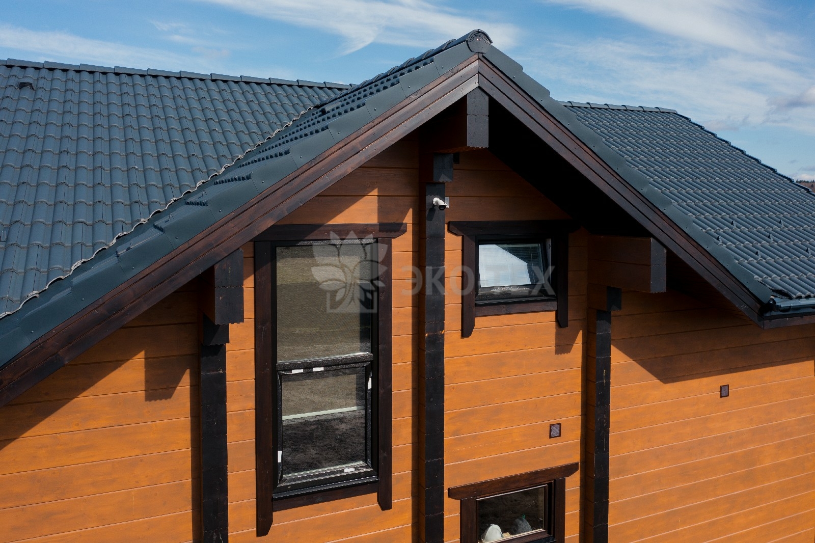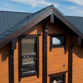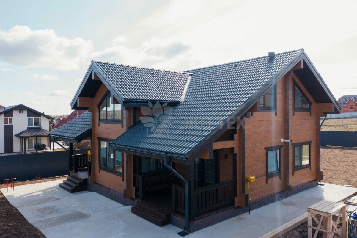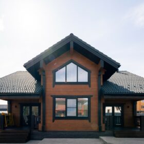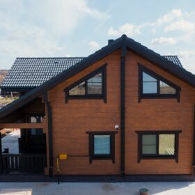 Фасад украшают окна с современными стеклопакетами, обеспечивающими надёжную тепло и шумоизоляцию. Стильная темно-коричневая отделка идеально сочетается с фасадом из натурального дерева.