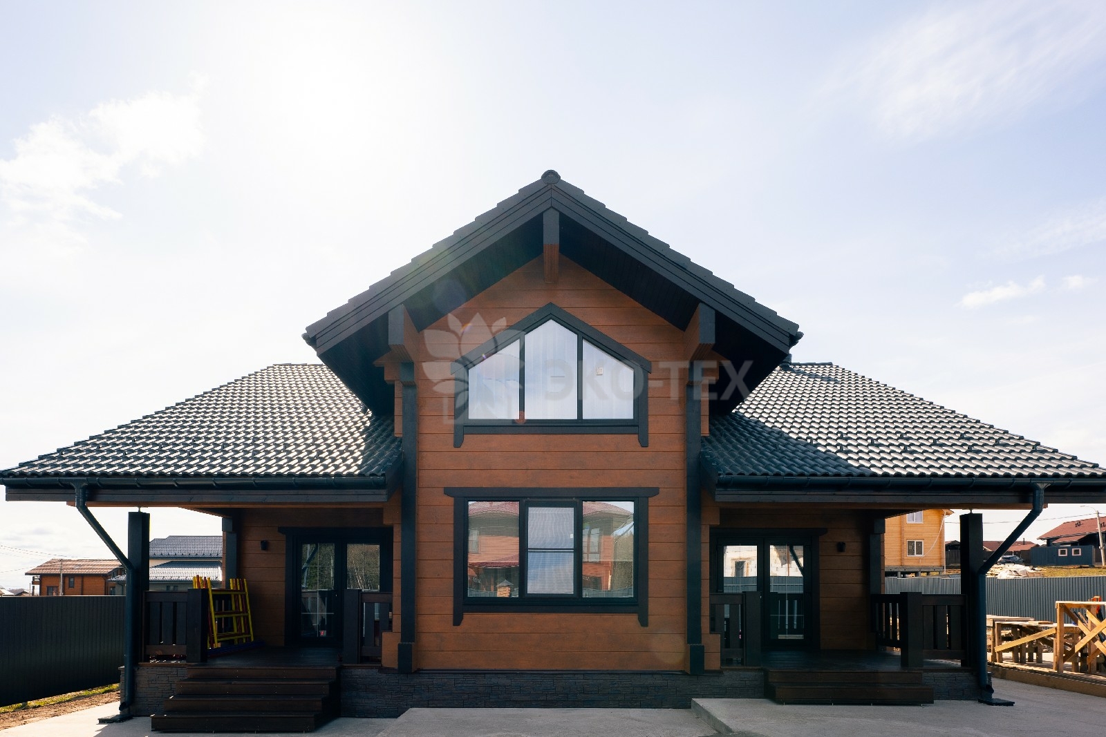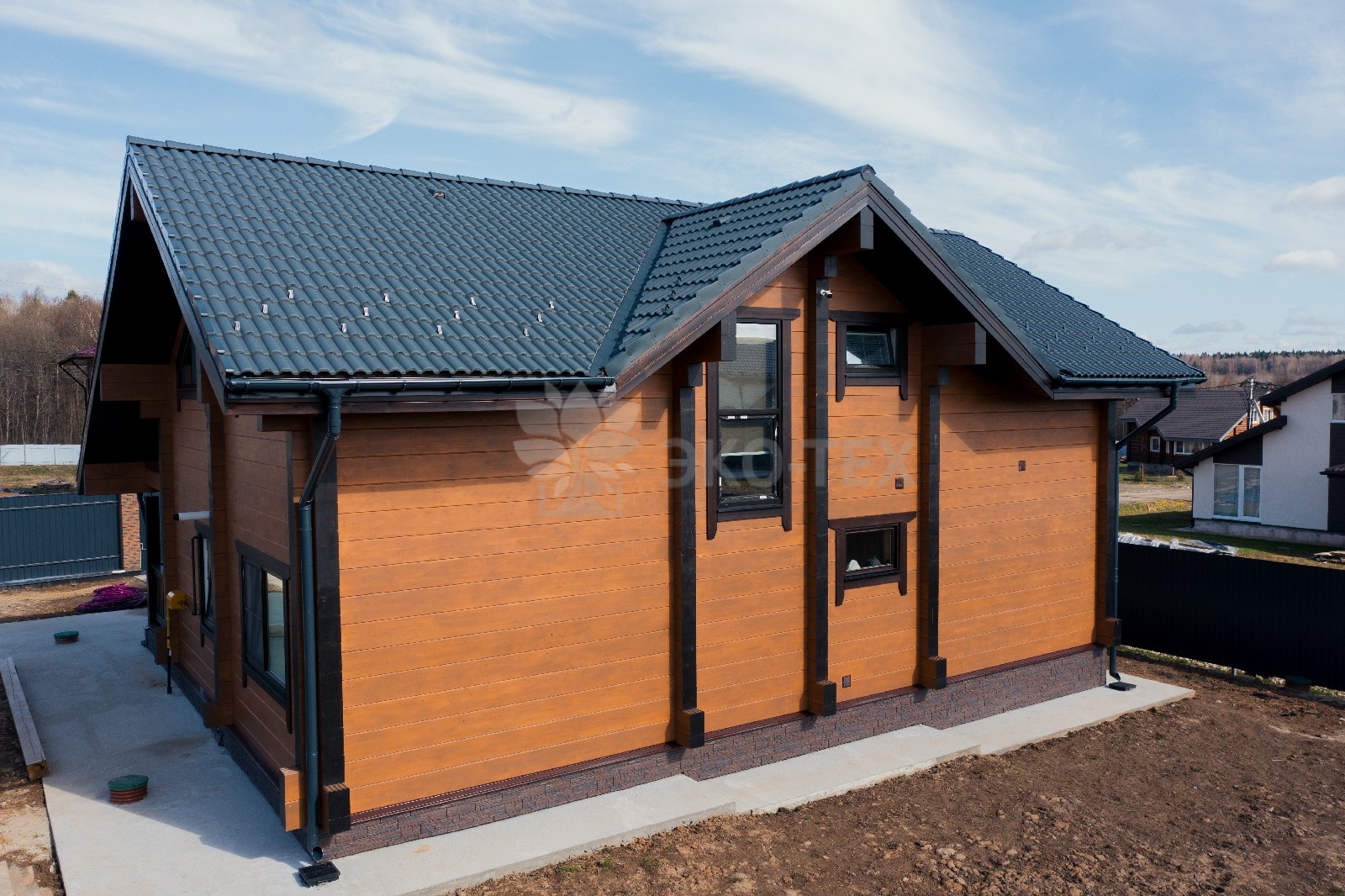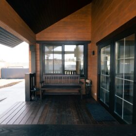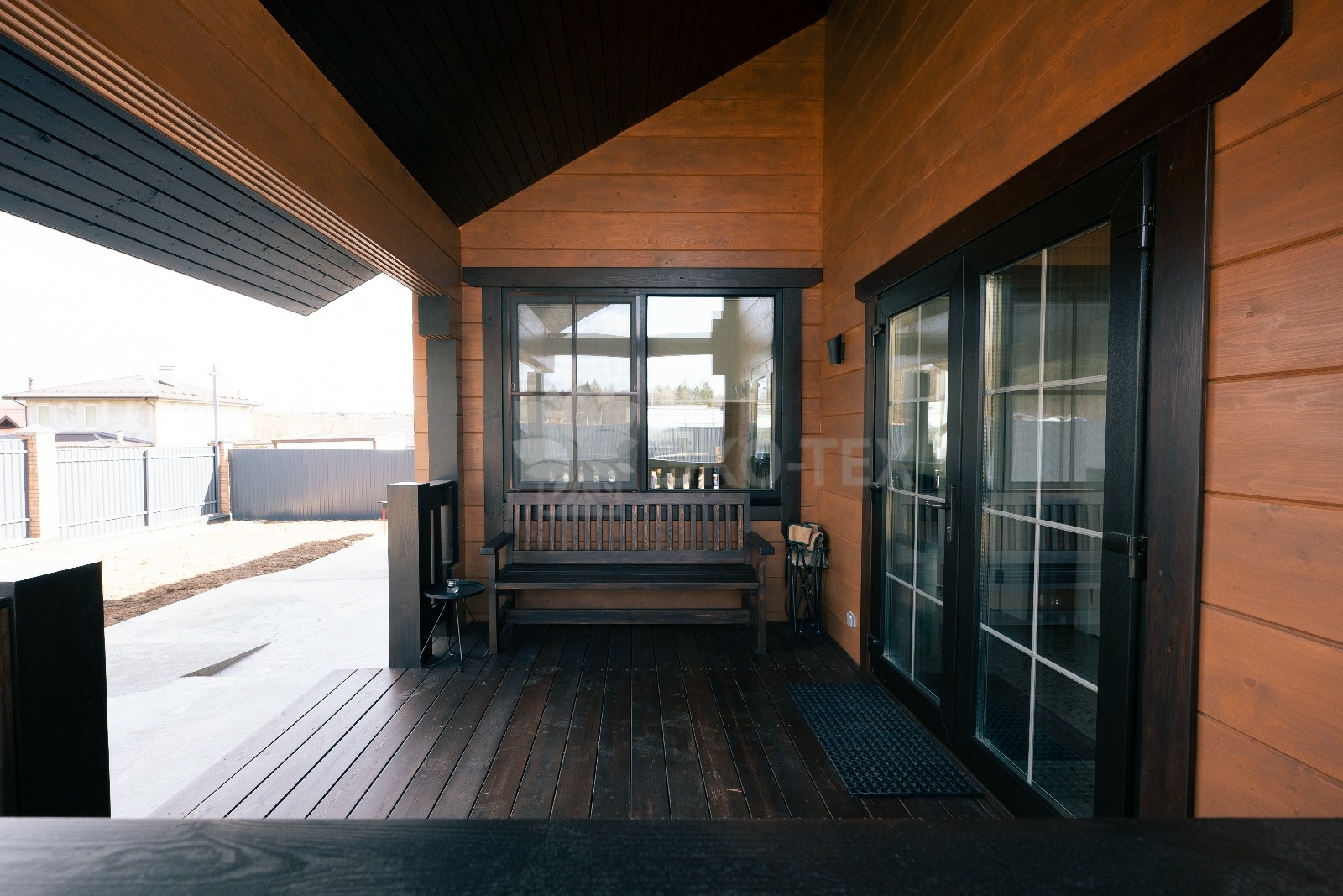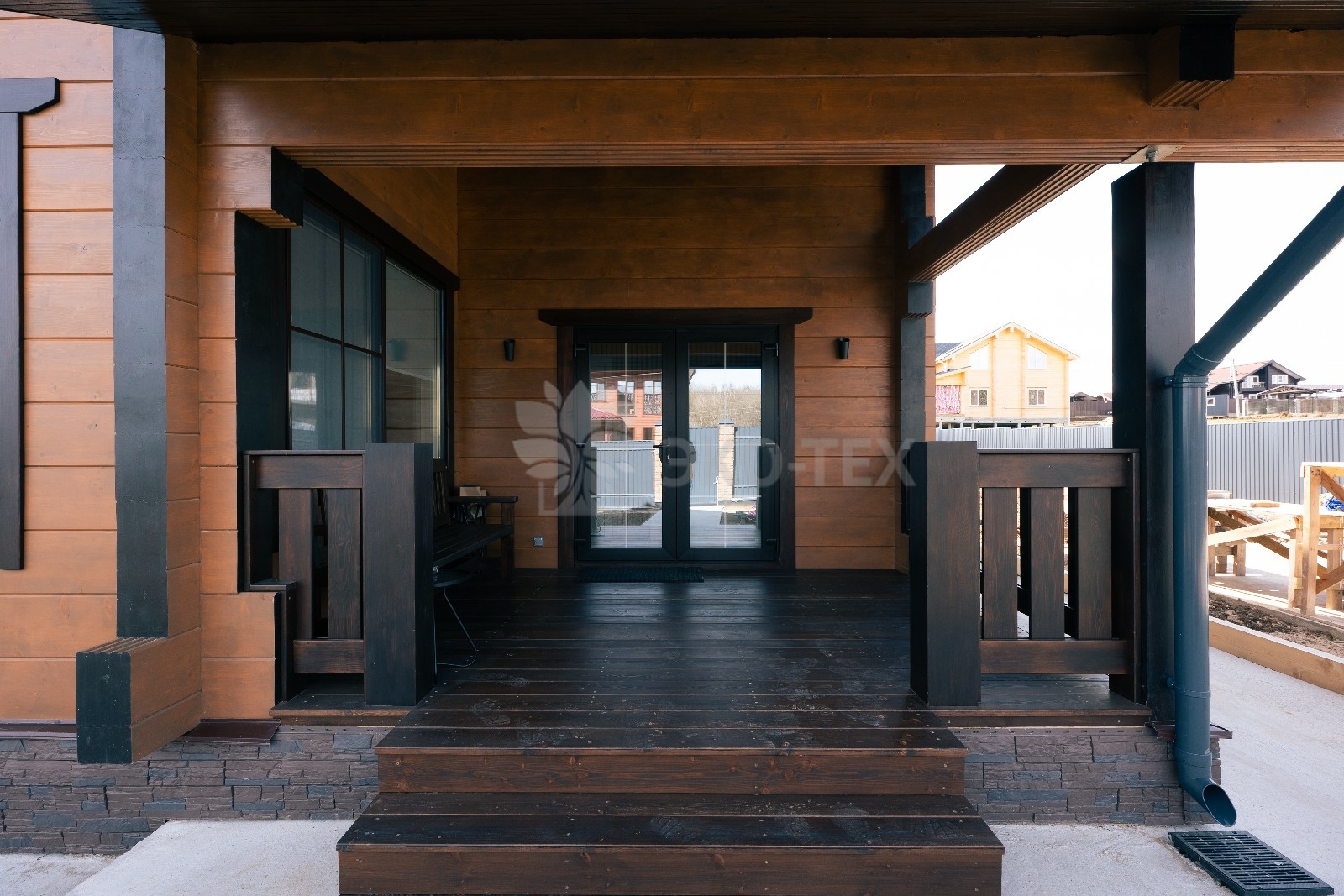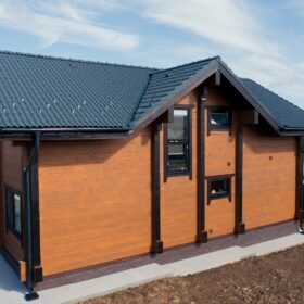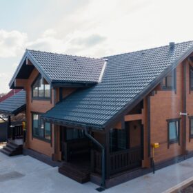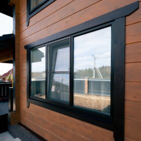 Фасад украшают окна с современными стеклопакетами, обеспечивающими надёжную тепло и шумоизоляцию. Стильная темно-коричневая отделка идеально сочетается с фасадом из натурального дерева.