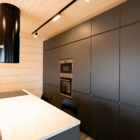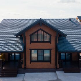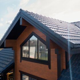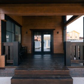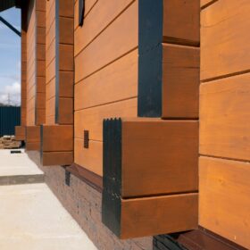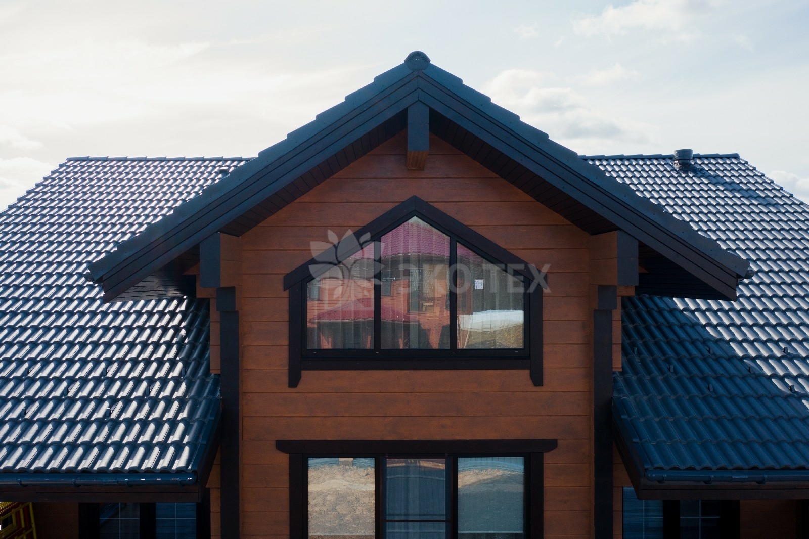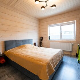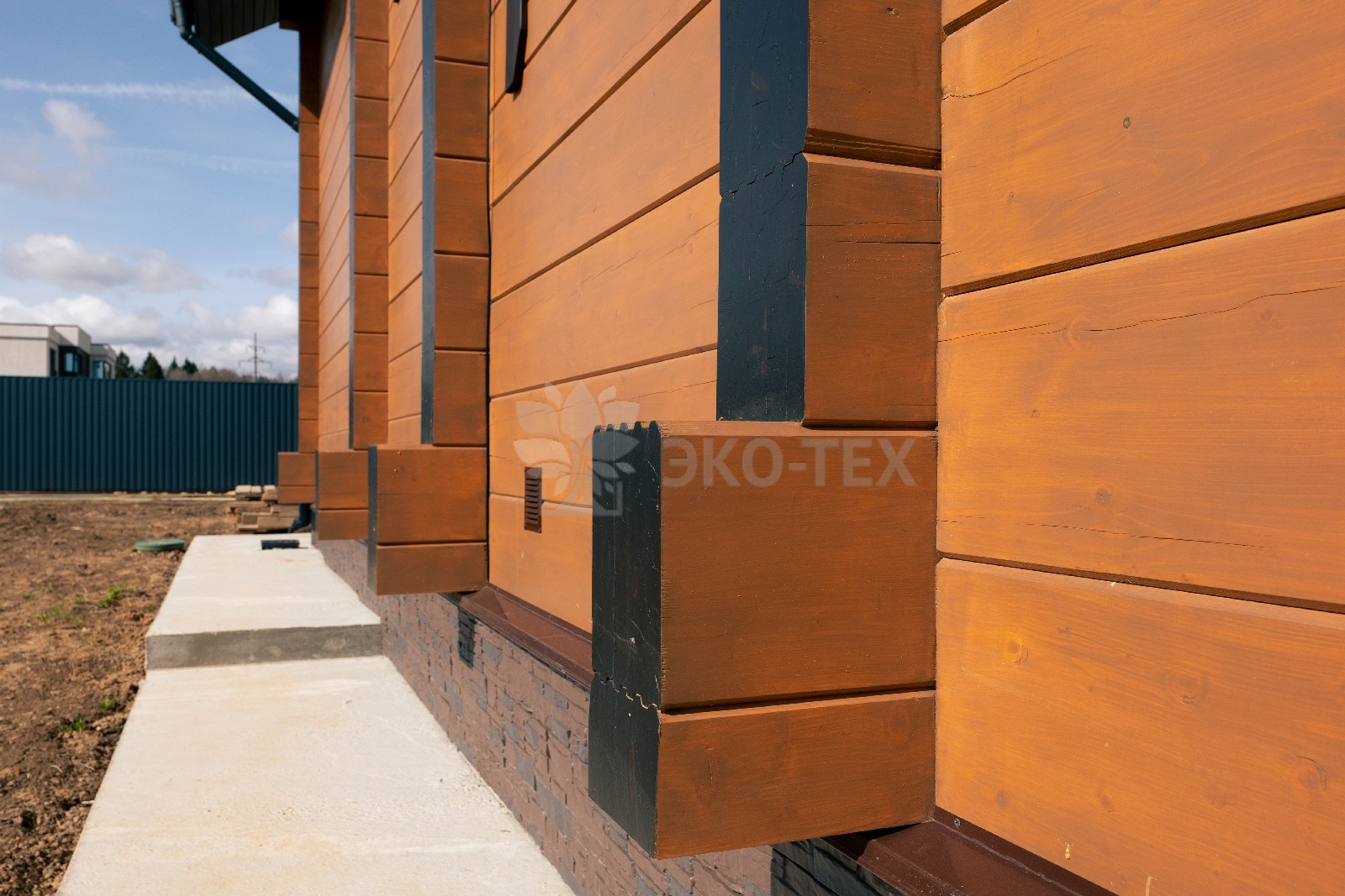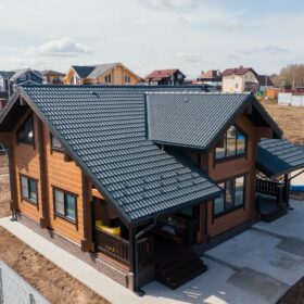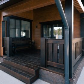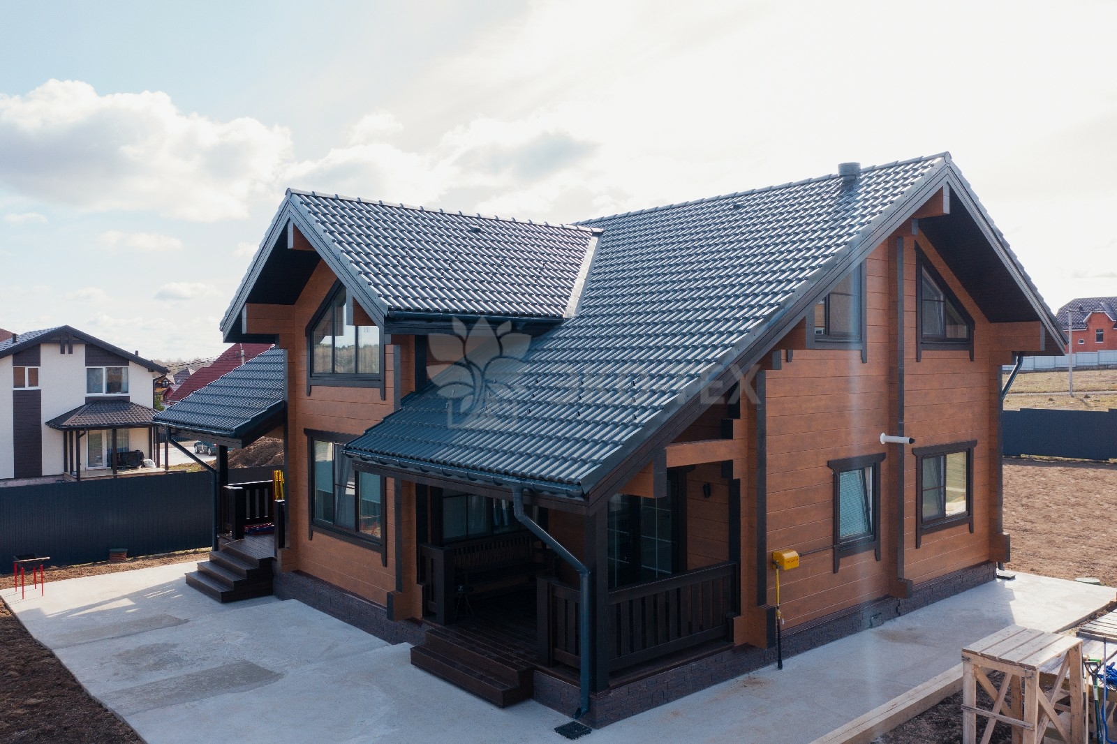 Фасад украшают окна с современными стеклопакетами, обеспечивающими надёжную тепло и шумоизоляцию. Стильная темно-коричневая отделка идеально сочетается с фасадом из натурального дерева.