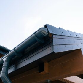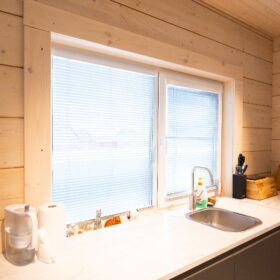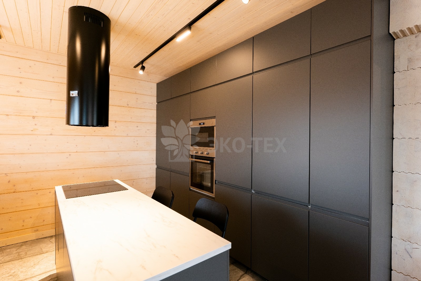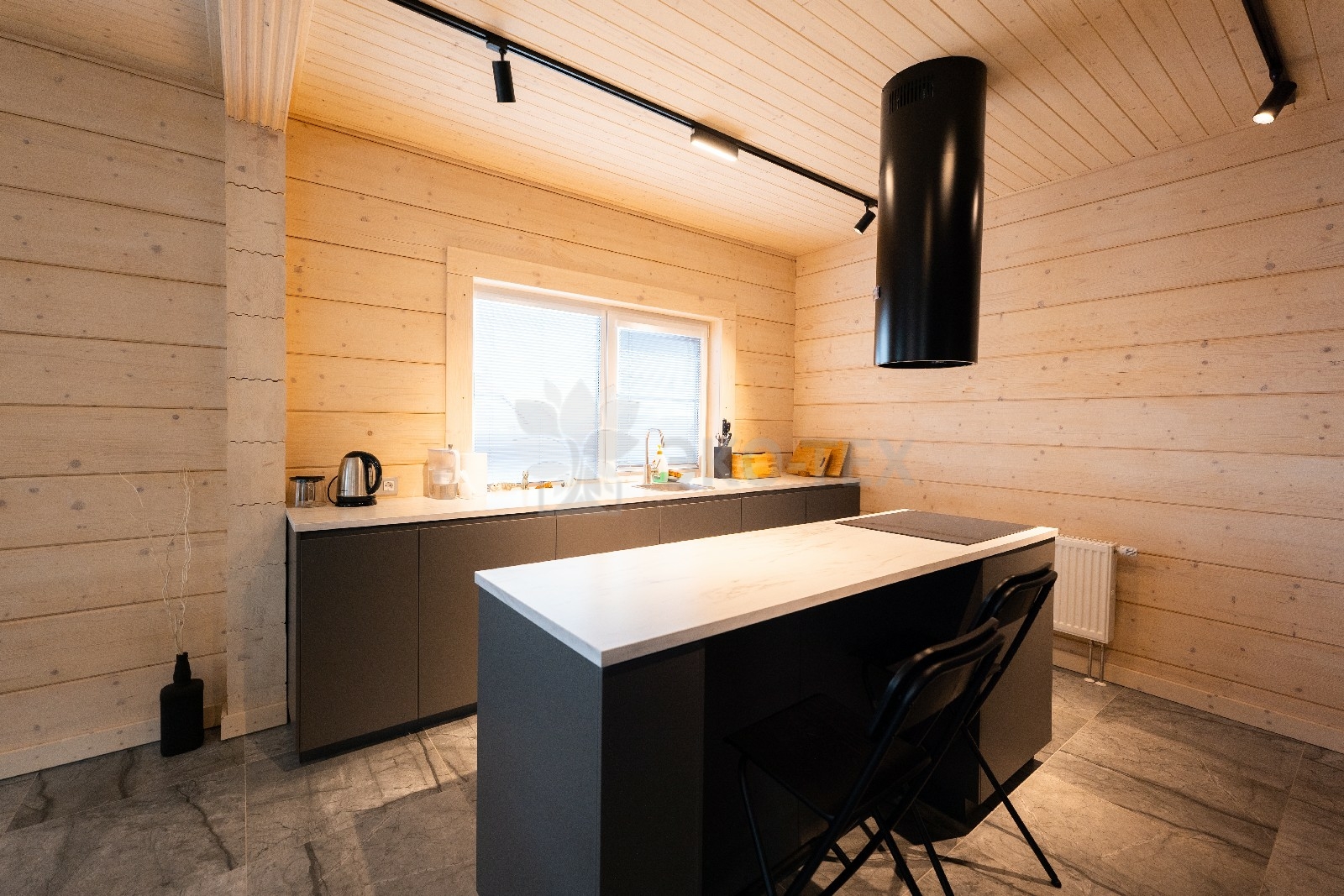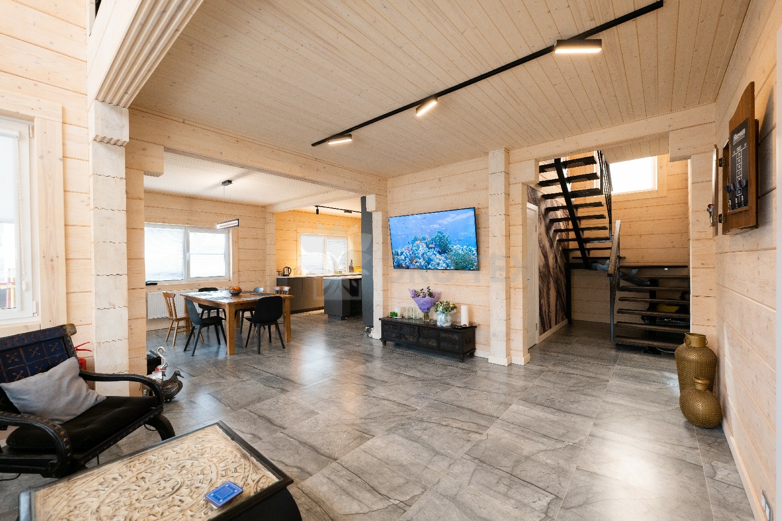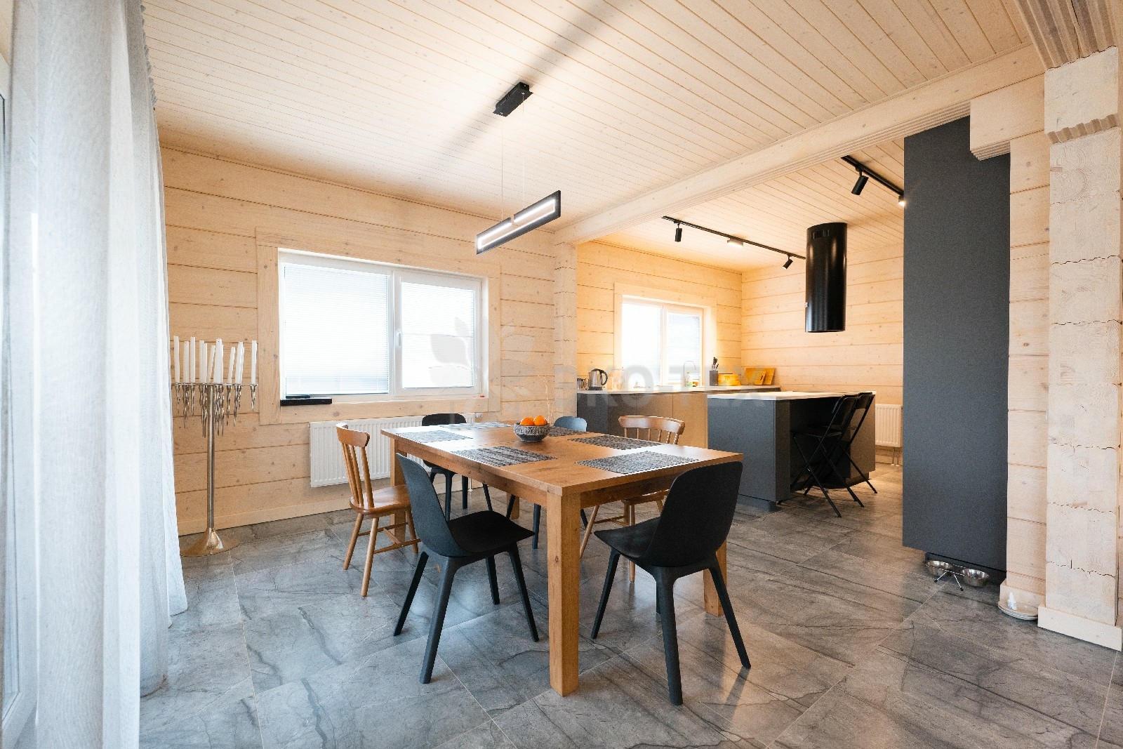 Фасад украшают окна с современными стеклопакетами, обеспечивающими надёжную тепло и шумоизоляцию. Стильная темно-коричневая отделка идеально сочетается с фасадом из натурального дерева.
