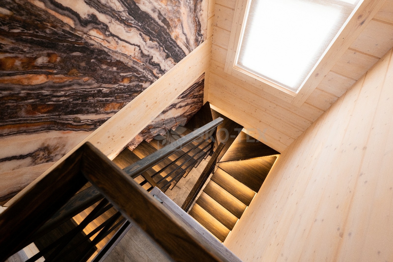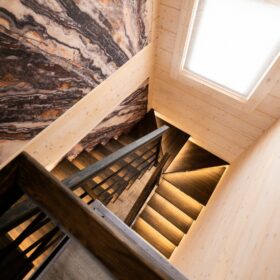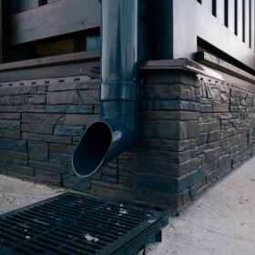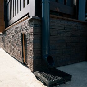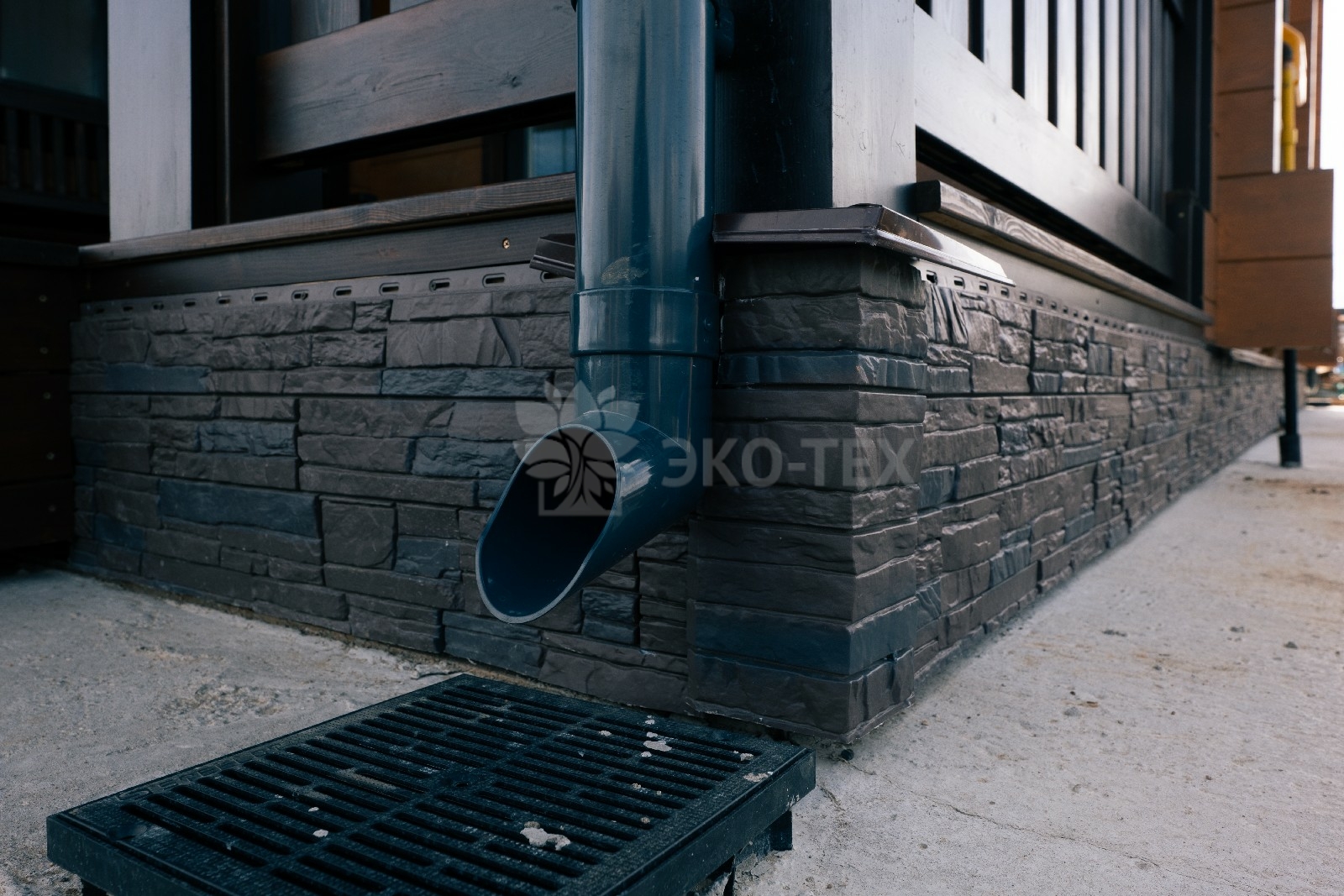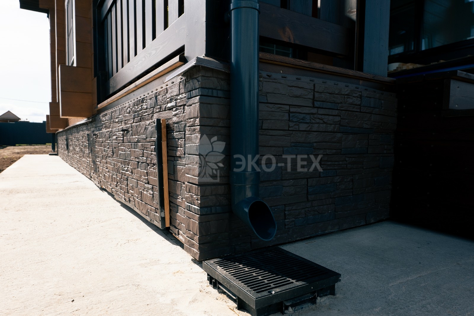 Высокий каменный фундамент обеспечивает надёжную гидроизоляцию и придаёт дому некоторую схожесть с альпийским шале.