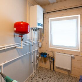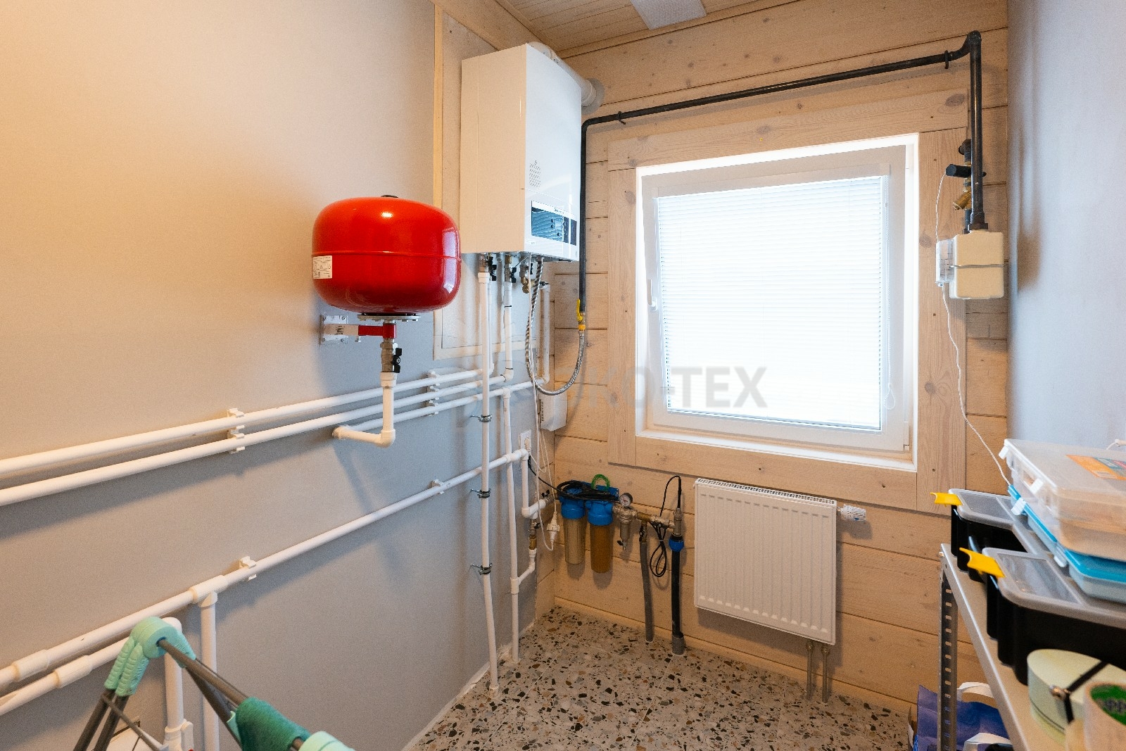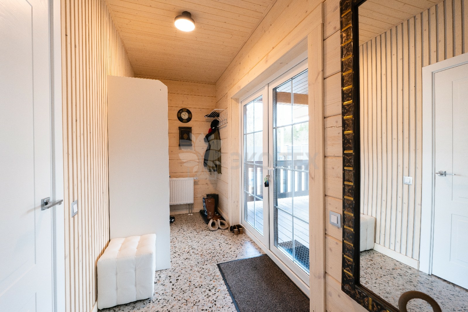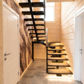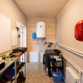 Прихожая в доме дополнена отдельной гардеробной, которая вплотную примыкает к техническому помещению, где расположена автономная котельная. Также, на первом этаже, имеется санузел, оснащенный современной сантехникой.