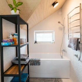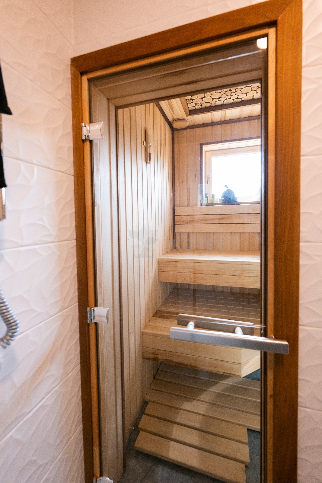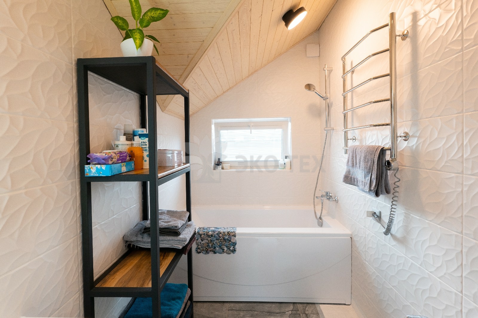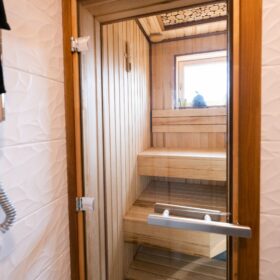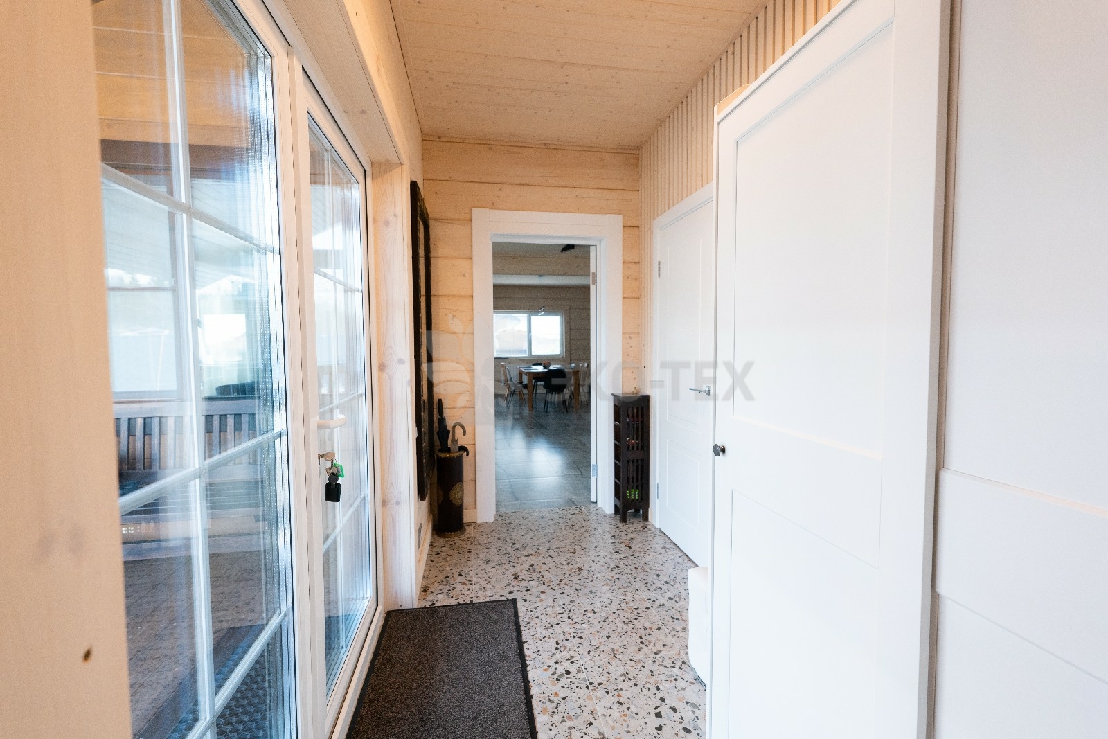 Прихожая в доме дополнена отдельной гардеробной, которая вплотную примыкает к техническому помещению, где расположена автономная котельная. Также, на первом этаже, имеется санузел, оснащенный современной сантехникой.