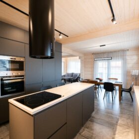 На первом этаже центральное место отведено просторной гостиной, которая, при помощи зонирования, отделена от кухни-столовой. Кухня-столовая имеет собственный выход на террасу.