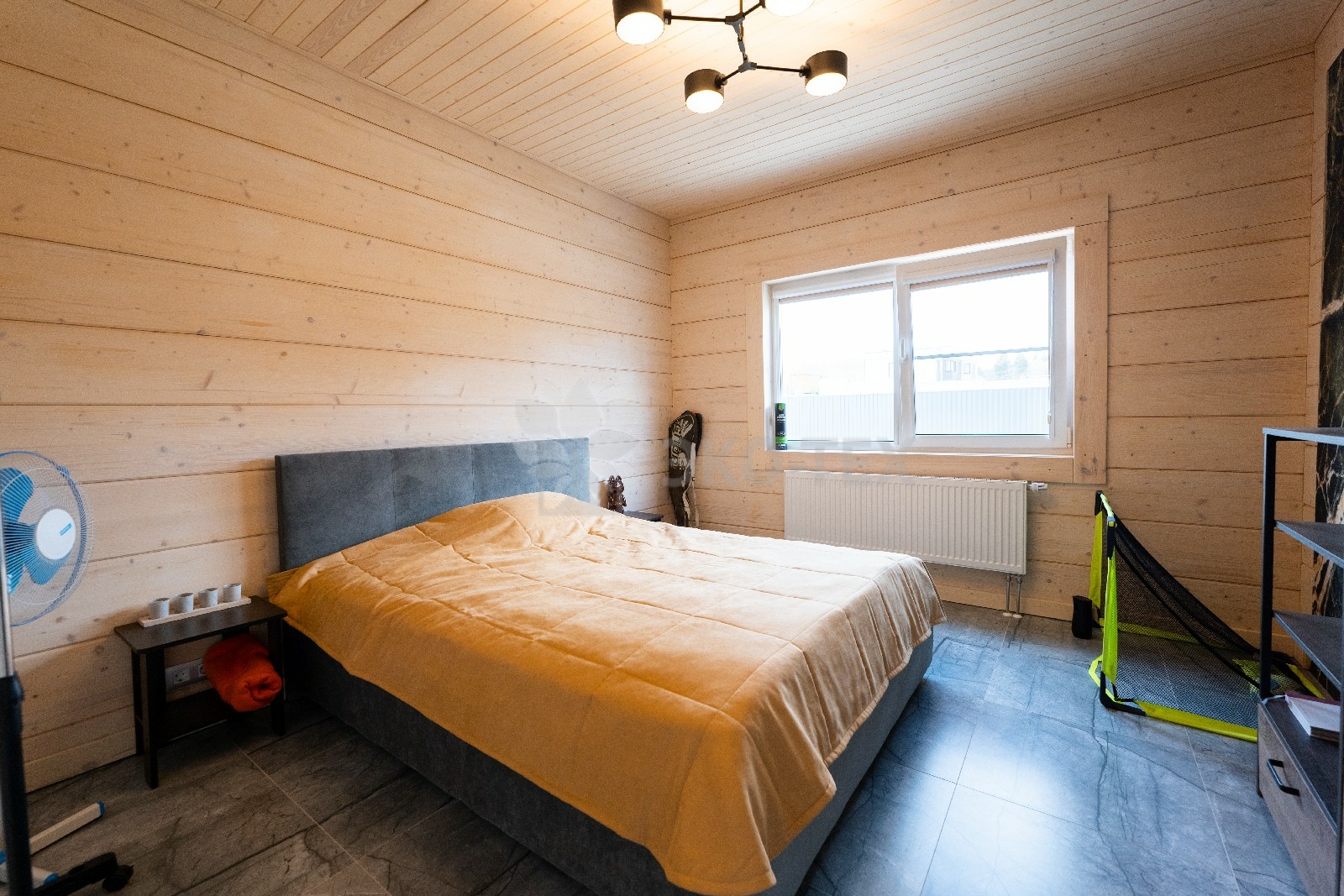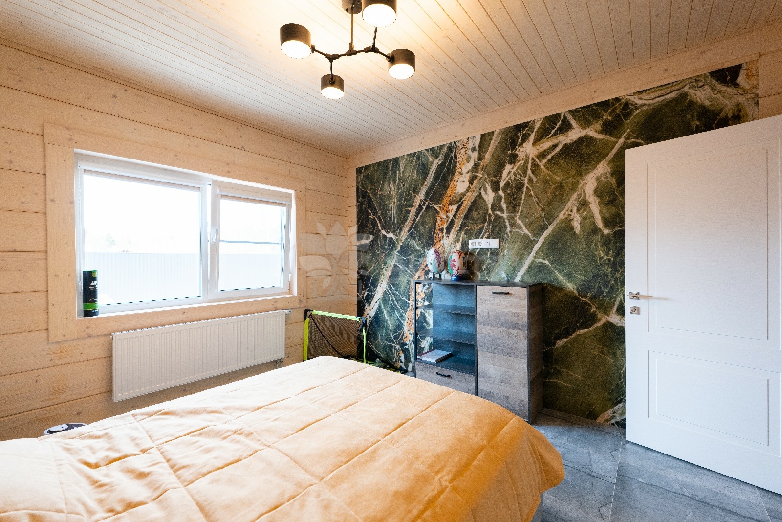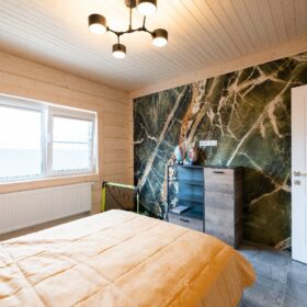 На второй этаж ведёт лестница, состоящая из двух маршей. На этаже расположены три спальни различной площади, в которых можно обустроить гостевые комнаты или комнаты для детей.