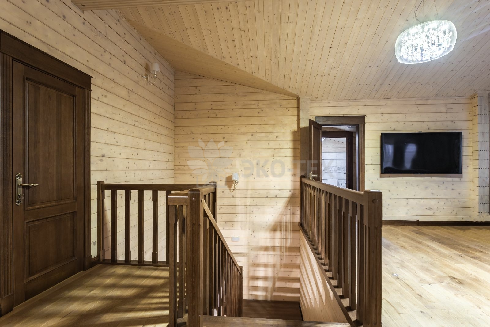 Клееный брус – материал с ровной поверхностью и красивым рисунком, поэтому внутри дома оставили естественный цвет дерева. Отметим, что к отделке дома из клееного бруса возможно приступить сразу же после сборки стен. Это важно для тех, кто хочет быстрее въехать в новый дом.