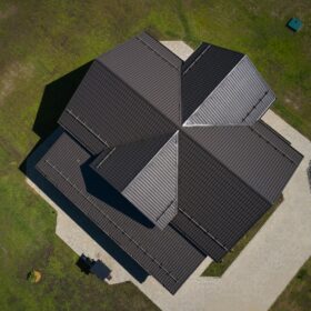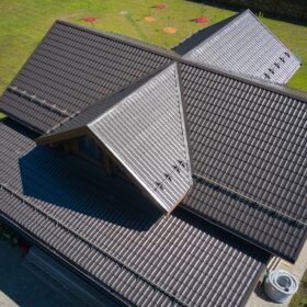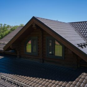 Крыша имеет сложную конфигурацию, поскольку дом обладает переменной этажностью. Современный кровельный материал, использованный нашими специалистами, не только надёжно защищают дом, но также обладает отличной шумоизоляцией, гарантирующей, что никакие ливни и ветра, не потревожат вас даже на верхнем этаже.