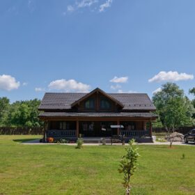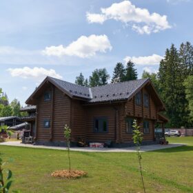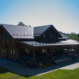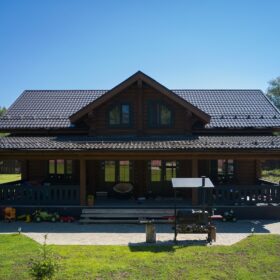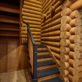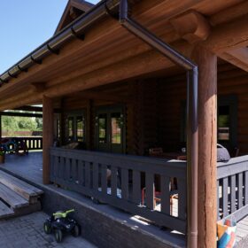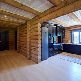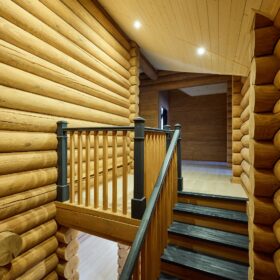 Оцилиндрованное бревно, из которого построен дом, образует естественную отделку неповторимой природной красоты. А колонны из брёвен прекрасно вписываются как во внешний, так и во внутренний облик дома.
