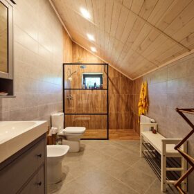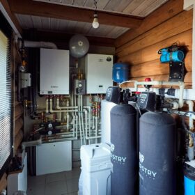 Входя в дом, мы попадаем в удобную прихожую, рядом с которой находится техническое помещение, в котором располагается котельное оборудование, а также система водоочистки и водоподготовки. Рядом находится санузел, оснащенный современной сантехникой.