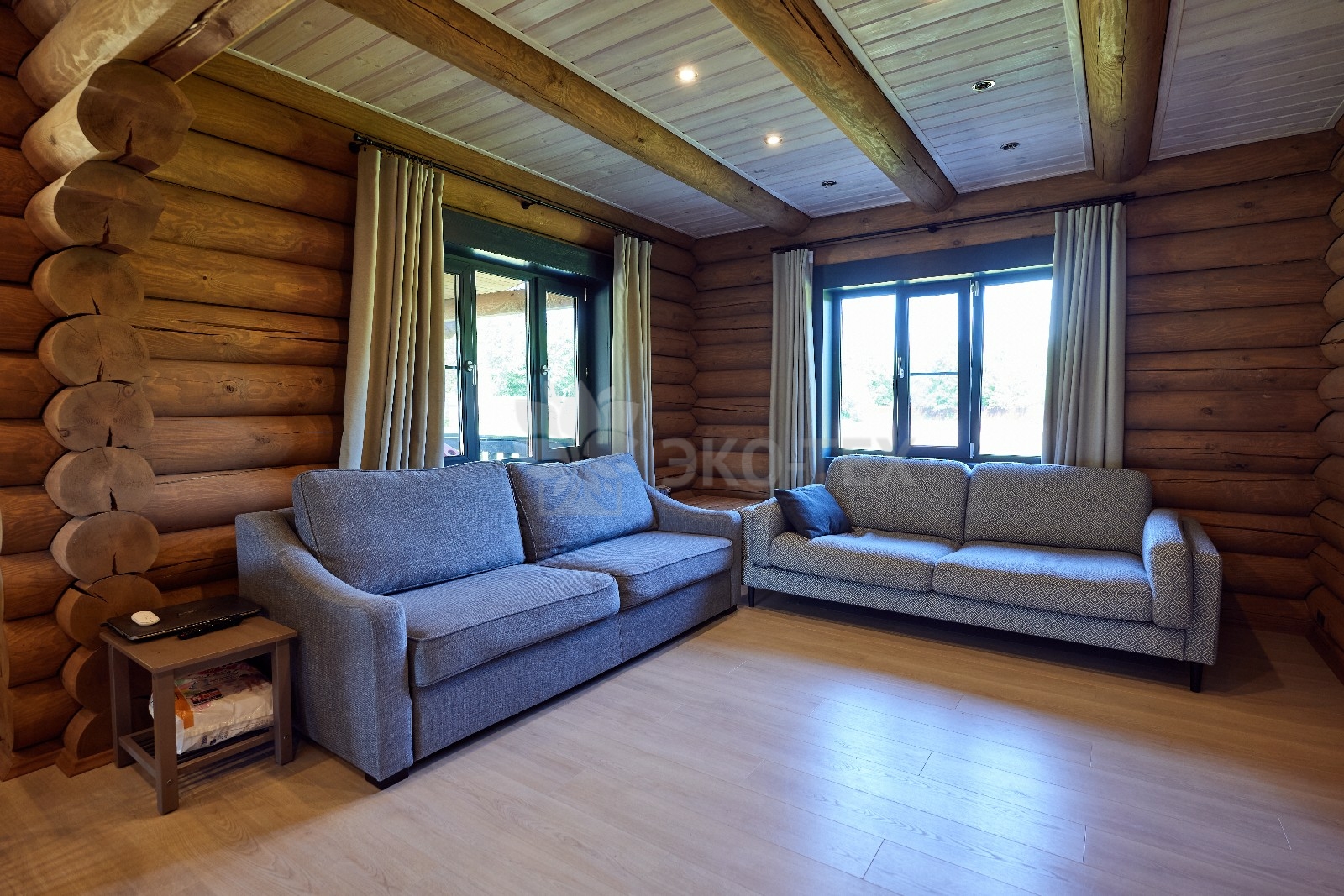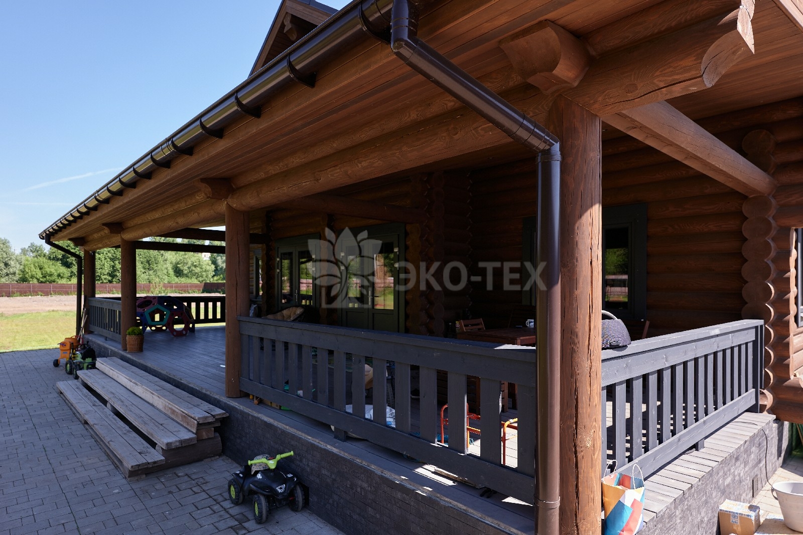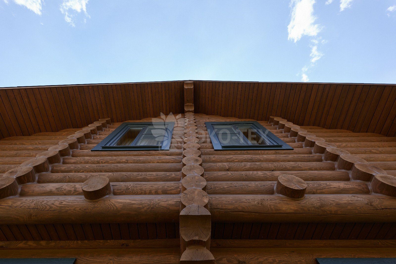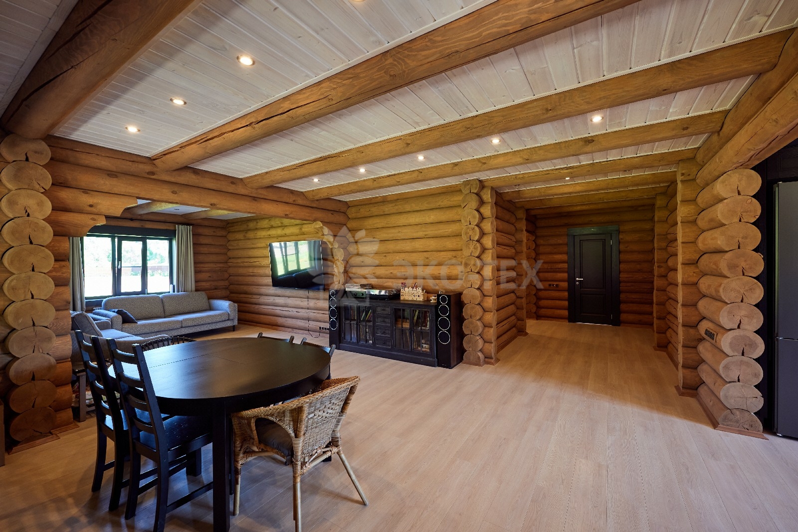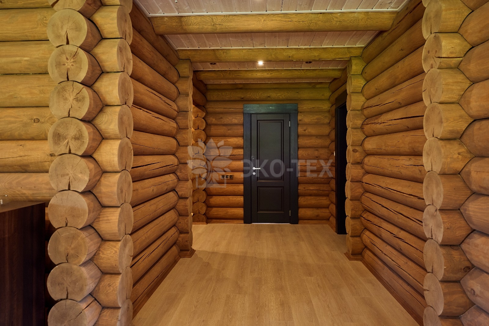 Оцилиндрованное бревно, из которого построен дом, образует естественную отделку неповторимой природной красоты. А колонны из брёвен прекрасно вписываются как во внешний, так и во внутренний облик дома.