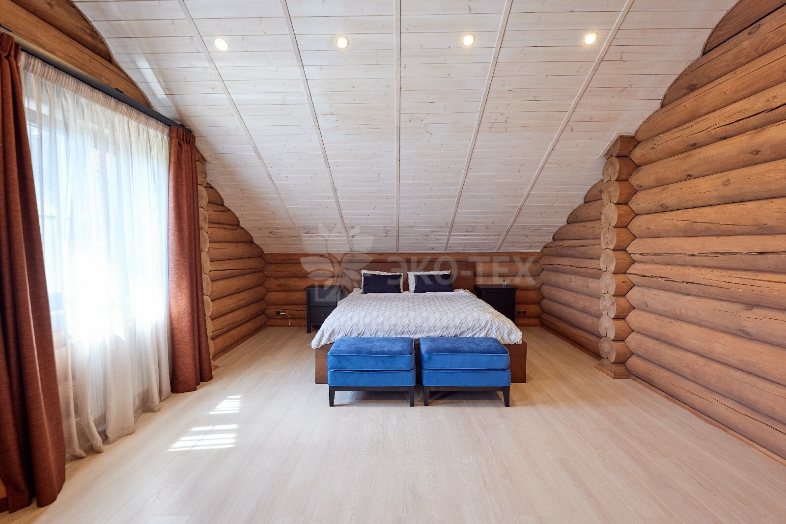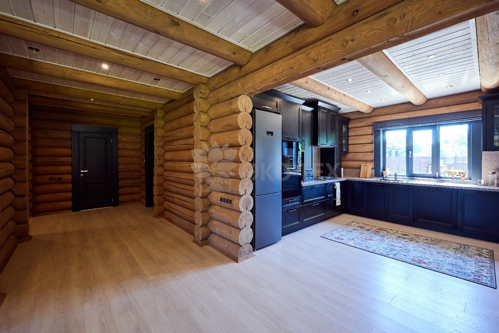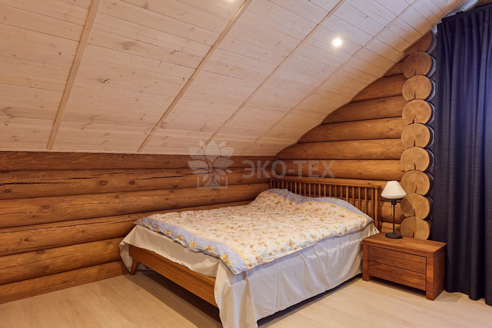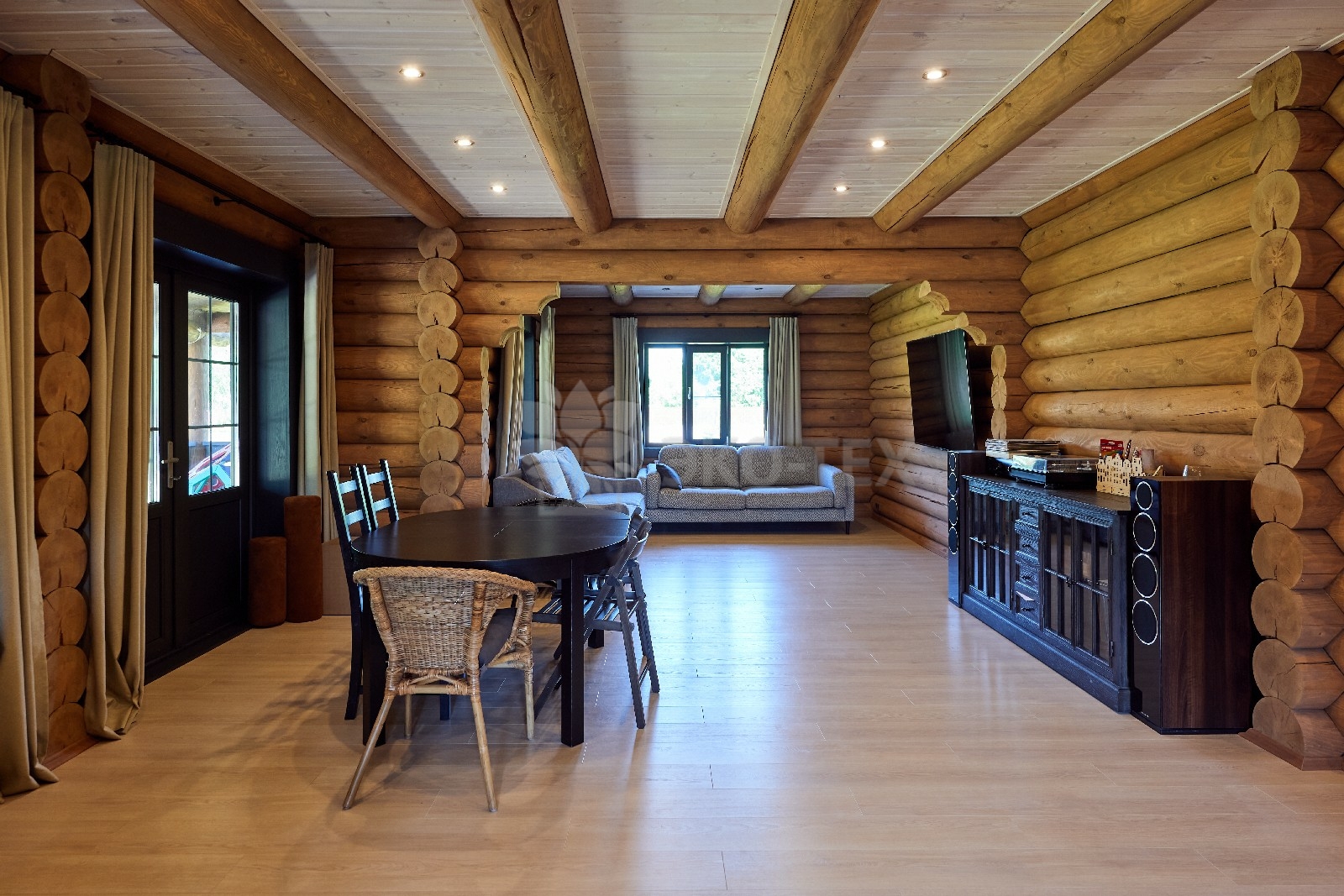 Оцилиндрованное бревно, из которого построен дом, образует естественную отделку неповторимой природной красоты. А колонны из брёвен прекрасно вписываются как во внешний, так и во внутренний облик дома.
