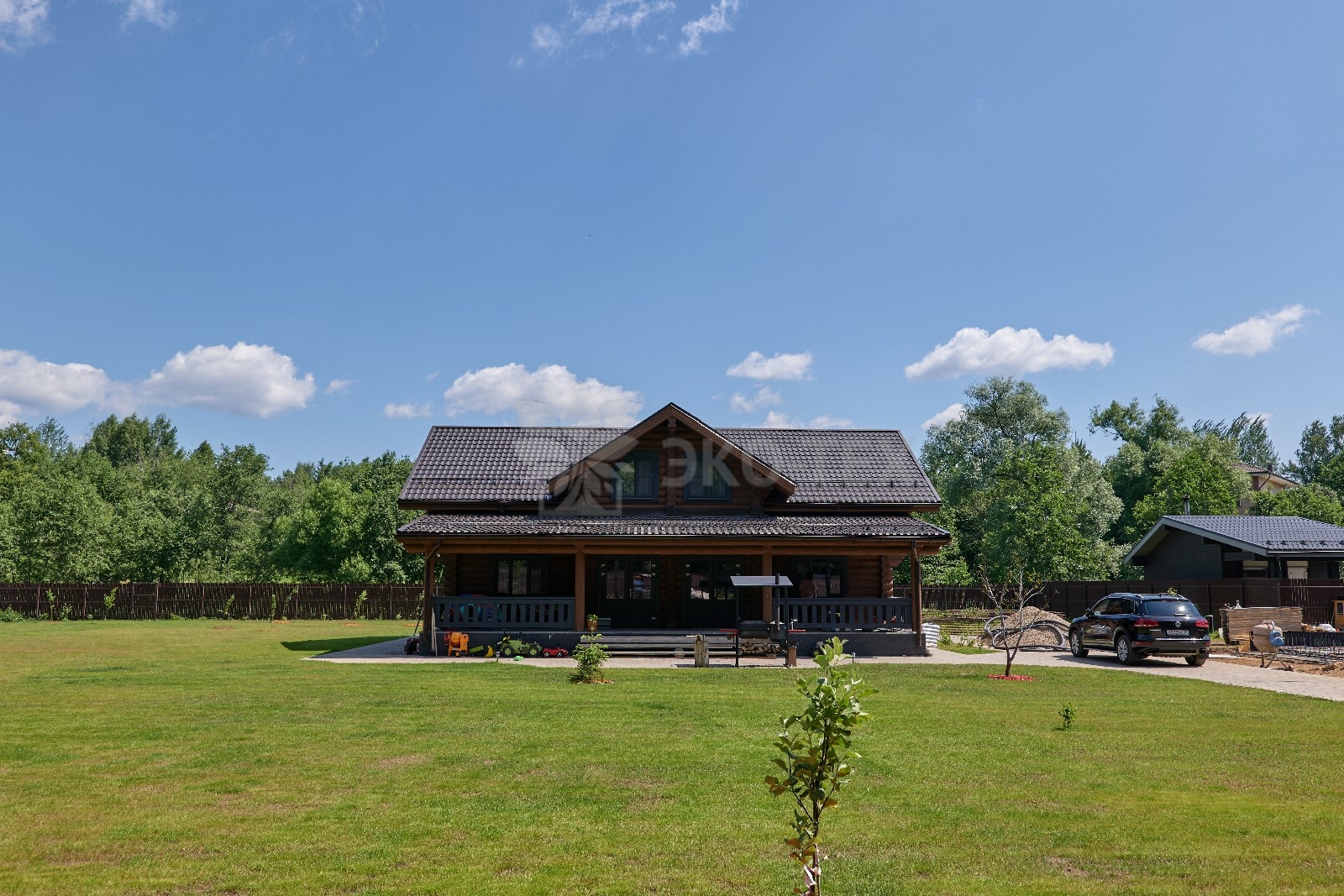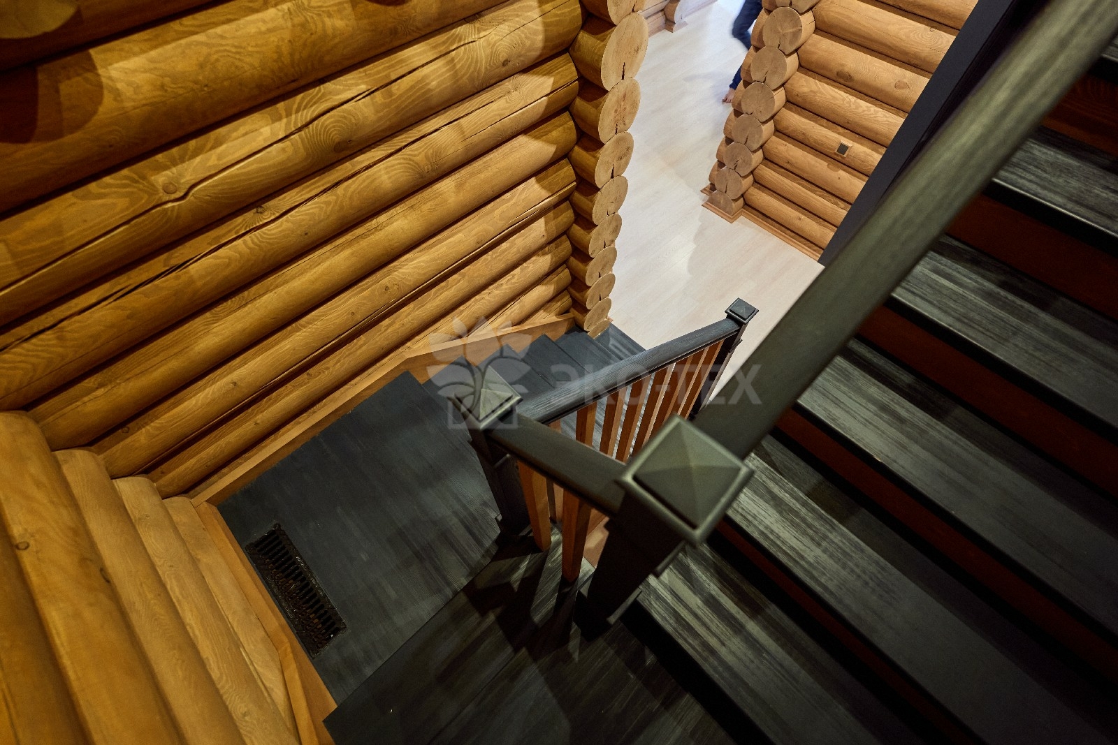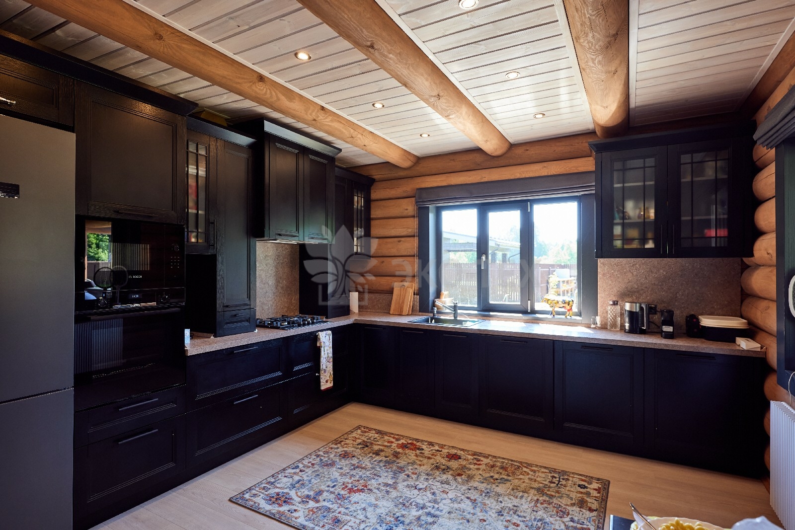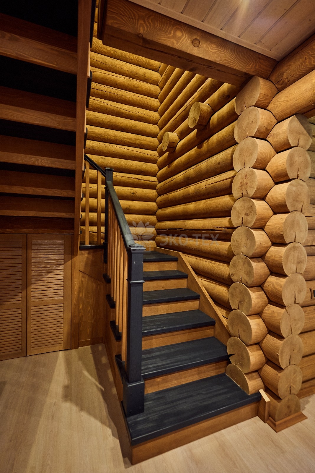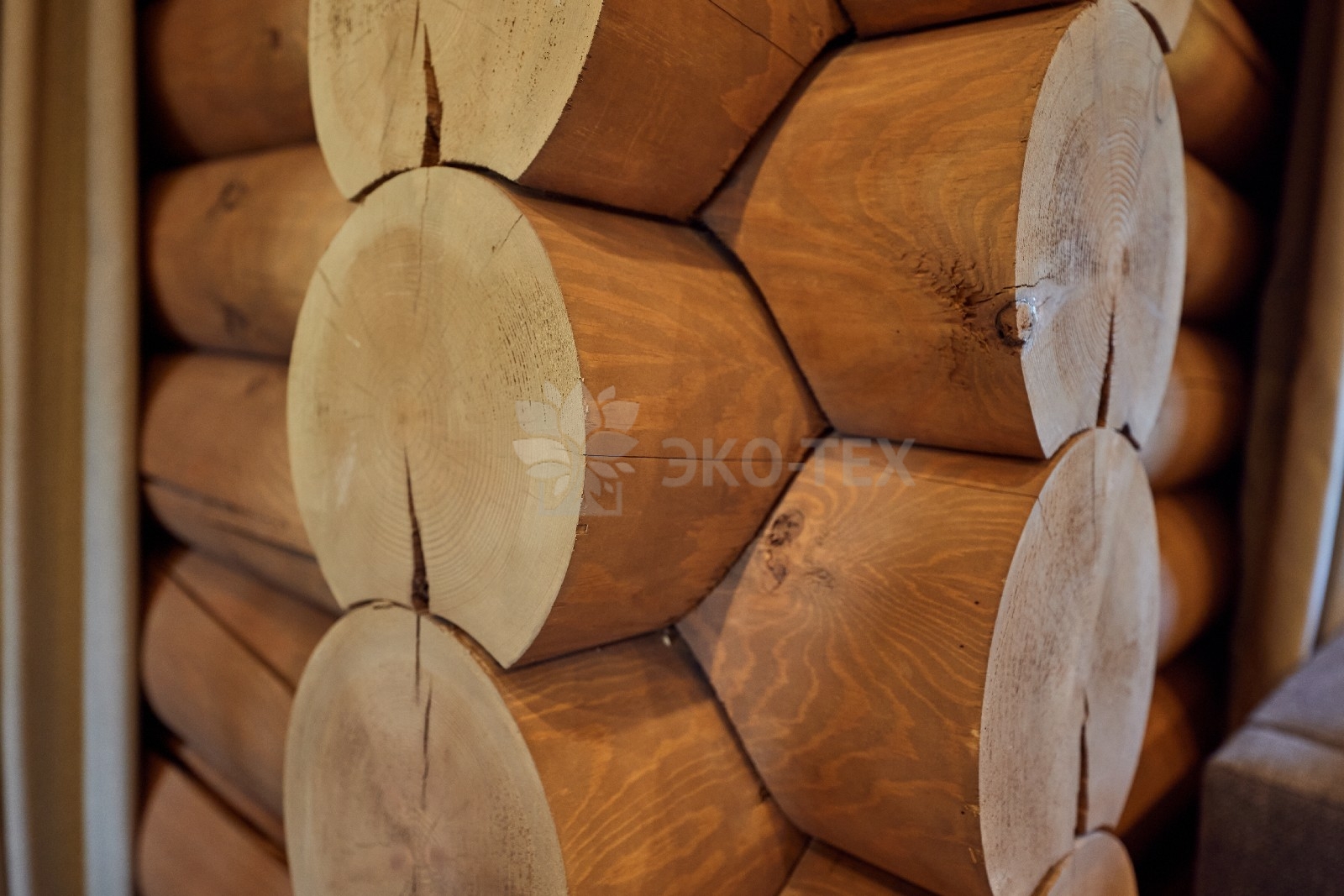 Оцилиндрованное бревно, из которого построен дом, образует естественную отделку неповторимой природной красоты. А колонны из брёвен прекрасно вписываются как во внешний, так и во внутренний облик дома.