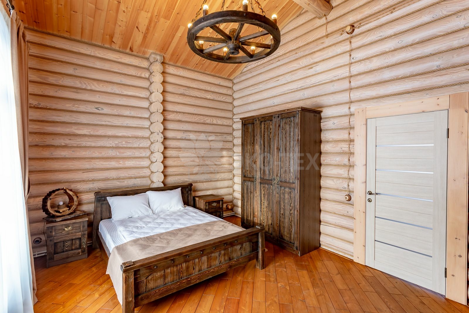 Во внутреннем оформлении отдано предпочтение предметам мебели из дерева. Исключение – кованые элементы кровати, туалетного столика, которые добавляют изящества интерьеру. Загородный дом станет семейным достоянием и предметом гордости.