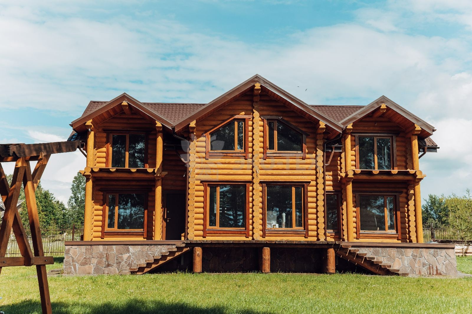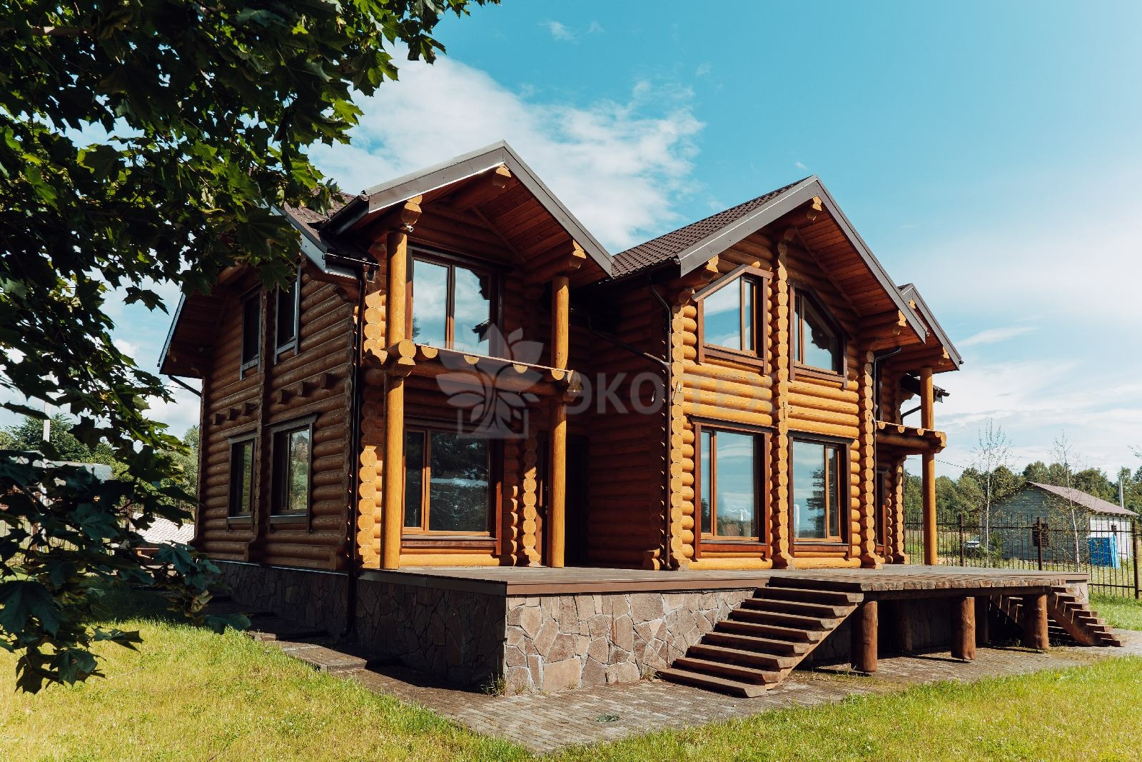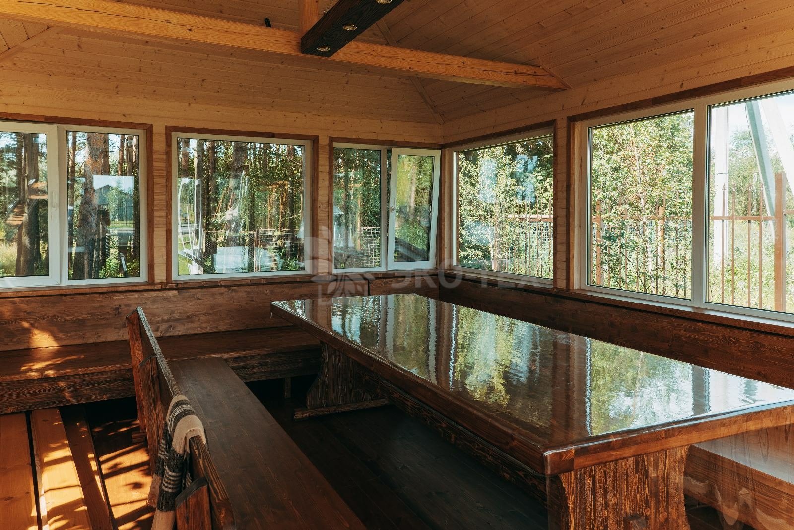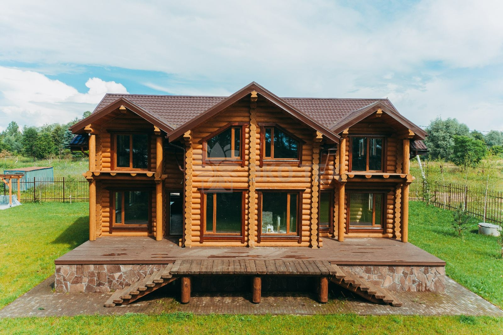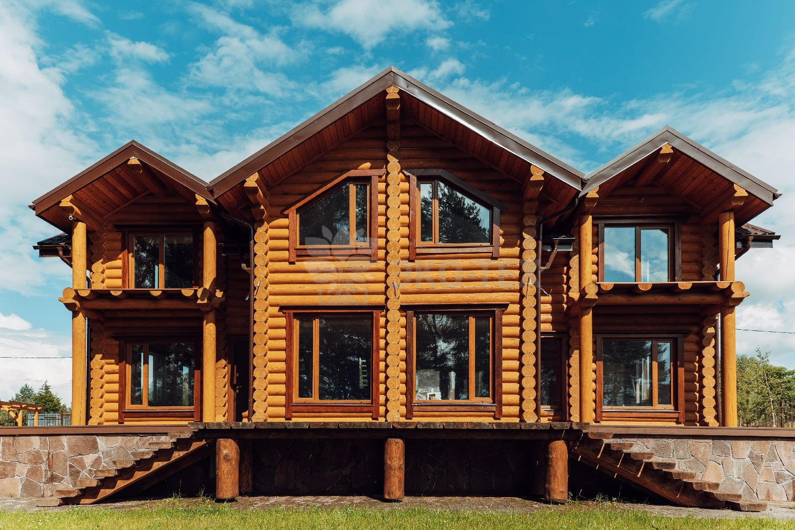 Удобное крыльцо — терраса защищено надежным навесом от любых капризов природы. Просторное двухэтажное здание, главный фасад которого украшен роскошными панорамными окнами, образующие единую композицию выполнено из оцилиндрованного бревна.