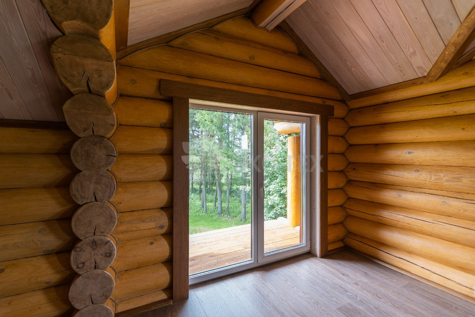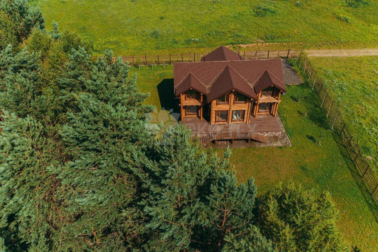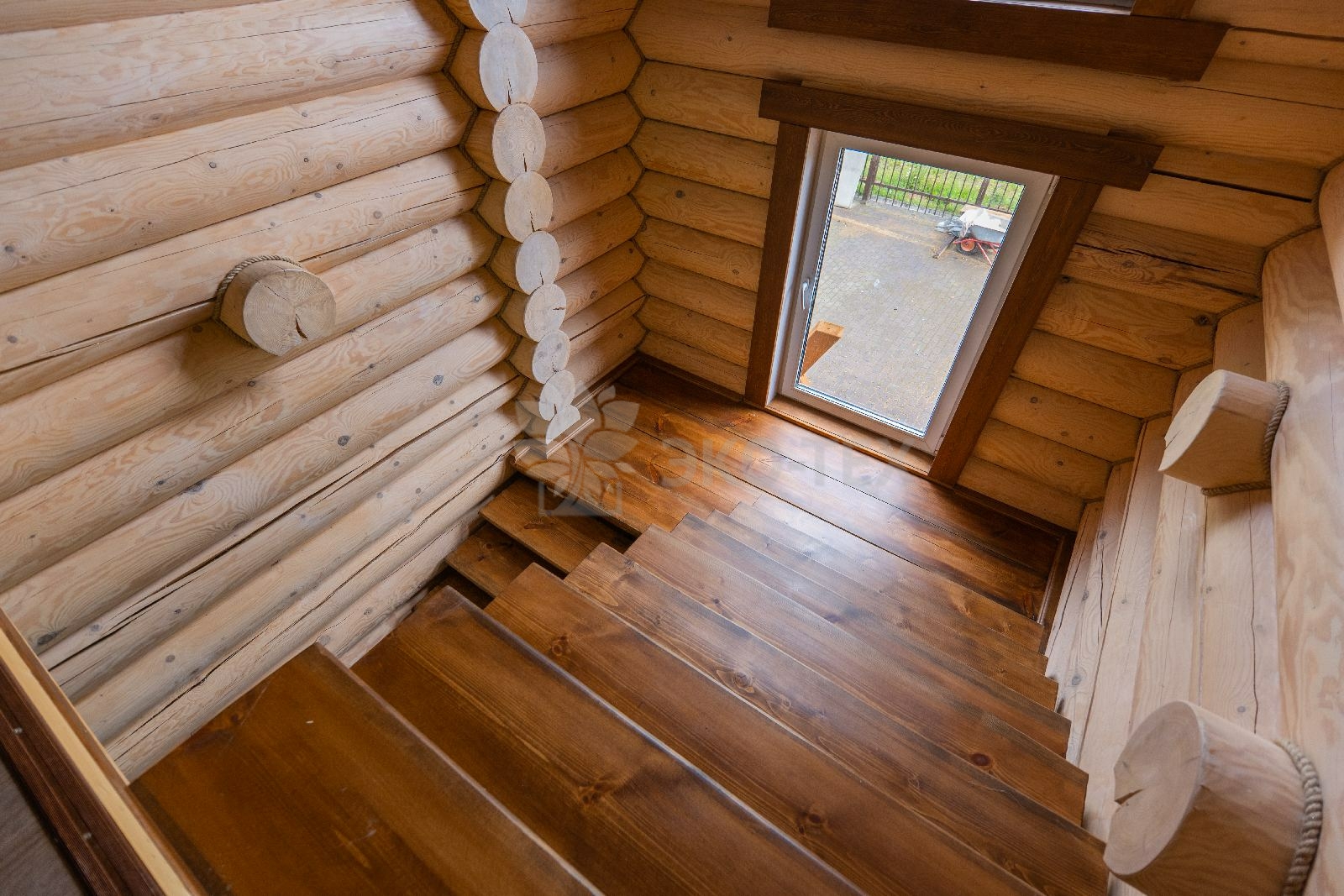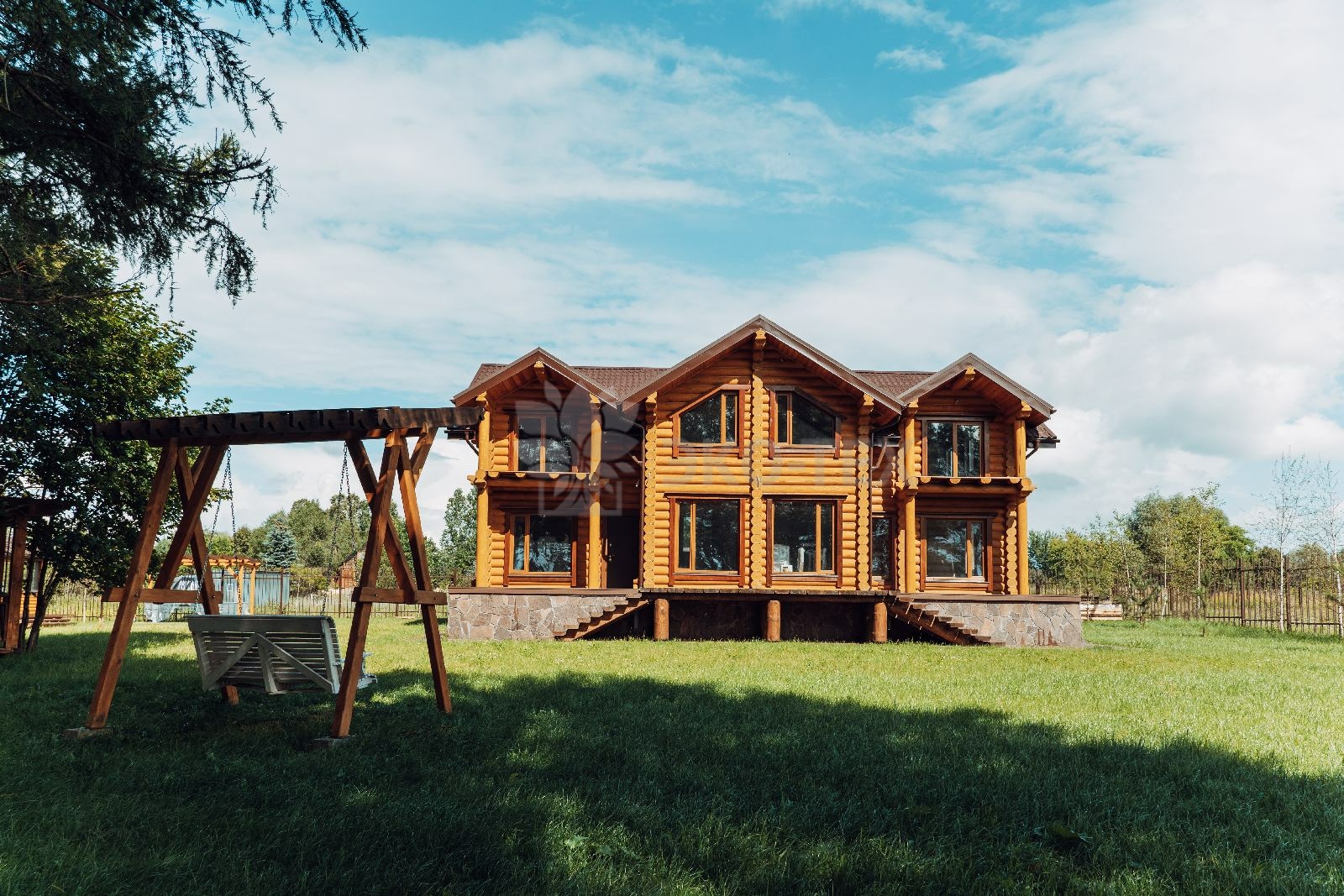 Удобное крыльцо — терраса защищено надежным навесом от любых капризов природы. Просторное двухэтажное здание, главный фасад которого украшен роскошными панорамными окнами, образующие единую композицию выполнено из оцилиндрованного бревна.